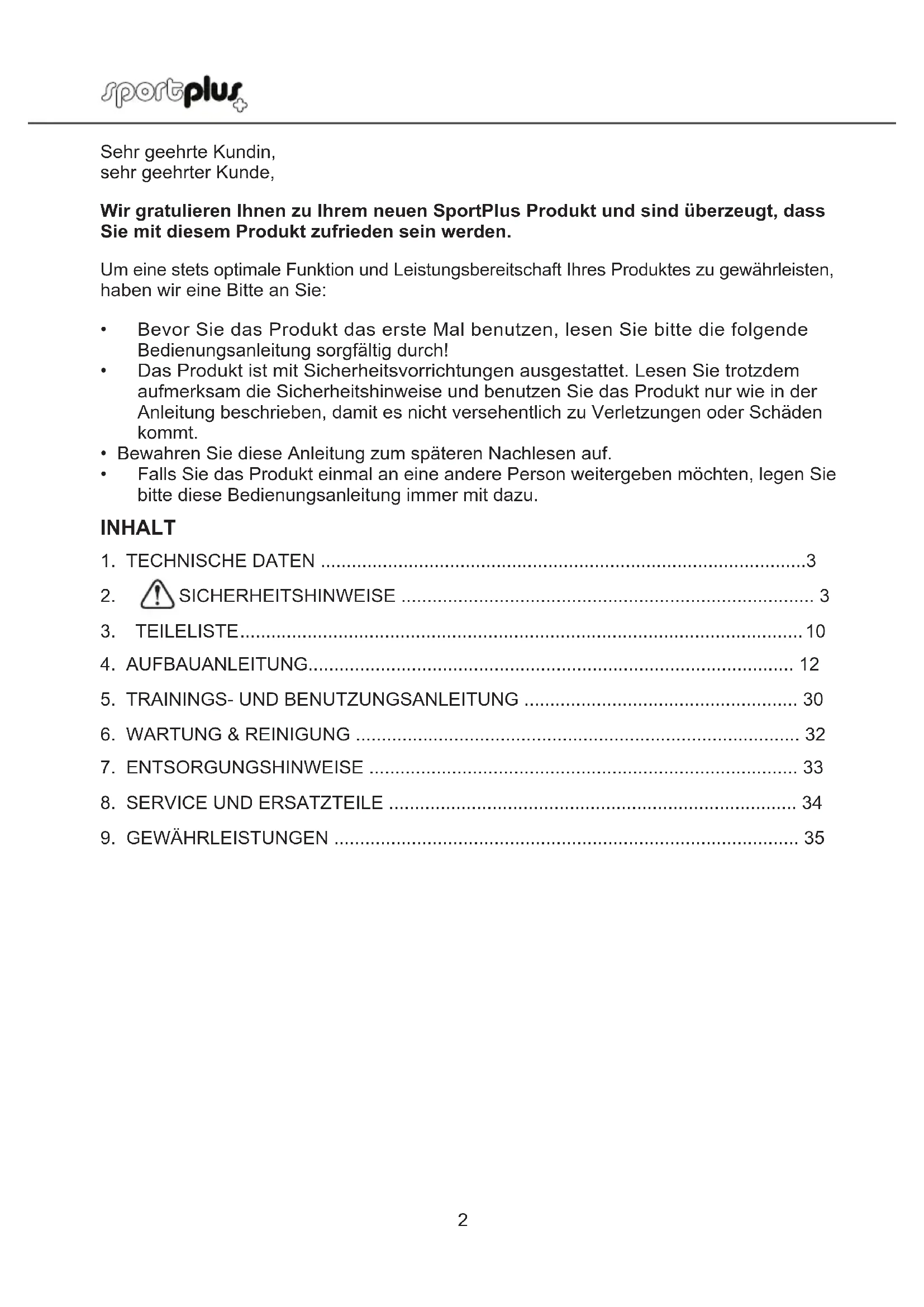 SportPlus versichert, dass das Produkt, auf das sich die Gewährleistung bezieht, aus qualitativ hochwertigen Materialien hergestellt und mit äußerster Sorgfalt überprüft wurde. Sollten sich dennoch bei normaler Verwendung und Wartung innerhalb der hiernach genannten Gewährleistungsfrist Defekte ergeben, wenden Sie sich bitte an unser Service- Team. Voraussetzung für die Gewährleistung ist die Bedienung und der ordentliche Aufbau gemäß Bedienungsanleitung. Durch unsachgemäße Nutzung und / oder unsachgemäßen Transport kann die Gewährleistung entfallen. Die Gewährleistungsfrist, beginnend mit dem Kaufdatum, beträgt 2 Jahre. Sollte das von Ihnen erworbene Produkt nicht fehlerfrei sein, wenden Sie sich bitte innerhalb der Frist von 24 Monaten ab Kaufdatum an unseren Kundendienst. Von der Gewährleistung ausgenommen sind: