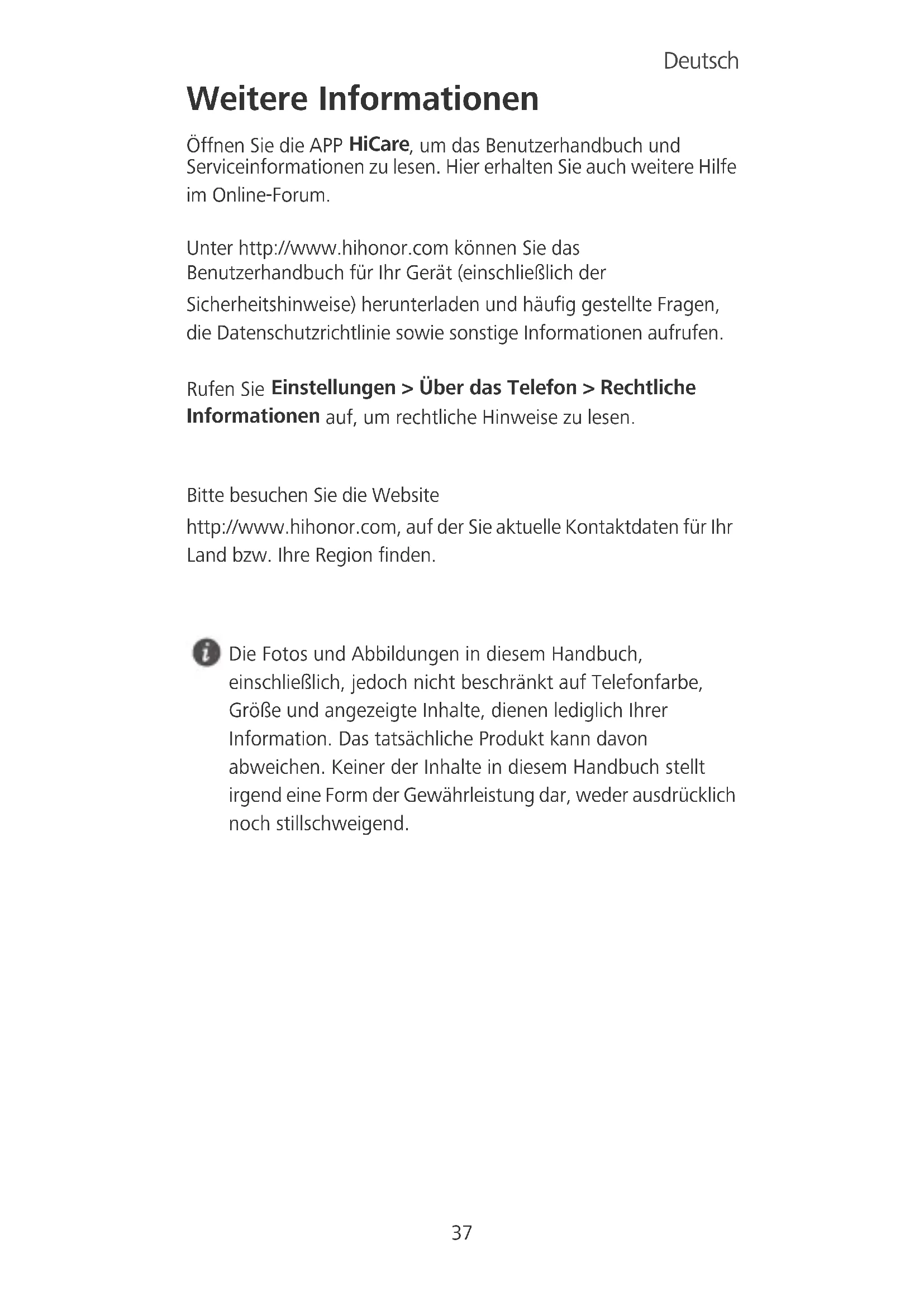 http://www.hihonor.com, auf der Sie aktuelle Kontaktdaten für Ihr Land bzw. Ihre Region finden. Die Fotos und Abbildungen in diesem Handbuch, einschließlich, jedoch nicht beschränkt auf Telefonfarbe, Größe und angezeigte Inhalte, dienen lediglich Ihrer Information. Das tatsächliche Produkt kann davon abweichen. Keiner der Inhalte in diesem Handbuch stellt irgend eine Form der Gewährleistung dar, weder ausdrücklich noch stillschweigend. Deutsch38 Ihr Telefon auf einen Blick Werfen wir einen Blick auf Ihr neues Telefon, bevor Sie beginnen. Halten Sie die Netztaste gedrückt, um Ihr Telefon ein- oder auszuschalten. Um einen Neustart des Telefons zu erzwingen, halten Sie die Netztaste gedrückt, bis das Telefon vibriert. GeräuschunterdrückungsmikrofonHeadset-Buchse Kamera Blitz Statusanzeige Kopfhörer microUSB-Port Mikrofon Lautsprecher Frontkamera Lautstärke- taste Betriebstaste Fingerabdruck- Scanner LichtsensormicroSD Nano-SIM Nano-SIM Nano-SIM UJKX