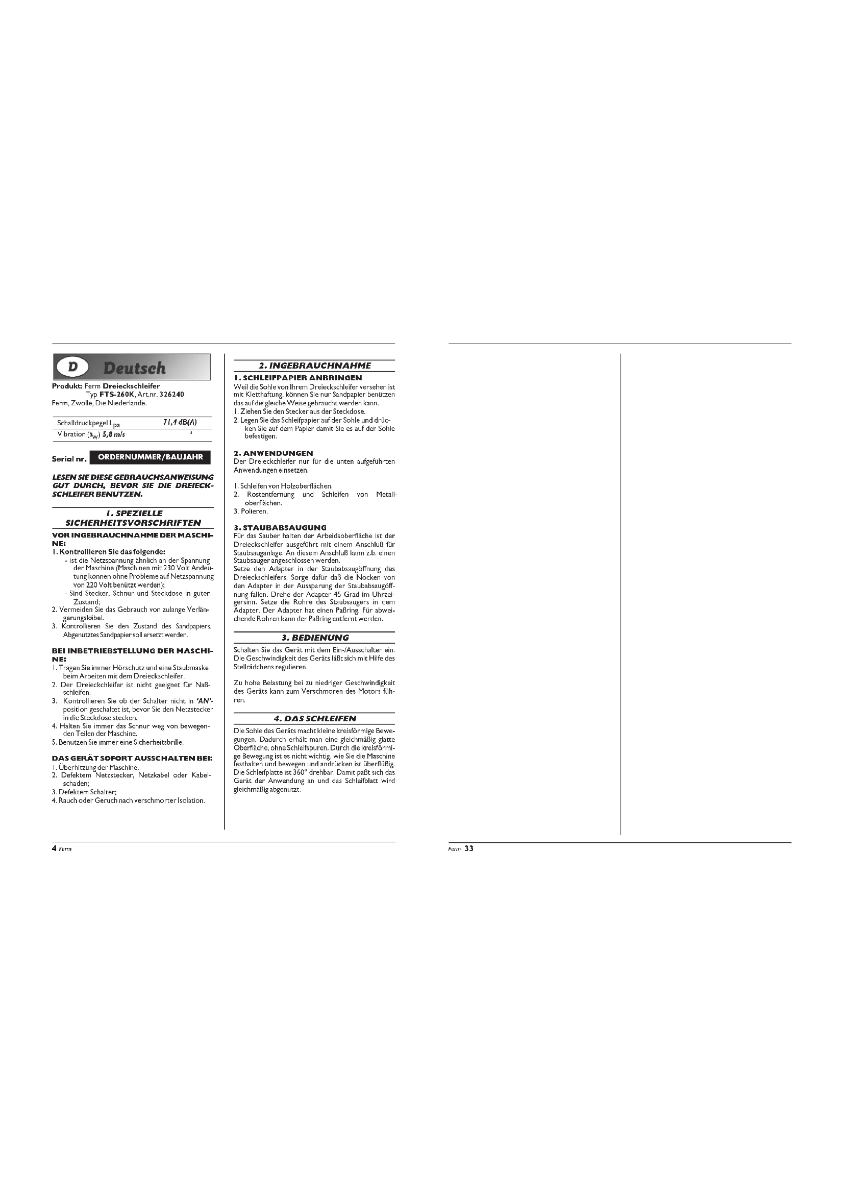 Die Sohle des Geräts macht kleine kreisförmige Bewe- gungen. Dadurch erhält man eine gleichmäßig glatte Oberfläche, ohne Schleifspuren. Durch die kreisförmi- ge Bewegung ist es nicht wichtig, wie Sie die Maschine festhalten und bewegen und andrücken ist überflüßig. Die Schleifplatte ist 360° drehbar. Damit paßt sich das Gerät der Anwendung an und das Schleifblatt wird gleichmäßig abgenutzt. ORDERNUMMER/BAUJAHR 4 Ferm32 Ferm