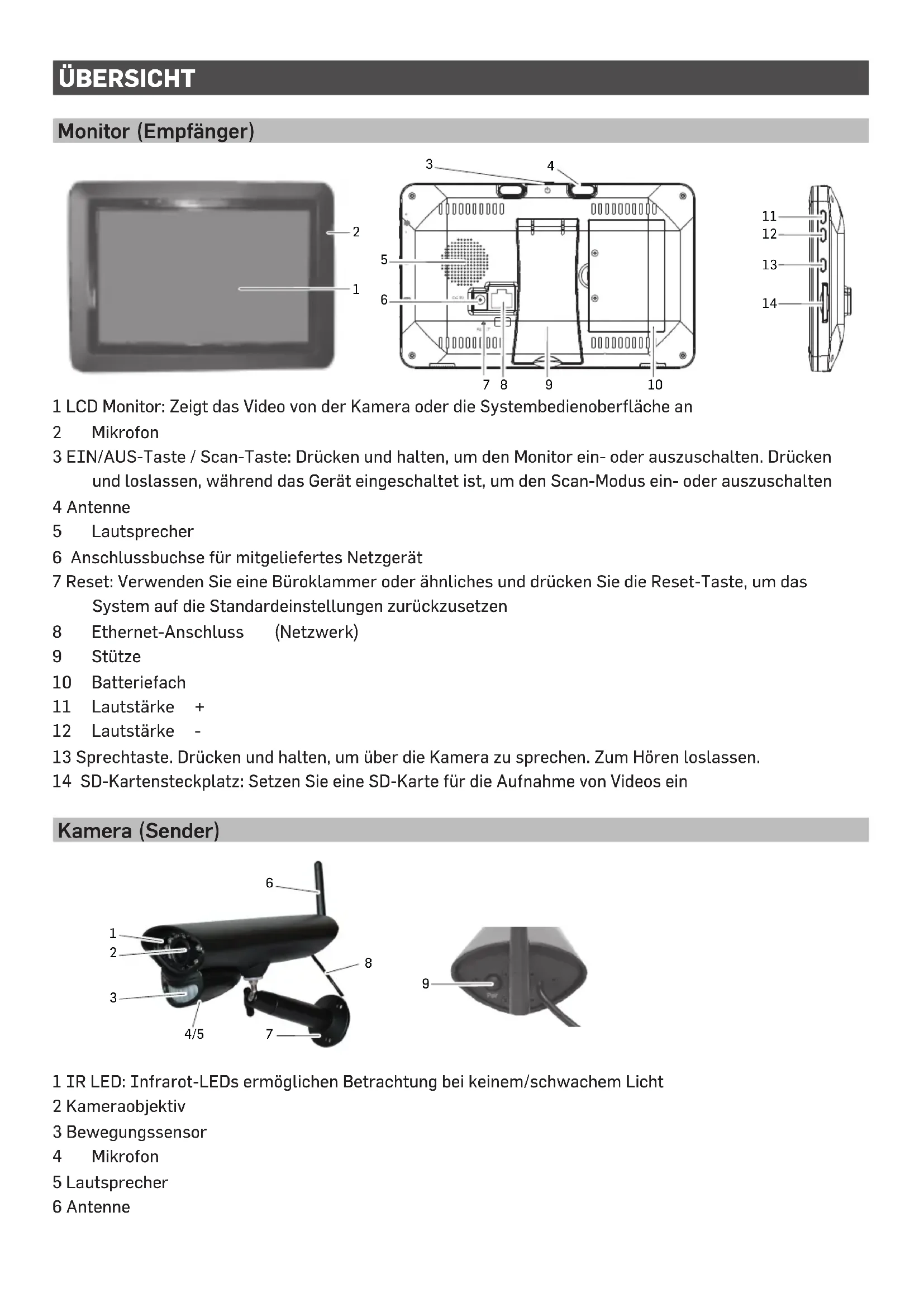 Monitor (Empfänger) 1 LCD Monitor: Zeigt das Video von der Kamera oder die Systembedienoberfläche an 2 Mikrofon 3 EIN/AUS-Taste / Scan-Taste: Drücken und halten, um den Monitor ein- oder auszuschalten. Drücken und loslassen, während das Gerät eingeschaltet ist, um den Scan-Modus ein- oder auszuschalten 4 Antenne 5 Lautsprecher 6 Anschlussbuchse für mitgeliefertes Netzgerät 7 Reset: Verwenden Sie eine Büroklammer oder ähnliches und drücken Sie die Reset-Taste, um das System auf die Standardeinstellungen zurückzusetzen 8 Ethernet-Anschluss (Netzwerk) 9 Stütze 10 Batteriefach 11 Lautstärke + 12 Lautstärke - 13 Sprechtaste. Drücken und halten, um über die Kamera zu sprechen. Zum Hören loslassen. 14 SD-Kartensteckplatz: Setzen Sie eine SD-Karte für die Aufnahme von Videos ein Kamera (Sender)