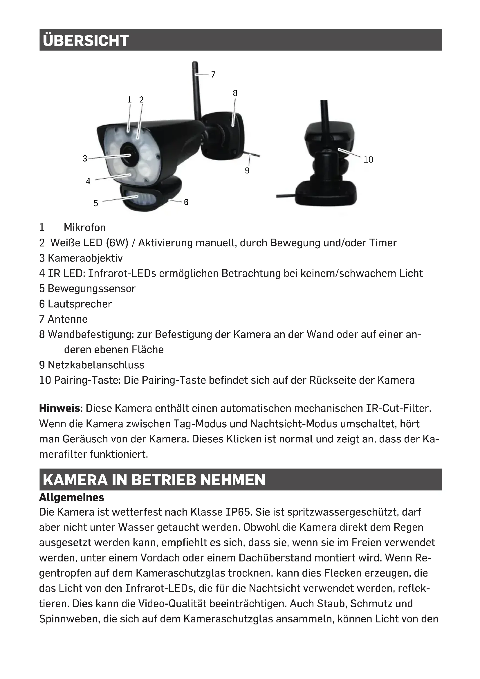 1 Mikrofon 2 Weiße LED (6W) / Aktivierung manuell, durch Bewegung und/oder Timer 3 Kameraobjektiv 4 IR LED: Infrarot-LEDs ermöglichen Betrachtung bei keinem/schwachem Licht 5 Bewegungssensor 6 Lautsprecher 7 Antenne 8 Wandbefestigung: zur Befestigung der Kamera an der Wand oder auf einer an- deren ebenen Fläche 9 Netzkabelanschluss 10 Pairing-Taste: Die Pairing-Taste befindet sich auf der Rückseite der Kamera Hinweis: Diese Kamera enthält einen automatischen mechanischen IR-Cut-Filter. Wenn die Kamera zwischen Tag-Modus und Nachtsicht-Modus umschaltet, hört man Geräusch von der Kamera. Dieses Klicken ist normal und zeigt an, dass der Ka- merafilter funktioniert.