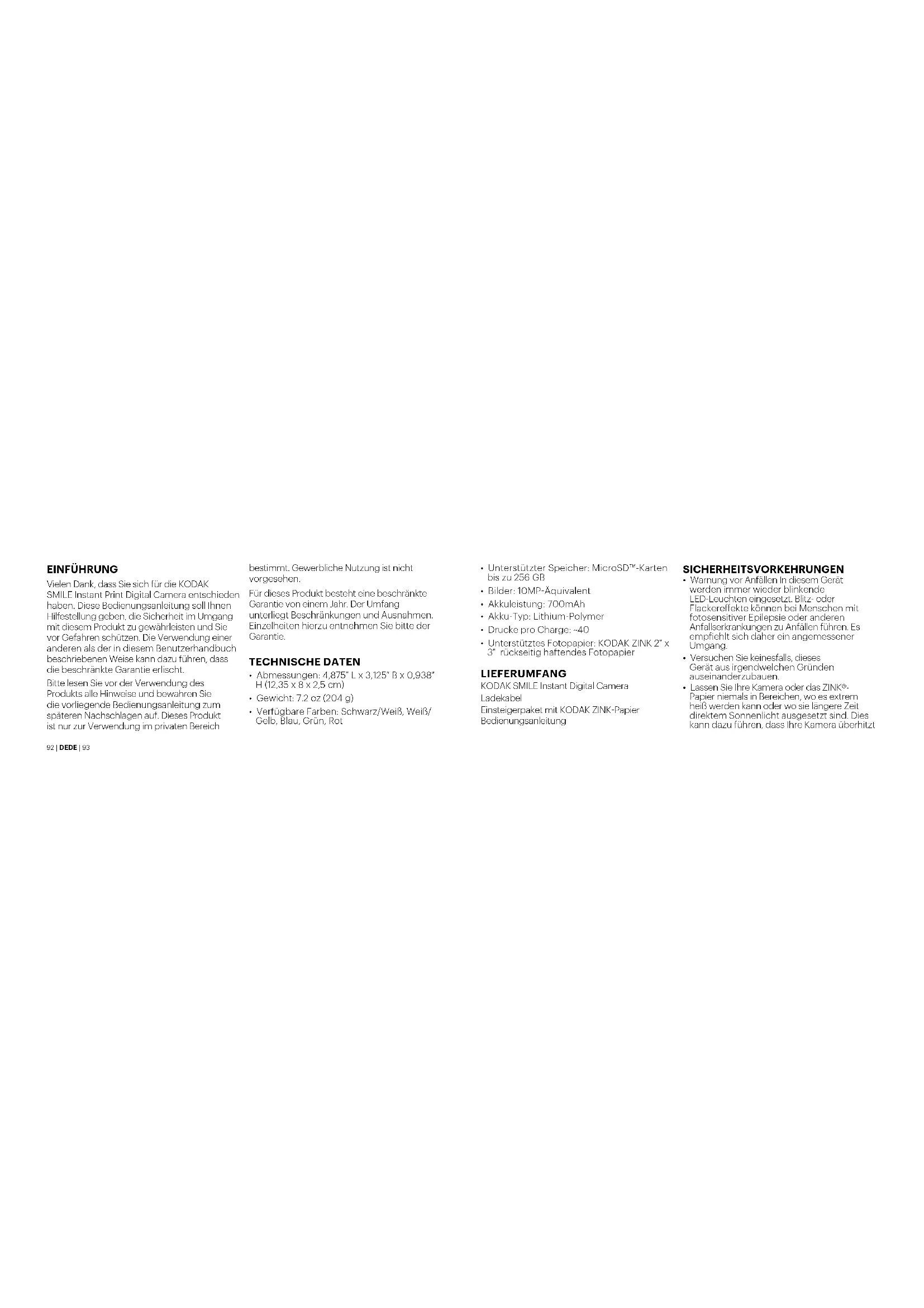 kodakphotoplus.com Il marchio, il logo e il vestito commerciale Kodak sono utilizzati su licenza di Eastman Kodak Company. Android è un marchio di Google Inc. IOS è un marchio di Cisco negli Stati Uniti e in altri paesi e viene utilizzato su licenza. Tutti gli altri prodotti, nomi di marchi, nomi di società e loghi sono marchi dei rispettivi proprietari, utilizzati solo per identiicare i loro rispettivi prodotti e non intendono connotare alcuna sponsorizzazione, approvazione o approvazione. Distribuito da: C&A Marketing, Inc., 114 Tived Lane East, Edison, NJ 08837, USA C&A Marketing UK LTD, 167 Hermitage Road, Crusader Industrial Estate, London N4 1LZ, UK ©2019. Tutti i diritti riservati. Prodotto in Vietnam.92 | DE DE | 93 EINFÜHRUNG Vielen Dank, dass Sie sich für die KODAK SMILE Instant Print Digital Camera entschieden haben. Diese Bedienungsanleitung soll Ihnen Hilfestellung geben, die Sicherheit im Umgang mit diesem Produkt zu gewährleisten und Sie vor Gefahren schützen. Die Verwendung einer anderen als der in diesem Benutzerhandbuch beschriebenen Weise kann dazu führen, dass die beschränkte Garantie erlischt. Bitte lesen Sie vor der Verwendung des Produkts alle Hinweise und bewahren Sie die vorliegende Bedienungsanleitung zum späteren Nachschlagen auf. Dieses Produkt ist nur zur Verwendung im privaten Bereich bestimmt. Gewerbliche Nutzung ist nicht vorgesehen. Für dieses Produkt besteht eine beschränkte Garantie von einem Jahr. Der Umfang unterliegt Beschränkungen und Ausnahmen. Einzelheiten hierzu entnehmen Sie bitte der Garantie. TECHNISCHE DATEN