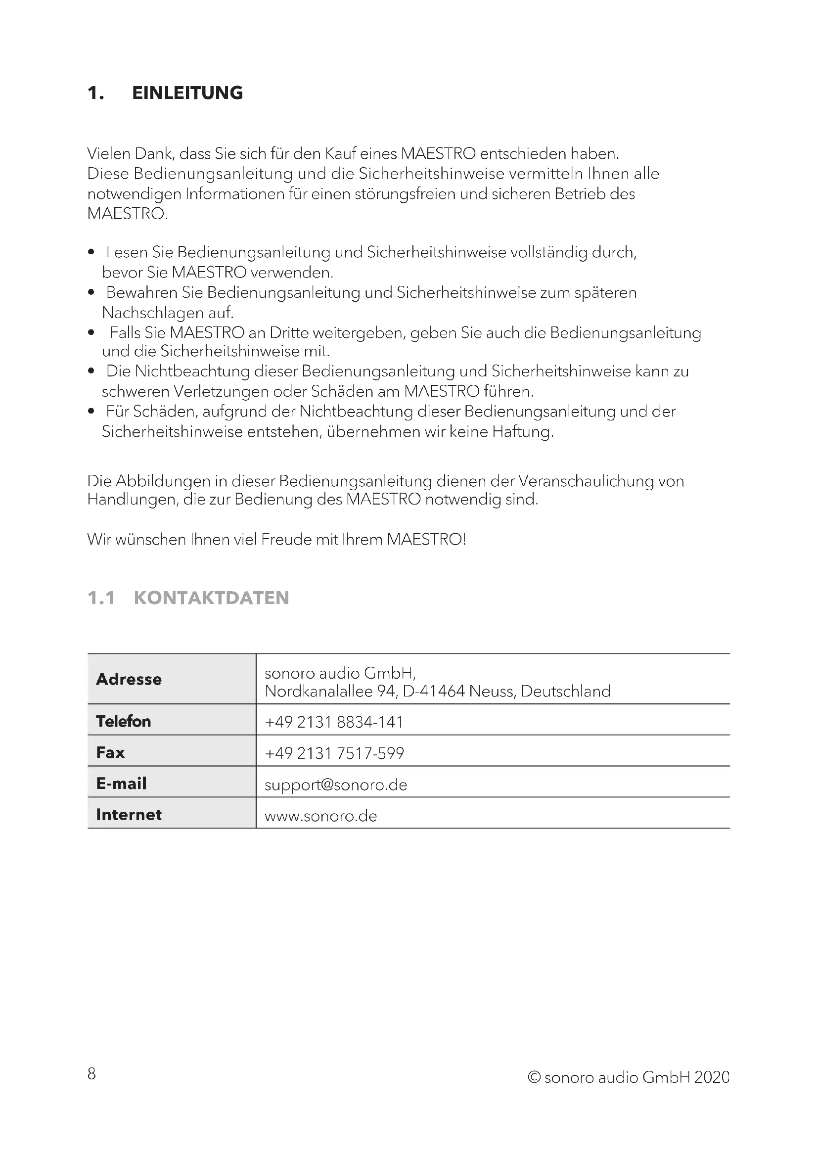 - Für Schäden, aufgrund der Nichtbeachtung dieser Bedienungsanleitung und der Sicherheitshinweise entstehen, übernehmen wir keine Haftung. Die Abbildungen in dieser Bedienungsanleitung dienen der Veranschaulichung von Handlungen, die zur Bedienung des MAESTRO notwendig sind. Wir wünschen Ihnen viel Freude mit Ihrem MAESTRO! © sonoro audio GmbH 2020