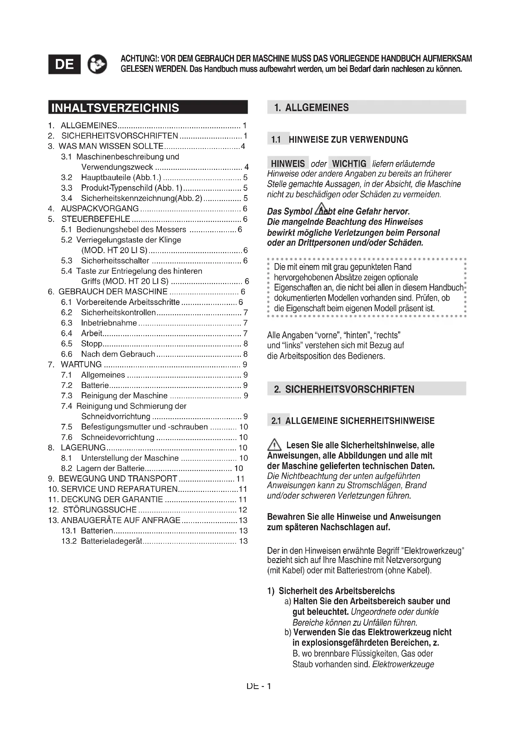 Vor jeder Verwendung den Ladezustand der Batterie überprüfen. Hierzu den Hinweisen folgen, die im Handbuch der Batterie enthalten sind.DE - 7