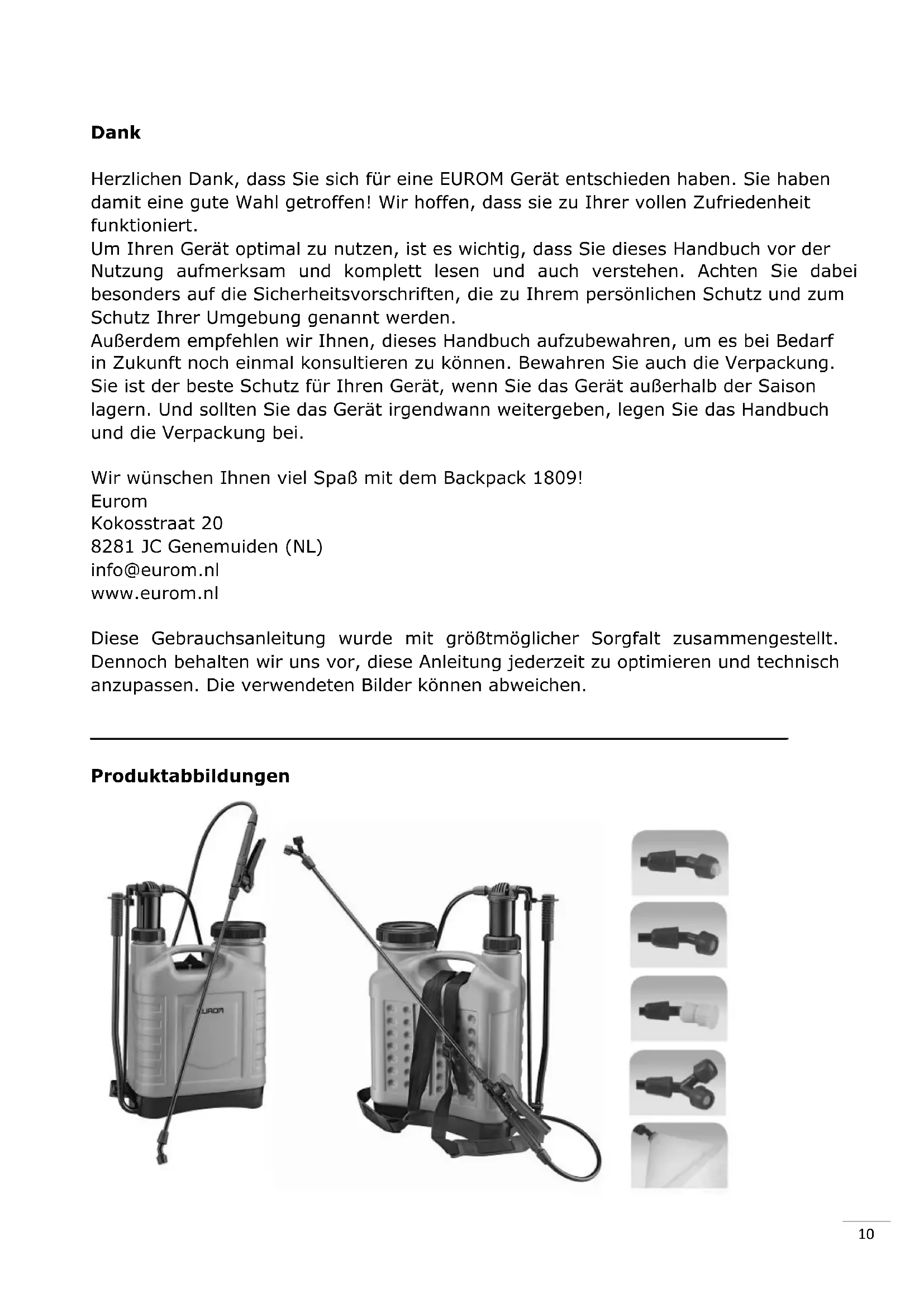 Produktabbildungen11 Einleitung Die EUROM BACKPACK 1809 ist ein neu entwickeltes Sprühgerät mit einer sicheren, wirtschaftlichen und effizienten Nutzung. Die Rückenspritze trägt sich komfortabel, funktioniert reibungslos und sprüht gleichmäßig. Die BACKPACK 1809 eignet sich besonders gut zum Spritzen flüssiger Schädlingsbekämpfungsmittel, Unkrautvertilgungsmittel, Düngemitteln und vorbeugenden Mitteln gegen Pflanzenkrankheiten an Gewächsen, blühenden und nicht blühenden Pflanzen, in Gärten, Sanitärräumen öffentlicher Gebäude und zur vorbeugenden Behandlung von Vieh- und Geflügelställen gegen Epidemien. Sie kann auch für Haushaltsarbeiten wie z.B. Fensterputzen und Autowaschen eingesetzt werden. Das Gerät muss von Erwachsenen angewendet werden, die damit vertraut sind und sicher damit umgehen können. Durch unsachgemäße Nutzung oder Wartung des Gerätes sowie durch am Gerät vorgenommene Änderungen entfällt die Haftpflicht des Lieferanten sowie die Garantie. Das Gerät eignet sich nicht für die tägliche professionelle Anwendung. Technische Daten Arbeitsdruck Max. 0,4 MPa (4 bar) Containerinhalt 18 Liter Durchmesser des Pumpengehäuses 45 mm Material des Containers Kunststoff Maße 42 x 19,5 x 57,5 cm Nettogewicht 3,2 kg