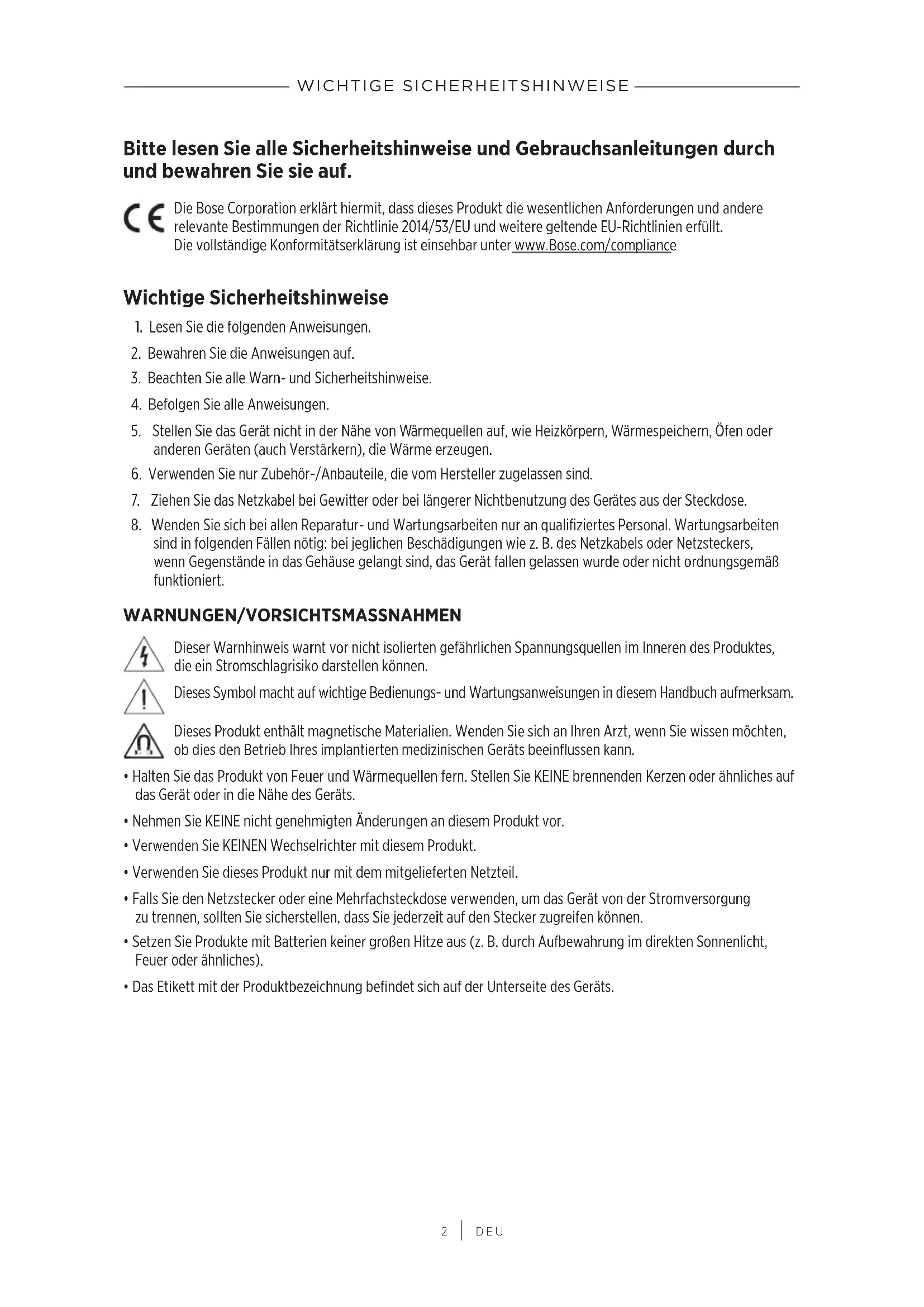 DEU Bitte lesen Sie alle Sicherheitshinweise und Gebrauchsanleitungen durch und bewahren Sie sie auf. Die Bose Corporation erklärt hiermit, dass dieses Produkt die wesentlichen Anforderungen und andere relevante Bestimmungen der Richtlinie 2014/53/EU und weitere geltende EU-Richtlinien erfüllt. Dievollständige Konformitätserklärung ist einsehbar unter www.Bose.com/compliance Wichtige Sicherheitshinweise