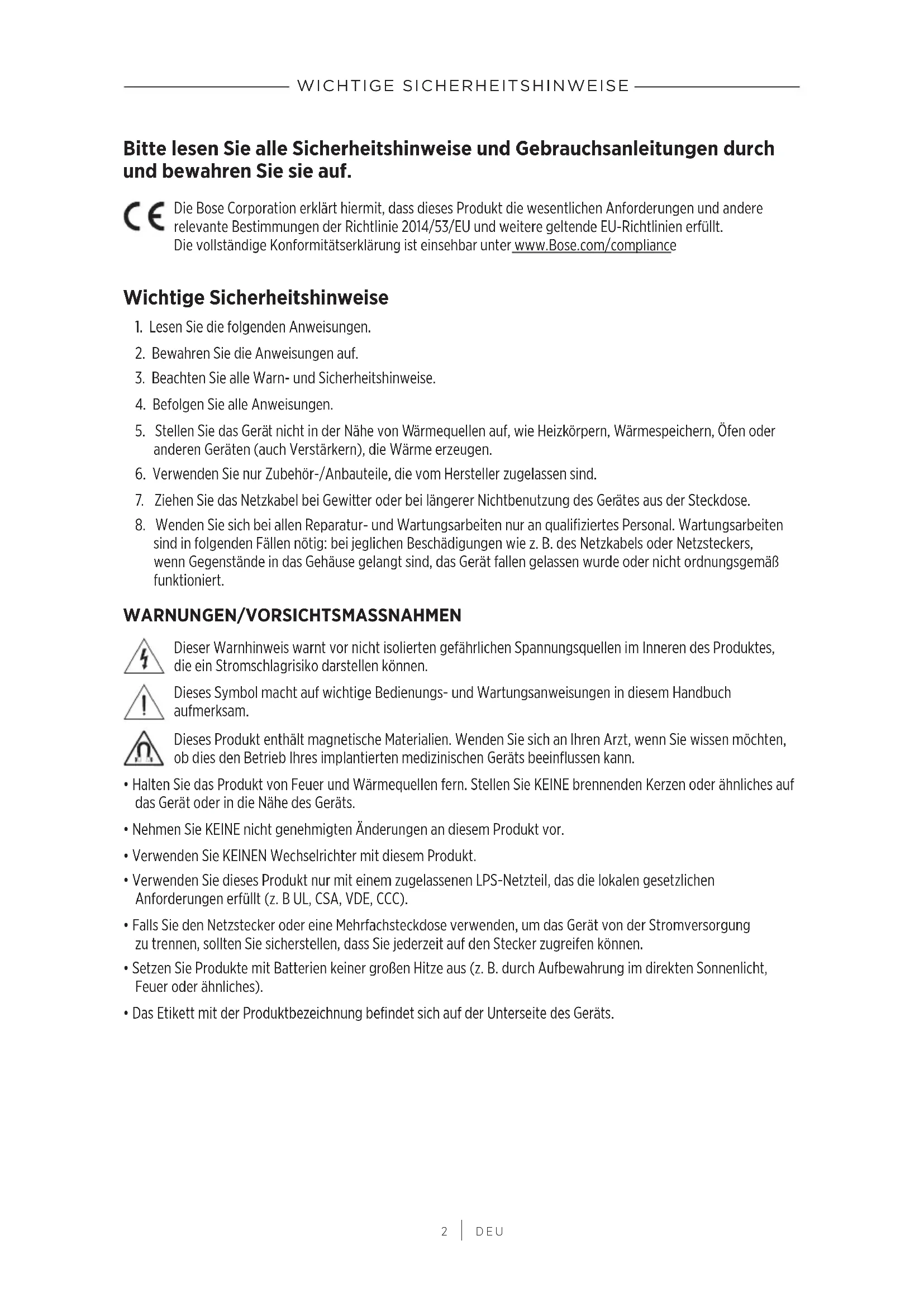 DEU Bitte lesen Sie alle Sicherheitshinweise und Gebrauchsanleitungen durch und bewahren Sie sie auf. Die Bose Corporation erklärt hiermit, dass dieses Produkt die wesentlichen Anforderungen und andere relevante Bestimmungen der Richtlinie 2014/53/EU und weitere geltende EU-Richtlinien erfüllt. Dievollständige Konformitätserklärung ist einsehbar unter www.Bose.com/compliance Wichtige Sicherheitshinweise