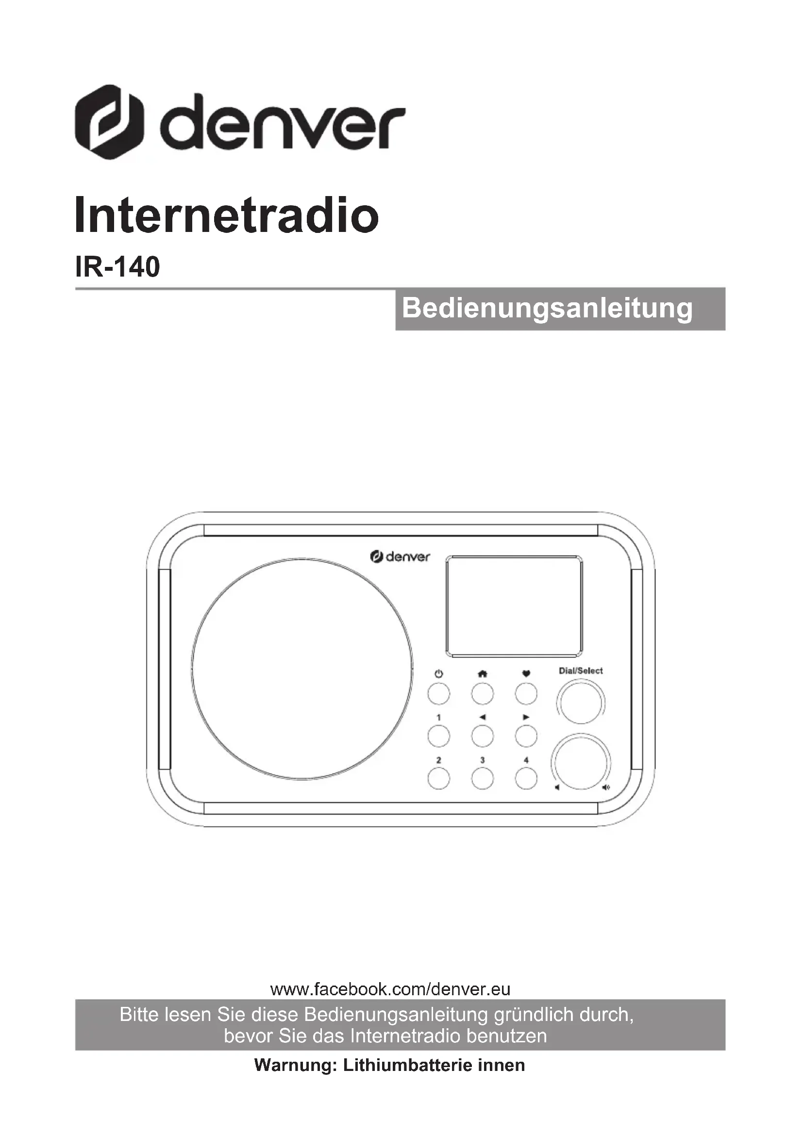 Omega 5A, Soeften DK-8382 Hinnerup Denmark www.facebook.com/denver.eu www.denver.eu ENG-12IR-140 Internetradio Bedienungsanleitung Bitte lesen Sie diese Bedienungsanleitung gründlich durch, bevor Sie das Internetradio benutzen Warnung: Lithiumbatterie innen www.facebook.com/denver.euSicherheitshinweise Bitte lesen Sie die Sicherheitshinweise vor der ersten Verwendung des Produkts aufmerksam durch und bewahren Sie die Anleitung zum späteren Nachschlagen auf.