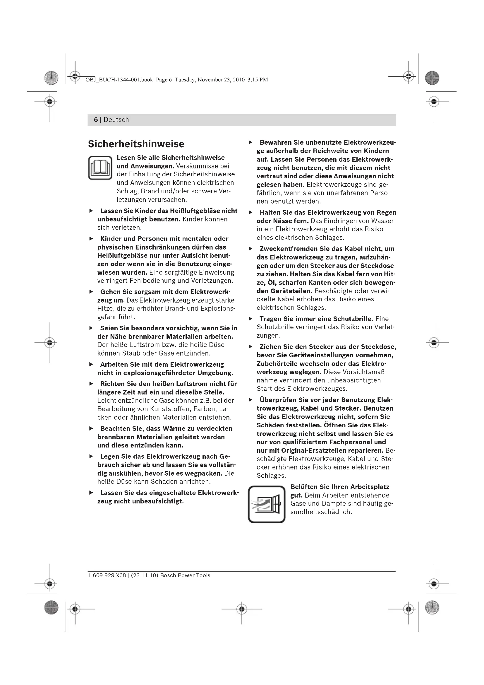 - Verwenden Sie das Elektrowerkzeug nicht als Haarrockner. Der austretende Luftstrom ist wesentlich frei aber als bei einem Haarrockner.