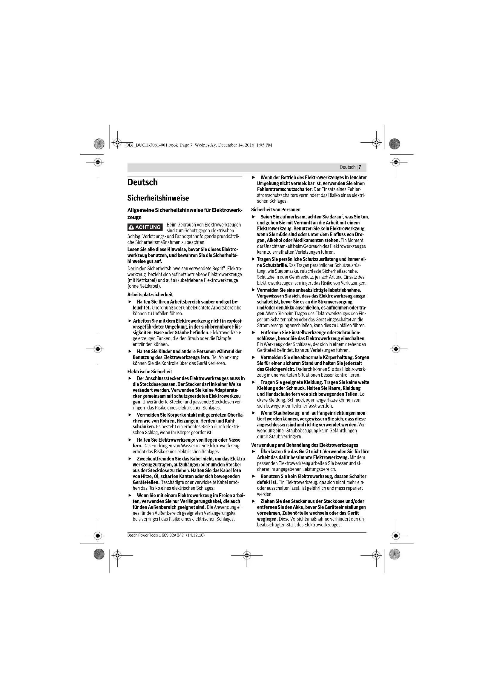 OBJ_BUCH-3061-001.book Page 6 Wednesday, December 7, 2016 10:55 AMDeutsch | 7 Bosch Power Tools 1 609 92A 342 | (14.12.16) Deutsch Sicherheitshinweise Allgemeine Sicherheitshinweise für Elektrowerk- zeuge Beim Gebrauch von Elektrowerkzeugen sind zum Schutz gegen elektrischen Schlag, Verletzungs- und Brandgefahr folgende grundsätzli- che Sicherheitsmaßnahmen zu beachten. Lesen Sie alle diese Hinweise, bevor Sie dieses Elektro- werkzeug benutzen, und bewahren Sie die Sicherheits- hinweise gut auf. Der in den Sicherheitshinweisen verwendete Begriff „Elektro- werkzeug“ bezieht sich auf netzbetriebene Elektrowerkzeuge (mit Netzkabel) und auf akkubetriebene Elektrowerkzeuge (ohne Netzkabel). Arbeitsplatzsicherheit Halten Sie Ihren Arbeitsbereich sauber und gut be- leuchtet. Unordnung oder unbeleuchtete Arbeitsbereiche können zu Unfällen führen. Arbeiten Sie mit dem Elektrowerkzeug nicht in explosi- onsgefährdeter Umgebung, in der sich brennbare Flüs- sigkeiten, Gase oder Stäube befinden. Elektrowerkzeu- ge erzeugen Funken, die den Staub oder die Dämpfe entzünden können. Halten Sie Kinder und andere Personen während der Benutzung des Elektrowerkzeugs fern. Bei Ablenkung können Sie die Kontrolle über das Gerät verlieren. Elektrische Sicherheit Der Anschlussstecker des Elektrowerkzeuges muss in die Steckdose passen. Der Stecker darf in keiner Weise verändert werden. Verwenden Sie keine Adapterste- cker gemeinsam mit schutzgeerdeten Elektrowerkzeu- gen. Unveränderte Stecker und passende Steckdosen ver- ringern das Risiko eines elektrischen Schlages. Vermeiden Sie Körperkontakt mit geerdeten Oberflä- chen wie von Rohren, Heizungen, Herden und Kühl- schränken. Es besteht ein erhöhtes Risiko durch elektri- schen Schlag, wenn Ihr Körper geerdet ist. Halten Sie Elektrowerkzeuge von Regen oder Nässe fern. Das Eindringen von Wasser in ein Elektrowerkzeug erhöht das Risiko eines elektrischen Schlages. Zweckentfremden Sie das Kabel nicht, um das Elektro- werkzeug zu tragen, aufzuhängen oder um den Stecker aus der Steckdose zu ziehen. Halten Sie das Kabel fern von Hitze, Öl, scharfen Kanten oder sich bewegenden Geräteteilen. Beschädigte oder verwickelte Kabel erhö- hen das Risiko eines elektrischen Schlages. Wenn Sie mit einem Elektrowerkzeug im Freien arbei- ten, verwenden Sie nur Verlängerungskabel, die auch für den Außenbereich geeignet sind. Die Anwendung ei- nes für den Außenbereich geeigneten Verlängerungska- bels verringert das Risiko eines elektrischen Schlages. Wenn der Betrieb des Elektrowerkzeuges in feuchter Umgebung nicht vermeidbar ist, verwenden Sie einen Fehlerstromschutzschalter. Der Einsatz eines Fehler- stromschutzschalters vermindert das Risiko eines elektri- schen Schlages. Sicherheit von Personen Seien Sie aufmerksam, achten Sie darauf, was Sie tun, und gehen Sie mit Vernunft an die Arbeit mit einem Elektrowerkzeug. Benutzen Sie kein Elektrowerkzeug, wenn Sie müde sind oder unter dem Einfluss von Dro- gen, Alkohol oder Medikamenten stehen. Ein Moment der Unachtsamkeit beim Gebrauch des Elektrowerkzeuges kann zu ernsthaften Verletzungen führen.