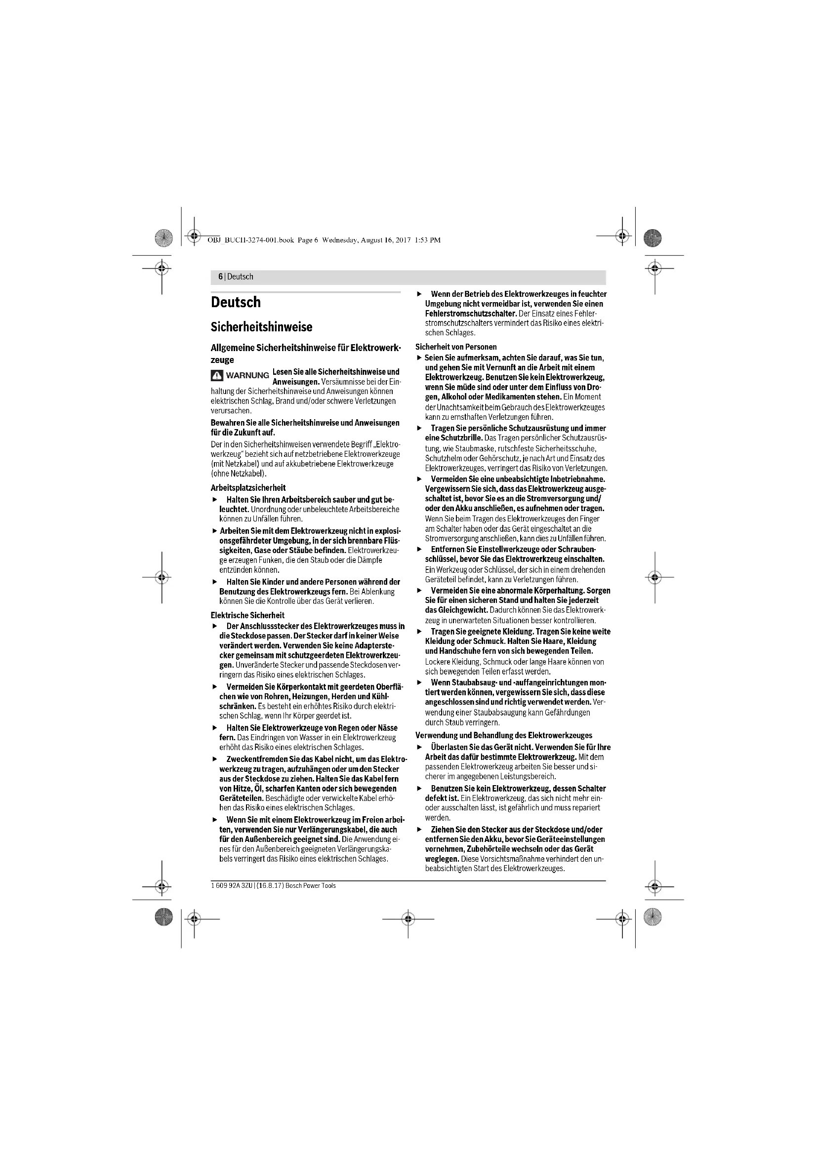 OBJ_BUCH-3274-001.book Page 5 Wednesday, August 16, 2017 1:53 PM6 | Deutsch 1 609 92A 3ZU | (16.8.17) Bosch Power Tools Deutsch Sicherheitshinweise Allgemeine Sicherheitshinweise für Elektrowerk- zeuge Lesen Sie alle Sicherheitshinweise und Anweisungen. Versäumnisse bei der Ein- haltung der Sicherheitshinweise und Anweisungen können elektrischen Schlag, Brand und/oder schwere Verletzungen verursachen. Bewahren Sie alle Sicherheitshinweise und Anweisungen für die Zukunft auf. Der in den Sicherheitshinweisen verwendete Begriff „Elektro- werkzeug“ bezieht sich auf netzbetriebene Elektrowerkzeuge (mit Netzkabel) und auf akkubetriebene Elektrowerkzeuge (ohne Netzkabel). Arbeitsplatzsicherheit Halten Sie Ihren Arbeitsbereich sauber und gut be- leuchtet. Unordnung oder unbeleuchtete Arbeitsbereiche können zu Unfällen führen. Arbeiten Sie mit dem Elektrowerkzeug nicht in explosi- onsgefährdeter Umgebung, in der sich brennbare Flüs- sigkeiten, Gase oder Stäube befinden. Elektrowerkzeu- ge erzeugen Funken, die den Staub oder die Dämpfe entzünden können. Halten Sie Kinder und andere Personen während der Benutzung des Elektrowerkzeugs fern. Bei Ablenkung können Sie die Kontrolle über das Gerät verlieren. Elektrische Sicherheit Der Anschlussstecker des Elektrowerkzeuges muss in die Steckdose passen. Der Stecker darf in keiner Weise verändert werden. Verwenden Sie keine Adapterste- cker gemeinsam mit schutzgeerdeten Elektrowerkzeu- gen. Unveränderte Stecker und passende Steckdosen ver- ringern das Risiko eines elektrischen Schlages. Vermeiden Sie Körperkontakt mit geerdeten Oberflä- chen wie von Rohren, Heizungen, Herden und Kühl- schränken. Es besteht ein erhöhtes Risiko durch elektri- schen Schlag, wenn Ihr Körper geerdet ist. Halten Sie Elektrowerkzeuge von Regen oder Nässe fern. Das Eindringen von Wasser in ein Elektrowerkzeug erhöht das Risiko eines elektrischen Schlages. Zweckentfremden Sie das Kabel nicht, um das Elektro- werkzeug zu tragen, aufzuhängen oder um den Stecker aus der Steckdose zu ziehen. Halten Sie das Kabel fern von Hitze, Öl, scharfen Kanten oder sich bewegenden Geräteteilen. Beschädigte oder verwickelte Kabel erhö- hen das Risiko eines elektrischen Schlages. Wenn Sie mit einem Elektrowerkzeug im Freien arbei- ten, verwenden Sie nur Verlängerungskabel, die auch für den Außenbereich geeignet sind. Die Anwendung ei- nes für den Außenbereich geeigneten Verlängerungska- bels verringert das Risiko eines elektrischen Schlages. Wenn der Betrieb des Elektrowerkzeuges in feuchter Umgebung nicht vermeidbar ist, verwenden Sie einen Fehlerstromschutzschalter. Der Einsatz eines Fehler- stromschutzschalters vermindert das Risiko eines elektri- schen Schlages. Sicherheit von Personen Seien Sie aufmerksam, achten Sie darauf, was Sie tun, und gehen Sie mit Vernunft an die Arbeit mit einem Elektrowerkzeug. Benutzen Sie kein Elektrowerkzeug, wenn Sie müde sind oder unter dem Einfluss von Dro- gen, Alkohol oder Medikamenten stehen. Ein Moment der Unachtsamkeit beim Gebrauch des Elektrowerkzeuges kann zu ernsthaften Verletzungen führen. Tragen Sie persönliche Schutzausrüstung und immer eine Schutzbrille. Das Tragen persönlicher Schutzausrüs- tung, wie Staubmaske, rutschfeste Sicherheitsschuhe, Schutzhelm oder Gehörschutz, je nach Art und Einsatz des Elektrowerkzeuges, verringert das Risiko von Verletzungen. Vermeiden Sie eine unbeabsichtigte Inbetriebnahme. Vergewissern Sie sich, dass das Elektrowerkzeug ausge- schaltet ist, bevor Sie es an die Stromversorgung und/ oder den Akku anschließen, es aufnehmen oder tragen. Wenn Sie beim Tragen des Elektrowerkzeuges den Finger am Schalter haben oder das Gerät eingeschaltet an die Stromversorgung anschließen, kann dies zu Unfällen führen. Entfernen Sie Einstellwerkzeuge oder Schrauben- schlüssel, bevor Sie das Elektrowerkzeug einschalten. Ein Werkzeug oder Schlüssel, der sich in einem drehenden Geräteteil befindet, kann zu Verletzungen führen. Vermeiden Sie eine abnormale Körperhaltung. Sorgen Sie für einen sicheren Stand und halten Sie jederzeit das Gleichgewicht. Dadurch können Sie das Elektrowerk- zeug in unerwarteten Situationen besser kontrollieren. Tragen Sie geeignete Kleidung. Tragen Sie keine weite Kleidung oder Schmuck. Halten Sie Haare, Kleidung und Handschuhe fern von sich bewegenden Teilen. Lockere Kleidung, Schmuck oder lange Haare können von sich bewegenden Teilen erfasst werden. Wenn Staubabsaug- und -auffangeinrichtungen mon- tiert werden können, vergewissern Sie sich, dass diese angeschlossen sind und richtig verwendet werden. Ver- wendung einer Staubabsaugung kann Gefährdungen durch Staub verringern. Verwendung und Behandlung des Elektrowerkzeuges Überlasten Sie das Gerät nicht. Verwenden Sie für Ihre Arbeit das dafür bestimmte Elektrowerkzeug. Mit dem passenden Elektrowerkzeug arbeiten Sie besser und si- cherer im angegebenen Leistungsbereich. Benutzen Sie kein Elektrowerkzeug, dessen Schalter defekt ist. Ein Elektrowerkzeug, das sich nicht mehr ein- oder ausschalten lässt, ist gefährlich und muss repariert werden. Ziehen Sie den Stecker aus der Steckdose und/oder entfernen Sie den Akku, bevor Sie Geräteeinstellungen vornehmen, Zubehörteile wechseln oder das Gerät weglegen. Diese Vorsichtsmaßnahme verhindert den un- beabsichtigten Start des Elektrowerkzeuges. WARNUNG OBJ_BUCH-3274-001.book Page 6 Wednesday, August 16, 2017 1:53 PMDeutsch | 7 Bosch Power Tools 1 609 92A 3ZU | (16.8.17) Bewahren Sie unbenutzte Elektrowerkzeuge außer- halb der Reichweite von Kindern auf. Lassen Sie Perso- nen das Gerät nicht benutzen, die mit diesem nicht ver- traut sind oder diese Anweisungen nicht gelesen haben. Elektrowerkzeuge sind gefährlich, wenn sie von unerfahrenen Personen benutzt werden. Pflegen Sie Elektrowerkzeuge mit Sorgfalt. Kontrollie- ren Sie, ob bewegliche Teile einwandfrei funktionieren und nicht klemmen, ob Teile gebrochen oder so be- schädigt sind, dass die Fu