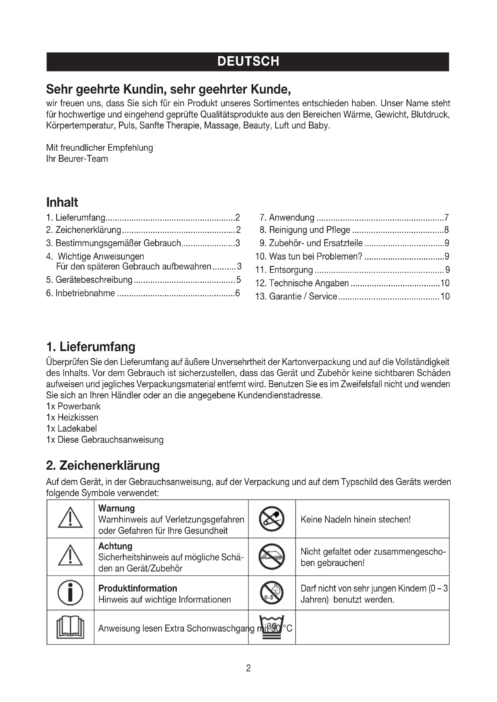 Auf dem Gerät, in der Gebrauchsanweisung, auf der Verpackung und auf dem Typschild des Geräts werden folgende Symbole verwendet: Warnung Warnhinweis auf Verletzungsgefahren oder Gefahren für Ihre Gesundheit Keine Nadeln hinein stechen! Achtung Sicherheitshinweis auf mögliche Schä- den an Gerät/Zubehör Nicht gefaltet oder zusammengescho- ben gebrauchen! Produktinformation Hinweis auf wichtige Informationen Darf nicht von sehr jungen Kindern (0 – 3 Jahren) benutzt werden. Anweisung lesen Extra Schonwaschgang mit 30 °C Sehr geehrte Kundin, sehr geehrter Kunde, wir freuen uns, dass Sie sich für ein Produkt unseres Sortimentes entschieden haben. Unser Name steht für hochwertige und eingehend geprüfte Qualitätsprodukte aus den Bereichen Wärme, Gewicht, Blutdruck, Körpertemperatur, Puls, Sanfte Therapie, Massage, Beauty, Luft und Baby. Mit freundlicher Empfehlung Ihr Beurer-Team3 Entsorgung gemäß Elektro- und Elek- tronik-Altgeräte EG-Richtlinie WEEE (Waste Electrical and Electronic Equip- ment) Nicht bleichen