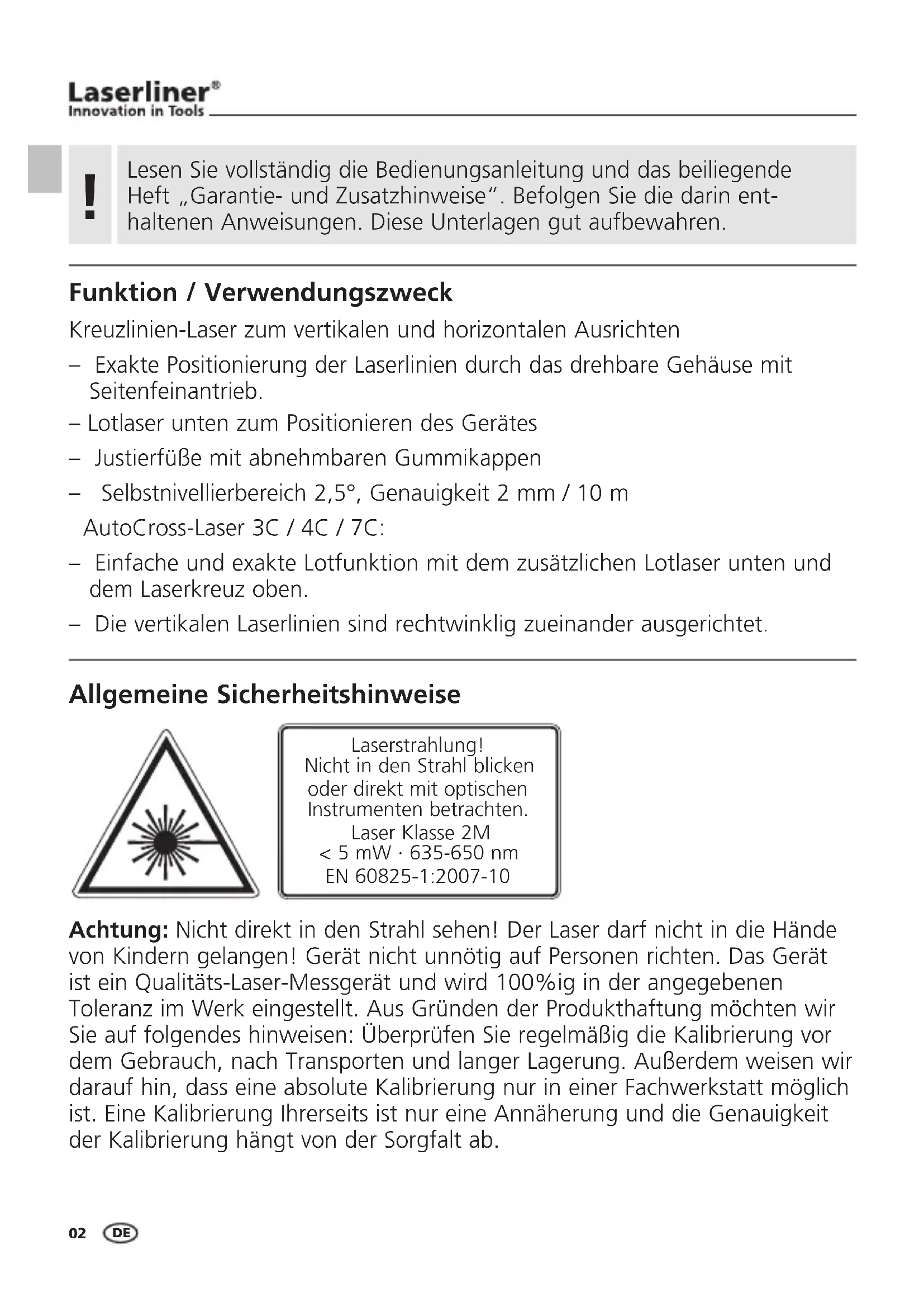 Funktion / Verwendungszweck Kreuzlinien-Laser zum vertikalen und horizontalen Ausrichten – Exakte Positionierung der Laserlinien durch das drehbare Gehäuse mit Seitenfeinantrieb. – Lotlaser unten zum Positionieren des Gerätes – Justierfüße mit abnehmbaren Gummikappen – Selbstnivellierbereich 2,5°, Genauigkeit 2 mm / 10 m AutoCross-Laser 3C / 4C / 7C: – Einfache und exakte Lotfunktion mit dem zusätzlichen Lotlaser unten und dem Laserkreuz oben. – Die vertikalen Laserlinien sind rechtwinklig zueinander ausgerichtet. Allgemeine Sicherheitshinweise Achtung: Nicht direkt in den Strahl sehen! Der Laser darf nicht in die Hände von Kindern gelangen! Gerät nicht unnötig auf Personen richten. Das Gerät ist ein Qualitäts-Laser-Messgerät und wird 100%ig in der angegebenen Toleranz im Werk eingestellt. Aus Gründen der Produkthaftung möchten wir Sie auf folgendes hinweisen: Überprüfen Sie regelmäßig die Kalibrierung vor dem Gebrauch, nach Transporten und langer Lagerung. Außerdem weisen wir darauf hin, dass eine absolute Kalibrierung nur in einer Fachwerkstatt möglich ist. Eine Kalibrierung Ihrerseits ist nur eine Annäherung und die Genauigkeit der Kalibrierung hängt von der Sorgfalt ab. Laserstrahlung! Nicht in den Strahl blicken oder direkt mit optischen Instrumenten betrachten. Laser Klasse 2M < 5 mW · 635-650 nm EN 60825-1:2007-10 Lesen Sie vollständig die Bedienungsanleitung und das beiliegende Heft „Garantie- und Zusatzhinweise“. Befolgen Sie die darin ent- haltenen Anweisungen. Diese Unterlagen gut aufbewahren.