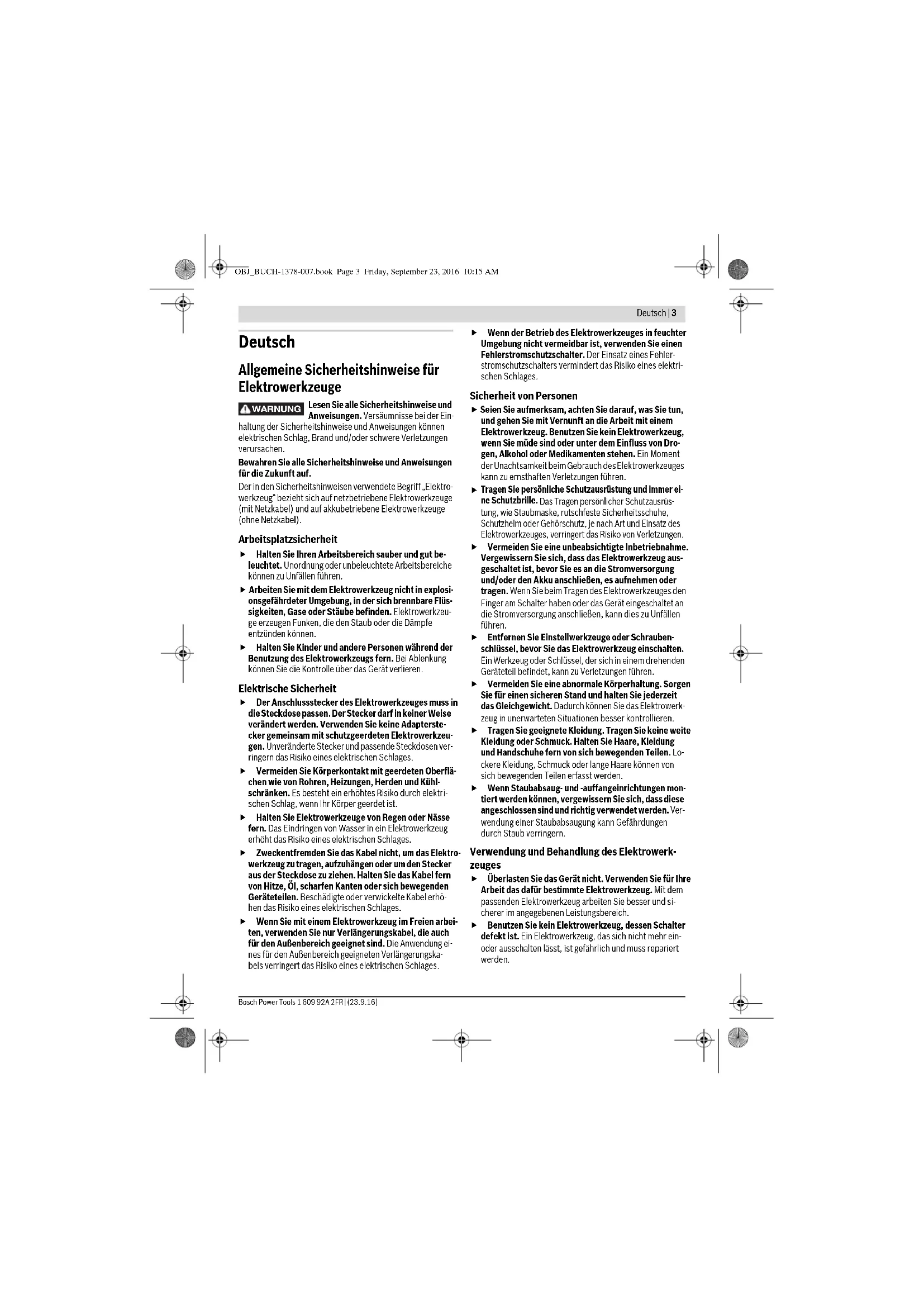 OBJ_BUCH-1378-007.book Page 2 Friday, September 23, 2016 10:15 AMDeutsch | 3 Bosch Power Tools 1 609 92A 2FR | (23.9.16) Deutsch Allgemeine Sicherheitshinweise für Elektrowerkzeuge Lesen Sie alle Sicherheitshinweise und Anweisungen. Versäumnisse bei der Ein- haltung der Sicherheitshinweise und Anweisungen können elektrischen Schlag, Brand und/oder schwere Verletzungen verursachen. Bewahren Sie alle Sicherheitshinweise und Anweisungen für die Zukunft auf. Der in den Sicherheitshinweisen verwendete Begriff „Elektro- werkzeug“ bezieht sich auf netzbetriebene Elektrowerkzeuge (mit Netzkabel) und auf akkubetriebene Elektrowerkzeuge (ohne Netzkabel). Arbeitsplatzsicherheit Halten Sie Ihren Arbeitsbereich sauber und gut be- leuchtet. Unordnung oder unbeleuchtete Arbeitsbereiche können zu Unfällen führen. Arbeiten Sie mit dem Elektrowerkzeug nicht in explosi- onsgefährdeter Umgebung, in der sich brennbare Flüs- sigkeiten, Gase oder Stäube befinden. Elektrowerkzeu- ge erzeugen Funken, die den Staub oder die Dämpfe entzünden können. Halten Sie Kinder und andere Personen während der Benutzung des Elektrowerkzeugs fern. Bei Ablenkung können Sie die Kontrolle über das Gerät verlieren. Elektrische Sicherheit Der Anschlussstecker des Elektrowerkzeuges muss in die Steckdose passen. Der Stecker darf in keiner Weise verändert werden. Verwenden Sie keine Adapterste- cker gemeinsam mit schutzgeerdeten Elektrowerkzeu- gen. Unveränderte Stecker und passende Steckdosen ver- ringern das Risiko eines elektrischen Schlages. Vermeiden Sie Körperkontakt mit geerdeten Oberflä- chen wie von Rohren, Heizungen, Herden und Kühl- schränken. Es besteht ein erhöhtes Risiko durch elektri- schen Schlag, wenn Ihr Körper geerdet ist. Halten Sie Elektrowerkzeuge von Regen oder Nässe fern. Das Eindringen von Wasser in ein Elektrowerkzeug erhöht das Risiko eines elektrischen Schlages. Zweckentfremden Sie das Kabel nicht, um das Elektro- werkzeug zu tragen, aufzuhängen oder um den Stecker aus der Steckdose zu ziehen. Halten Sie das Kabel fern von Hitze, Öl, scharfen Kanten oder sich bewegenden Geräteteilen. Beschädigte oder verwickelte Kabel erhö- hen das Risiko eines elektrischen Schlages. Wenn Sie mit einem Elektrowerkzeug im Freien arbei- ten, verwenden Sie nur Verlängerungskabel, die auch für den Außenbereich geeignet sind. Die Anwendung ei- nes für den Außenbereich geeigneten Verlängerungska- bels verringert das Risiko eines elektrischen Schlages. Wenn der Betrieb des Elektrowerkzeuges in feuchter Umgebung nicht vermeidbar ist, verwenden Sie einen Fehlerstromschutzschalter. Der Einsatz eines Fehler- stromschutzschalters vermindert das Risiko eines elektri- schen Schlages. Sicherheit von Personen Seien Sie aufmerksam, achten Sie darauf, was Sie tun, und gehen Sie mit Vernunft an die Arbeit mit einem Elektrowerkzeug. Benutzen Sie kein Elektrowerkzeug, wenn Sie müde sind oder unter dem Einfluss von Dro- gen, Alkohol oder Medikamenten stehen. Ein Moment der Unachtsamkeit beim Gebrauch des Elektrowerkzeuges kann zu ernsthaften Verletzungen führen.
