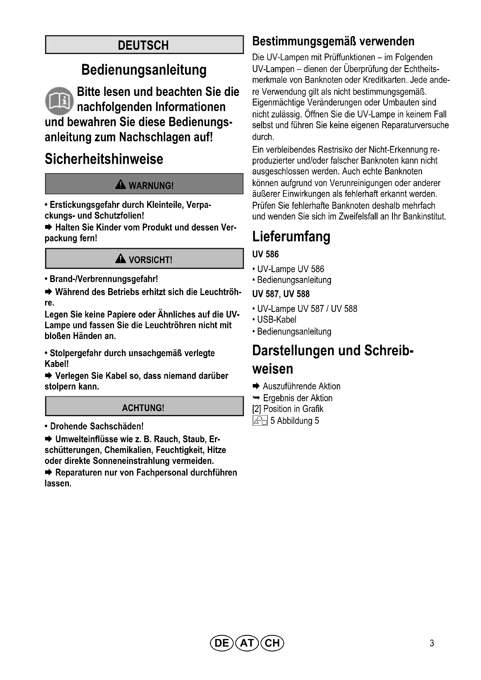 - Drohende Sachschäden! Umwelteinflüsse wie z. B. Rauch, Staub, Er schütterungen, Chemikalien, Feuchtigkeit, Hitze oder direkte Sonneneinstrahlung vermeiden. Reparaturen nur von Fachpersonal durchführen lassen. Bestimmungsgemäß verwenden Die UV-Lampen mit Prüffunktionen – im Folgenden UV-Lampen – dienen der Überprüfung der Echtheits merkmale von Banknoten oder Kreditkarten. Jede ande re Verwendung gilt als nicht bestimmungsgemäß. Eigenmächtige Veränderungen oder Umbauten sind nicht zulässig. Öffnen Sie die UV-Lampe in keinem Fall selbst und führen Sie keine eigenen Reparaturversuche durch. Ein verbleibendes Restrisiko der NichtErkennung re produzierter und/oder falscher Banknoten kann nicht ausgeschlossen werden. Auch echte Banknoten können aufgrund von Verunreinigungen oder anderer äußerer Einwirkungen als fehlerhaft erkannt werden. Prüfen Sie fehlerhafte Banknoten deshalb mehrfach und wenden Sie sich im Zweifelsfall an Ihr Bankinstitut. Lieferumfang UV 586