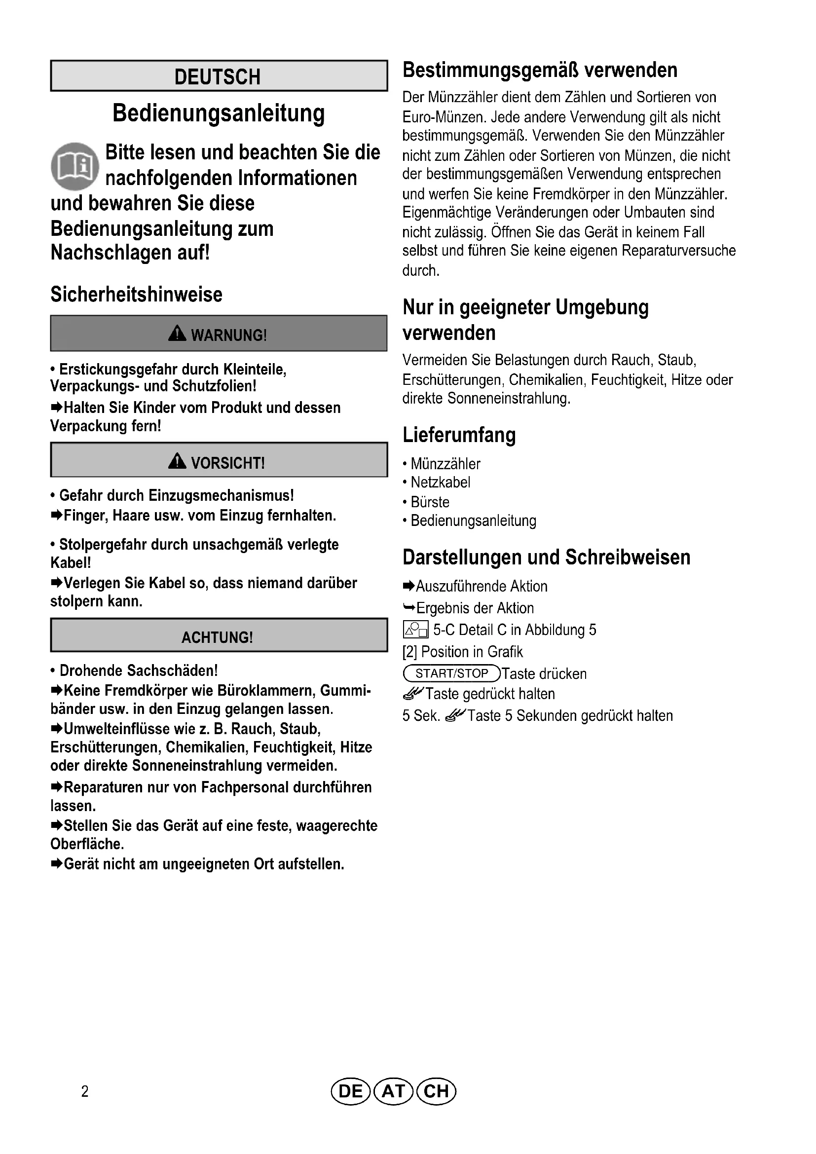- Drohende Sachschäden! Keine Fremdkörper wie Büroklammern, Gummi bänder usw. in den Einzug gelangen lassen. Umwelteinflüsse wie z. B. Rauch, Staub, Erschütterungen, Chemikalien, Feuchtigkeit, Hitze oder direkte Sonneneinstrahlung vermeiden. Reparaturen nur von Fachpersonal durchführen lassen. Stellen Sie das Gerät auf eine feste, waagerechte Oberfläche. Gerät nicht am ungeeigneten Ort aufstellen. Bestimmungsgemäß verwenden Der Münzzähler dient dem Zählen und Sortieren von Euro-Münzen. Jede andere Verwendung gilt als nicht bestimmungsgemäß. Verwenden Sie den Münzzähler nicht zum Zählen oder Sortieren von Münzen, die nicht der bestimmungsgemäßen Verwendung entsprechen und werfen Sie keine Fremdkörper in den Münzzähler. Eigenmächtige Veränderungen oder Umbauten sind nicht zulässig. Öffnen Sie das Gerät in keinem Fall selbst und führen Sie keine eigenen Reparaturversuche durch. Nur in geeigneter Umgebung verwenden Vermeiden Sie Belastungen durch Rauch, Staub, Erschütterungen, Chemikalien, Feuchtigkeit, Hitze oder direkte Sonneneinstrahlung. Lieferumfang