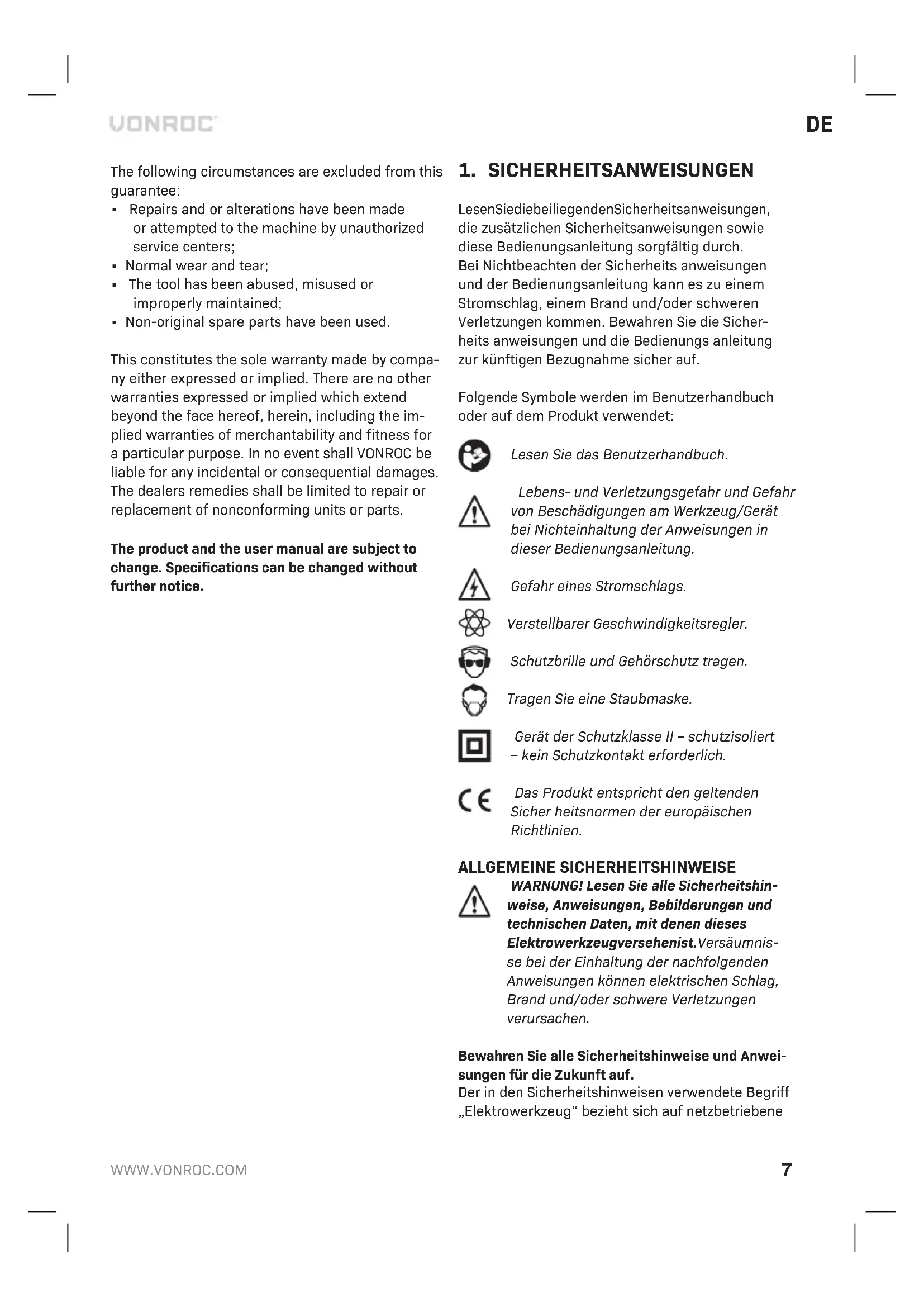 Es wurden keine Original-Ersatzteile verwendet. Dies stellt die einzige Gewährleistung des Unterneh- mens dar, sowohl ausdrücklich als auch implizit. Es gibt keine anderen ausdrücklichen oder stillsch- weigenden Garantien, die über das hier Genannte hinausgehen, einschließlich der stillschweigenden Garantien der Marktgängigkeit oder Eignung für einen bestimmten Zweck. In keinem Fall ist VONROC haftbar für Neben- oder Folgeschäden. Die Rechts- mittel des Händlers beschränken sich auf Reparatur oder Ersatz fehlerhafter Einheiten oder Teile. Am Produkt und am Benutzerhandbuch können Än- derungen vorgenommen werden. Die technischen Daten können sich ohne Vorankündigung ändern.