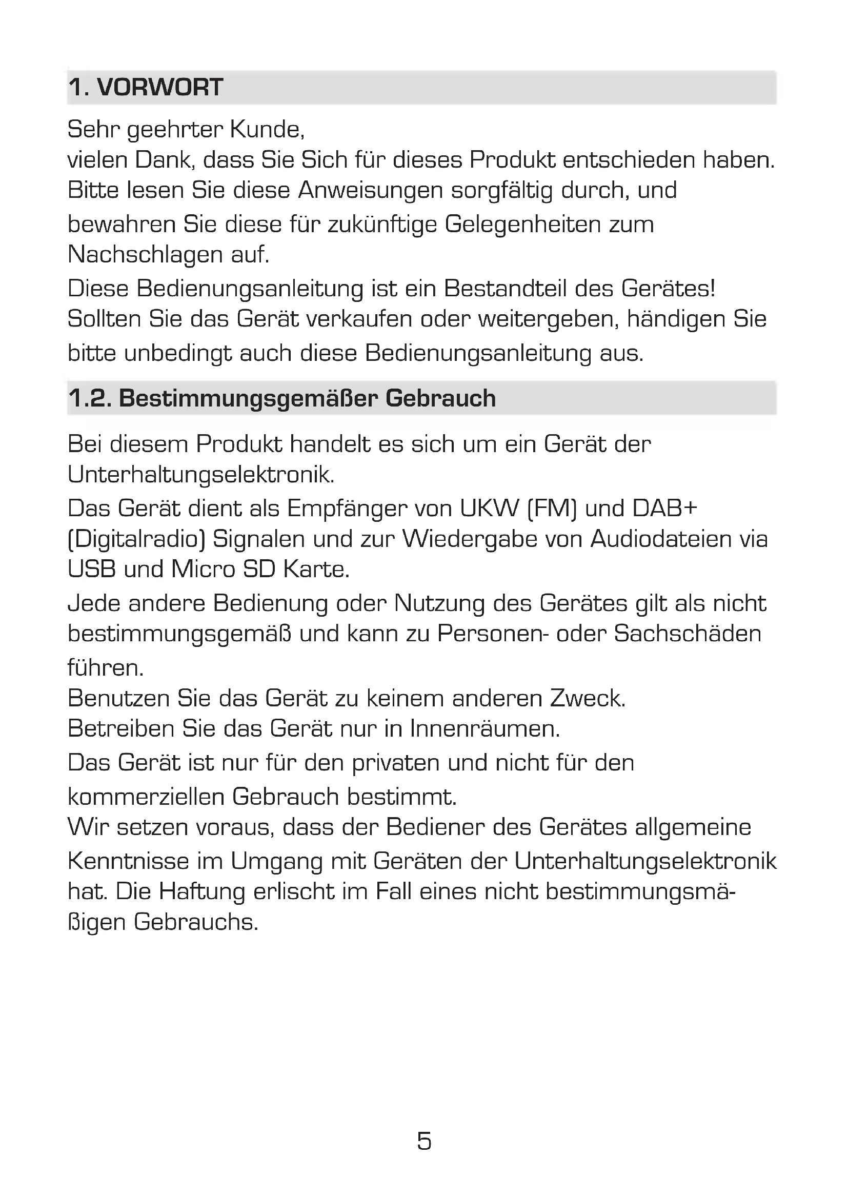 INHALT5 Sehr geehrter Kunde, vielen Dank, dass Sie Sich für dieses Produkt entschieden haben. Bitte lesen Sie diese Anweisungen sorgfältig durch, und bewahren Sie diese für zukünftige Gelegenheiten zum Nachschlagen auf. Diese Bedienungsanleitung ist ein Bestandteil des Gerätes! Sollten Sie das Gerät verkaufen oder weitergeben, händigen Sie bitte unbedingt auch diese Bedienungsanleitung aus. 1.2. Bestimmungsgemäßer Gebrauch Bei diesem Produkt handelt es sich um ein Gerät der Unterhaltungselektronik. Das Gerät dient als Empfänger von UKW (FM) und DAB+ (Digitalradio) Signalen und zur Wiedergabe von Audiodateien via USB und Micro SD Karte. Jede andere Bedienung oder Nutzung des Gerätes gilt als nicht bestimmungsgemäß und kann zu Personen- oder Sachschäden führen. Benutzen Sie das Gerät zu keinem anderen Zweck. Betreiben Sie das Gerät nur in Innenräumen. Das Gerät ist nur für den privaten und nicht für den kommerziellen Gebrauch bestimmt. Wir setzen voraus, dass der Bediener des Gerätes allgemeine Kenntnisse im Umgang mit Geräten der Unterhaltungselektronik hat. Die Haftung erlischt im Fall eines nicht bestimmungsmä- ßigen Gebrauchs.