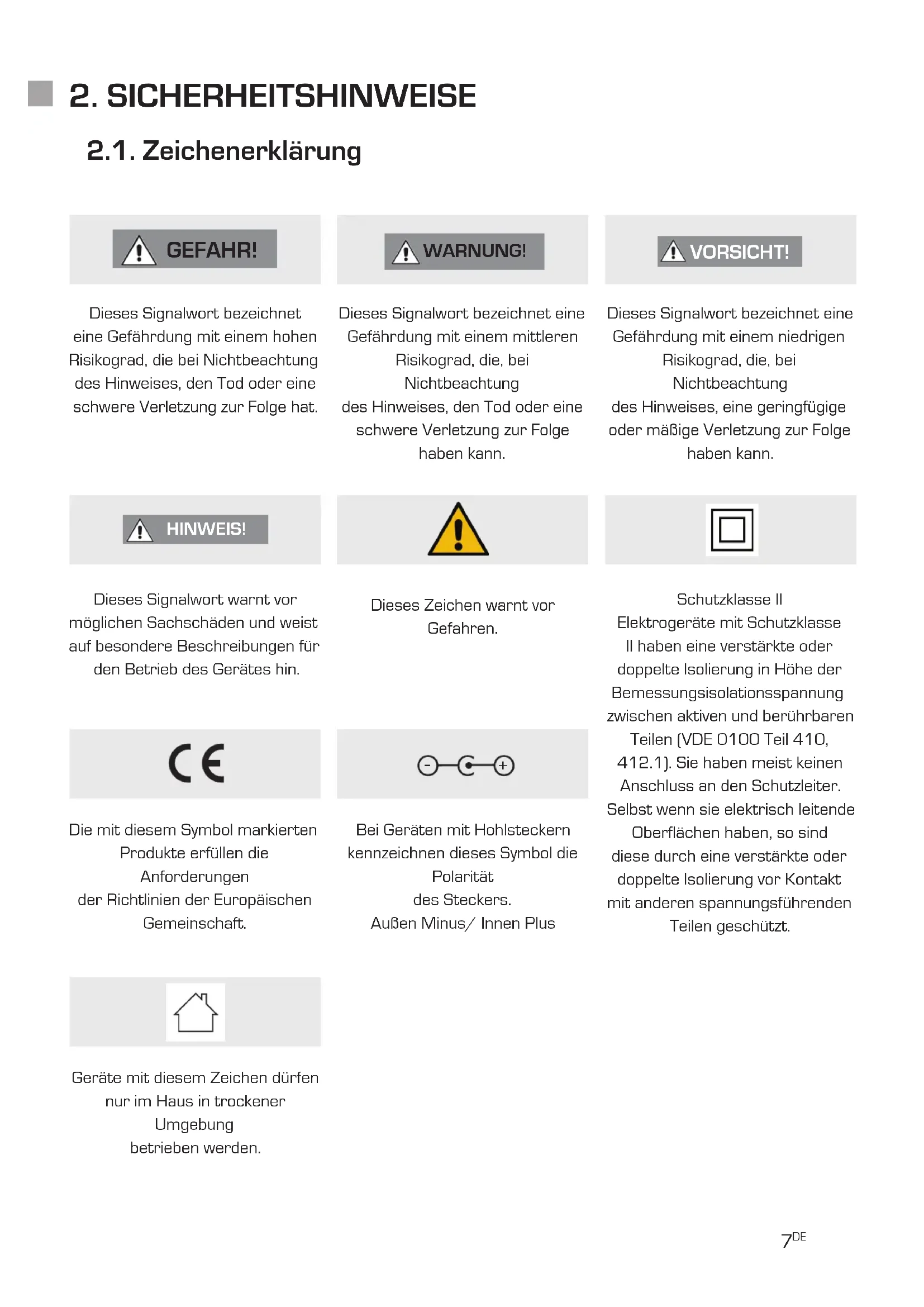 Dieses Signalwort bezeichneteine Gefährdung mit einem hohenRisikograd, die bei Nichtbeachtungdes Hinweises, den Tod oder eineschwere Verletzung zur Folge hat.Dieses Signalwort warnt vormöglichen Sachschäden und weistauf besondere Beschreibungen fürden Betrieb des Gerätes hin.Dieses Signalwort bezeichnet eineGefährdung mit einem mittlerenRisikograd, die, bei Nichtbeachtungdes Hinweises, den Tod oder eineschwere Verletzung zur Folge haben kann.Dieses Zeichen warnt vor Gefahren.Dieses Signalwort bezeichnet eineGefährdung mit einem niedrigenRisikograd, die, bei Nichtbeachtungdes Hinweises, eine geringfügigeoder mäßige Verletzung zur Folgehaben kann.Schutzklasse IIElektrogeräte mit SchutzklasseII haben eine verstärkte oderdoppelte Isolierung in Höhe derBemessungsisolationsspannungzwischen aktiven und berührbarenTeilen (VDE 0100 Teil 410, 412.1). Sie haben meist keinen Anschluss an den Schutzleiter. Selbst wenn sie elektrisch leitende Oberflächen haben, so sind diese durch eine verstärkte oder doppelte Isolierung vor Kontakt mit anderen spannungsführendenTeilen geschützt. 2.1. Zeichenerklärung Die mit diesem Symbol markiertenProdukte erfüllen die Anforderungender Richtlinien der EuropäischenGemeinschaft.Bei Geräten mit Hohlsteckern kennzeichnen dieses Symbol die Polaritätdes Steckers.Außen Minus/ Innen PlusGeräte mit diesem Zeichen dürfennur im Haus in trockener Umgebungbetrieben werden.8