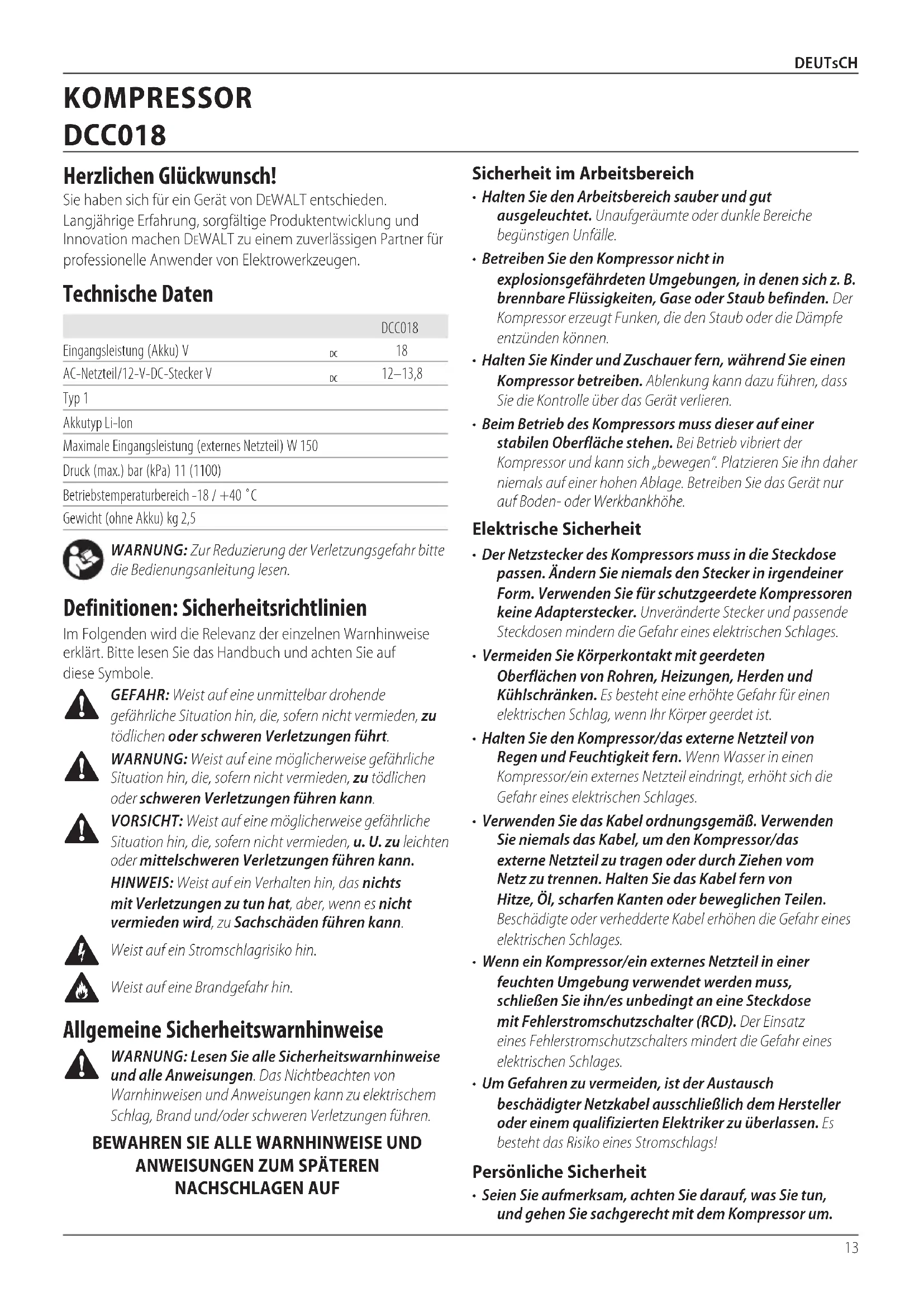 - Seien Sie aufmerksam, achten Sie darauf, was Sie tun, und gehen Sie sachgerecht mit dem Kompressor um. Herzlichen Glückwunsch! Sie haben sich für ein Gerät von DeWALT entschieden. Langjährige Erfahrung, sorgfältige Produktentwicklung und Innovation machen DeWALT zu einem zuverlässigen Partner für professionelle Anwender vonElektrowerkzeugen. Technische Daten DCC018 Eingangsleistung (Akku) V