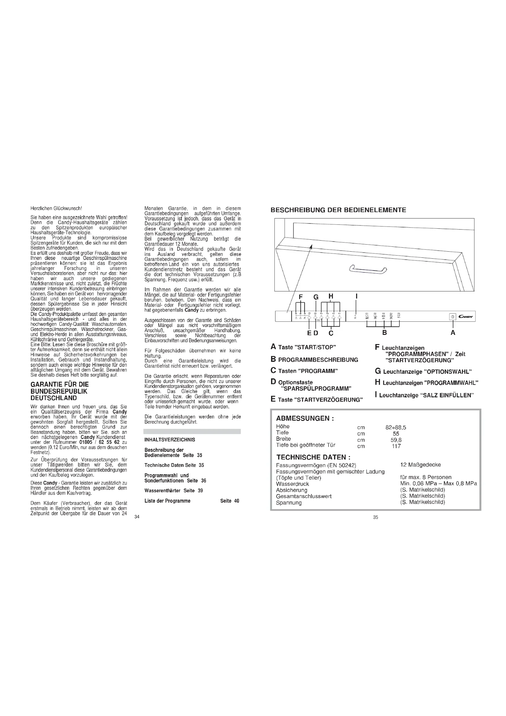 BUNDESREPUBLIK DEUTSCHLAND Wir danken Ihnen und freuen uns, das Sie ein Qualitätserzeugnis der Firma Candy erworben haben. Ihr Gerät wurde mit der gewohnten Sorgfalt hergestellt. Sollten Sie dennoch einen berechtigten Grund zur Beanstandung haben, bitten wir Sie, sich an den nächstgelegenen Candy Kundendienst unter der Rufnummer 01805 / 62 55 62 zu wenden (0,12 Euro/MIn, nur aus dem deuschen Festnetz). Zur Überprüfung der Voraussetzungen für unser Tätigwerden bitten wir Sie, dem Kundendienstpersonal diese Garantiebedingungen und den Kaufbeleg vorzulegen. Diese Candy - Garantie leisten wir zusätzlich zu Ihren gesetzlichen Rechten gegenüber dem Händler aus dem Kaufvertrag. Dem Käufer (Verbraucher), der das Gerät erstmals in Betrieb nimmt, leisten wir ab dem Zeitpunkt der Übergabe für die Dauer von 24 Monaten Garantie, in dem in diesem Garantiebedingungen aufgeführten Umfange. Voraussetzung ist jedoch, dass das Gerät in Deutschland gekauft wurde und außerdem diese Garantiebedingungen zusammen mit dem Kaufbeleg vorgelegt werden. Bei gewerblicher Nutzung beträgt die Garantiedauer 12 Monate. Wird das in Deutschland gekaufte Gerät ins Ausland verbracht, gelten diese Garantiebedingungen auch, sofern im betroffenen Land ein von uns autorisiertes Kundendienstnetz besteht und das Gerät die dort technischen Voraussetzungen (z.B Spannung, Frequenz usw.) erfüllt. Im Rahmen der Garantie werden wir alle Mängel, die auf Material- oder Fertigungsfehler beruhen, beheben. Den Nachweis, dass ein Material- oder Fertigungsfehler nicht vorliegt, hat gegebenenfalls Candy zu erbringen. Ausgeschlossen von der Garantie sind Schäden oder Mängel aus nicht vorschriftsmäßigem Anschluß, unsachgemäßer Handhabung, Verschleiss sowie Nichtbeachtung der Einbauvorschriften und Bedienungsanweisungen. Für Folgeschäden übernehmen wir keine Haftung. Durch eine Garantieleistung wird die Garantiefrist nicht erneuert bzw. verlängert. Die Garantie erlischt, wenn Reparaturen oder Eingriffe durch Personen, die nicht zu unserer Kundendienstorganisation gehören, vorgenommen werden. Das Gleiche gilt, wenn das Typenschild, bzw. die Gerätenummer entfernt oder unleserlich gemacht wurde, oder wenn Teile fremder Herkunft eingebaut werden. Die Garantieleistungen werden ohne jede Berechnung durchgeführt. INHALTSVERZEICHNIS Beschreibung der Bedienelemente Seite 35 Technische Daten Seite 35 Programmwahl und Sonderfunktionen Seite 36 Wasserenth