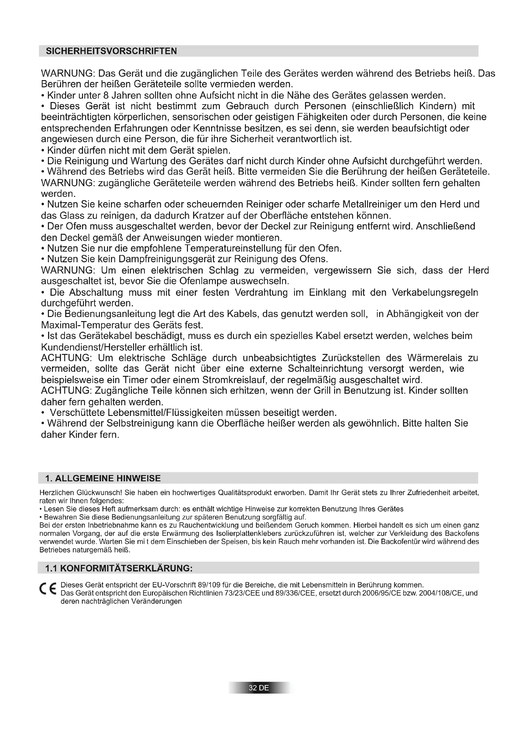 - Während der Selbstreinigung kann die Oberfläche heißer werden als gewöhnlich. Bitte halten Sie daher Kinder fern. SICHERHEITSVORSCHRIFTEN 32 DE