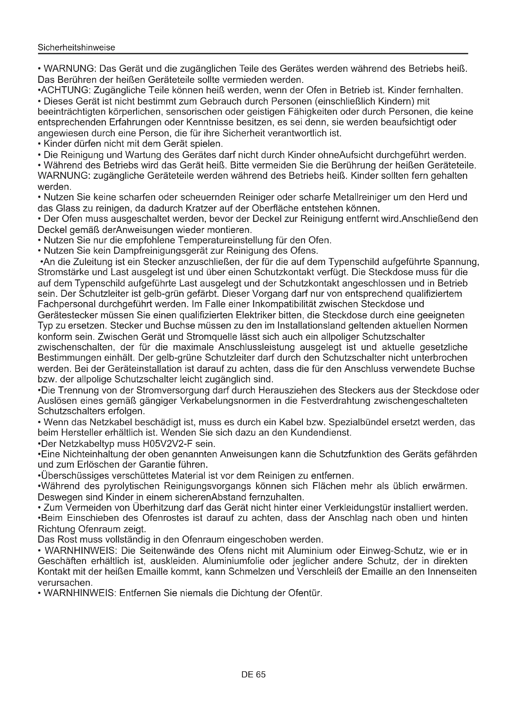 - WARNHINWEIS: Entfernen Sie niemals die Dichtung der Ofentür. Sicherheitshinweise DE 65Zusammenfassung DE 66 Reinigung und Wartung des Backofens Allgemeine Anweisungen