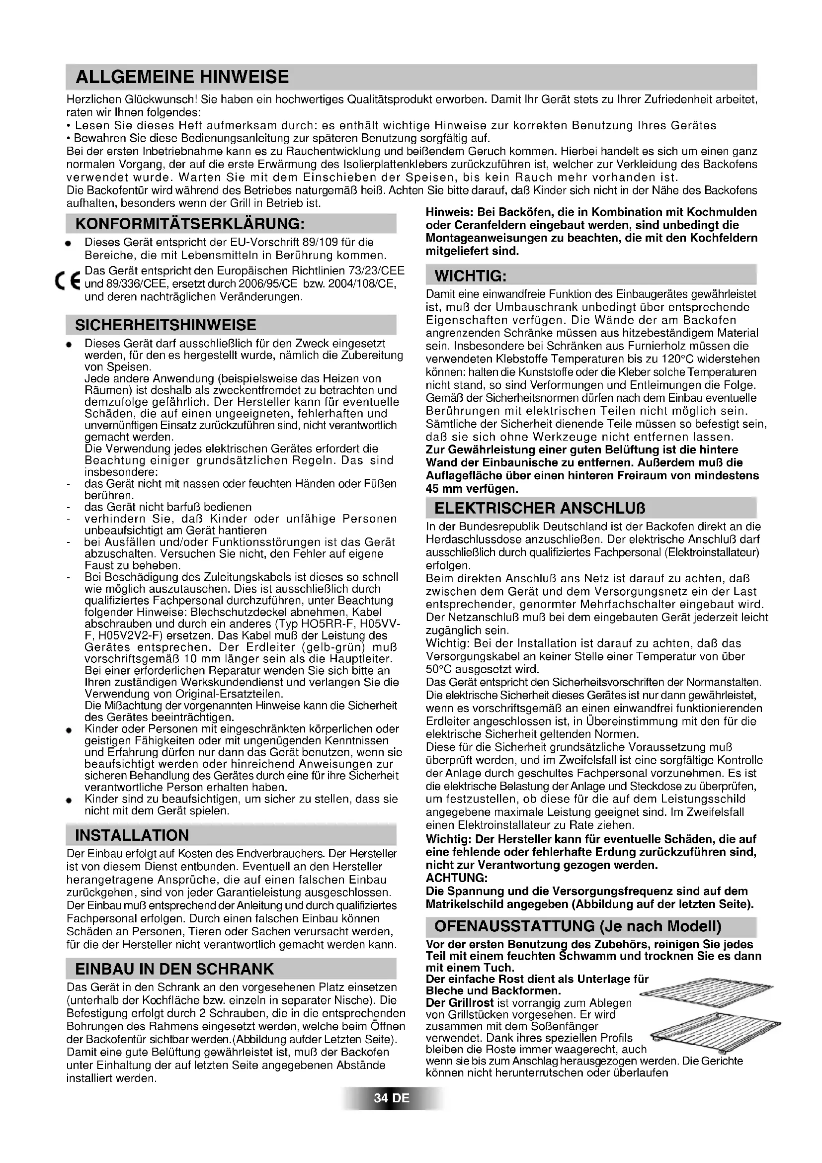 - Bewahren Sie diese Bedienungsanleitung zur späteren Benutzung sorgfältig auf. Bei der ersten Inbetriebnahme kann es zu Rauchentwicklung und beißendem Geruch kommen. Hierbei handelt es sich um einen ganz normalen Vorgang, der auf die erste Erwärmung des Isolierplattenklebers zurückzuführen ist, welcher zur Verkleidung des Backofens verwendet wurde. Warten Sie mit dem Einschieben der Speisen, bis kein Rauch mehr vorhanden ist. Die Backofentür wird während des Betriebes naturgemäß heiß. Achten Sie bitte darauf, daß Kinder sich nicht in der Nähe des Backofens aufhalten, besonders wenn der Grill in Betrieb ist. ALLGEMEINE HINWEISE 34 DE Hinweis: Bei Backöfen, die in Kombination mit Kochmulden oder Ceranfeldern eingebaut werden, sind unbedingt die Montageanweisungen zu beachten, die mit den Kochfeldern mitgeliefert sind. WICHTIG: Damit eine einwandfreie Funktion des Einbaugerätes gewährleistet ist, muß der Umbauschrank unbedingt über entsprechende Eigenschaften verfügen. Die Wände der am Backofen angrenzenden Schränke müssen aus hitzebeständigem Material sein. Insbesondere bei Schränken aus Furnierholz müssen die verwendeten Klebstoffe Temperaturen bis zu 120°C widerstehen können: halten die Kunststoffe oder die Kleber solche Temperaturen nicht stand, so sind Verformungen und Entleimungen die Folge. Gemäß der Sicherheitsnormen dürfen nach dem Einbau eventuelle Berührungen mit elektrischen Teilen nicht möglich sein. Sämtliche der Sicherheit dienende Teile müssen so befestigt sein, daß sie sich ohne Werkzeuge nicht entfernen lassen. Zur Gewährleistung einer guten Belüftung ist die hintere Wand der Einbaunische zu entfernen. Außerdem muß die Auflagefläche über einen hinteren Freiraum von mindestens 45 mm verfügen. ELEKTRISCHER ANSCHLUß In der Bundesrepublik Deutschland ist der Backofen direkt an die Herdaschlussdose anzuschließen. Der elektrische Anschluß darf ausschließlich durch qualifiziertes Fachpersonal (Elektroinstallateur) erfolgen. Beim direkten Anschluß ans Netz ist darauf zu achten, daß zwischen dem Gerät und dem Versorgungsnetz ein der Last entsprechender, genormter Mehrfachschalter eingebaut wird. Der Netzanschluß muß bei dem eingebauten Gerät jederzeit leicht zugänglich sein. Wichtig: Bei der Installation ist darauf zu achten, daß das Versorgungskabel an keiner Stelle einer Temperatur von über 50°C ausgesetzt wird. Das Gerät entspricht den Sicherheitsvorschriften der Normanstalten. Die elektrische Sicherheit dieses Gerätes ist nur dann gewährleistet, wenn es vorschriftsgemäß an einen einwandfrei funktionierenden Erdleiter angeschlossen ist, in Übereinstimmung mit den für die elektrische Sicherheit geltenden Normen. Diese für die Sicherheit grundsätzliche Voraussetzung muß überprüft werden, und im Zweifelsfall ist eine sorgfältige Kontrolle der Anlage durch geschultes Fachpersonal vorzunehmen. Es ist die elektrische Belastung der Anlage und Steckdose zu überprüfen, um festzustellen, ob diese für die auf dem Leistungsschild angegebene maximale Leistung geeignet sind. Im Zweifelsfall einen Elektroinstallateur zu Rate ziehen. Wichtig: Der Hersteller kann für eventuelle Schäden, die auf eine fehlende oder fehlerhafte Erdung zurückzuführen sind, nicht zur Verantwortung gezogen werden. ACHTUNG: Die Spannung und die Versorgungsfrequenz sind auf dem Matrikelschild angegeben (Abbildung auf der letzten Seite). KONFORMITÄTSERKLÄRUNG: Dieses Gerät entspricht der EU-Vorschrift 89/109 für die Bereiche, die mit Lebensmitteln in Berührung kommen. Das Gerät entspricht den Europäischen Richtlinien 73/23/CEE und 89/336/CEE, ersetzt durch 2006/95/CE bzw. 2004/108/CE, und deren nachträglichen Veränderungen. SICHERHEITSHINWEISE Dieses Gerät darf ausschließlich für den Zweck eingesetzt werden, für den es hergestellt wurde, nämlich die Zubereitung von Speisen. Jede andere Anwendung (beispielsweise das Heizen von Räumen) ist deshalb als zweckentfremdet zu betrachten und demzufolge gefährlich. Der Hersteller kann für eventuelle Schäden, die auf einen ungeeigneten, fehlerhaften und unvernünftigen Einsatz zurückzuführen sind, nicht verantwortlich gemacht werden. Die Verwendung jedes elektrischen Gerätes erfordert die Beachtung einiger grundsätzlichen Regeln. Das sind insbesondere: - das Gerät nicht mit nassen oder feuchten Händen oder Füßen berühren. - das Gerät nicht barfuß bedienen - verhindern Sie, daß Kinder oder unfähige Personen unbeaufsichtigt am Gerät hantieren - bei Ausfällen und/oder Funktionsstörungen ist das Gerät abzuschalten. Versuchen Sie nicht, den Fehler auf eigene Faust zu beheben. - Bei Beschädigung des Zuleitungskabels ist dieses so schnell wie möglich auszutauschen. Dies ist ausschließlich durch qualifiziertes Fachpersonal durchzuführen, unter Beachtung folgender Hinweise: Blechschutzdeckel abnehmen, Kabel abschrauben und durch ein anderes (Typ HO5RR-F, H05VV- F, H05V2V2-F) ersetzen. Das Kabel muß der Leistung des Gerätes entsprechen. Der Erdleiter (gelb-grün) muß vorschriftsgemäß 10 mm länger sein als die Hauptleiter. Bei einer erforderlichen Reparatur wenden Sie sich bitte an Ihren zuständigen Werkskundendienst und verlangen Sie die Verwendung von Original-Ersatzteilen. Die Mißachtung der vorgenannten Hinweise kann die Sicherheit des Gerätes beeinträchtigen. Kinder oder Personen mit eingeschränkten körperlichen oder geistigen Fähigkeiten oder mit ungenügenden Kenntnissen und Erfahrung dürfen nur dann das Gerät benutzen, wenn sie beaufsichtigt werden oder hinreichend Anweisungen zur sicheren Behandlung des Gerätes durch eine für ihre Sicherheit verantwortliche Person erhalten haben. Kinder sind zu beaufsichtigen, um sicher zu stellen, dass sie nicht mit dem Gerät spielen. INSTALLATION Der Einbau erfolgt auf Kosten des Endverbrauchers. Der Hersteller ist von diesem Dienst entbunden. Eventuell an den Hersteller herangetragene Ansprüche, die auf einen falsc