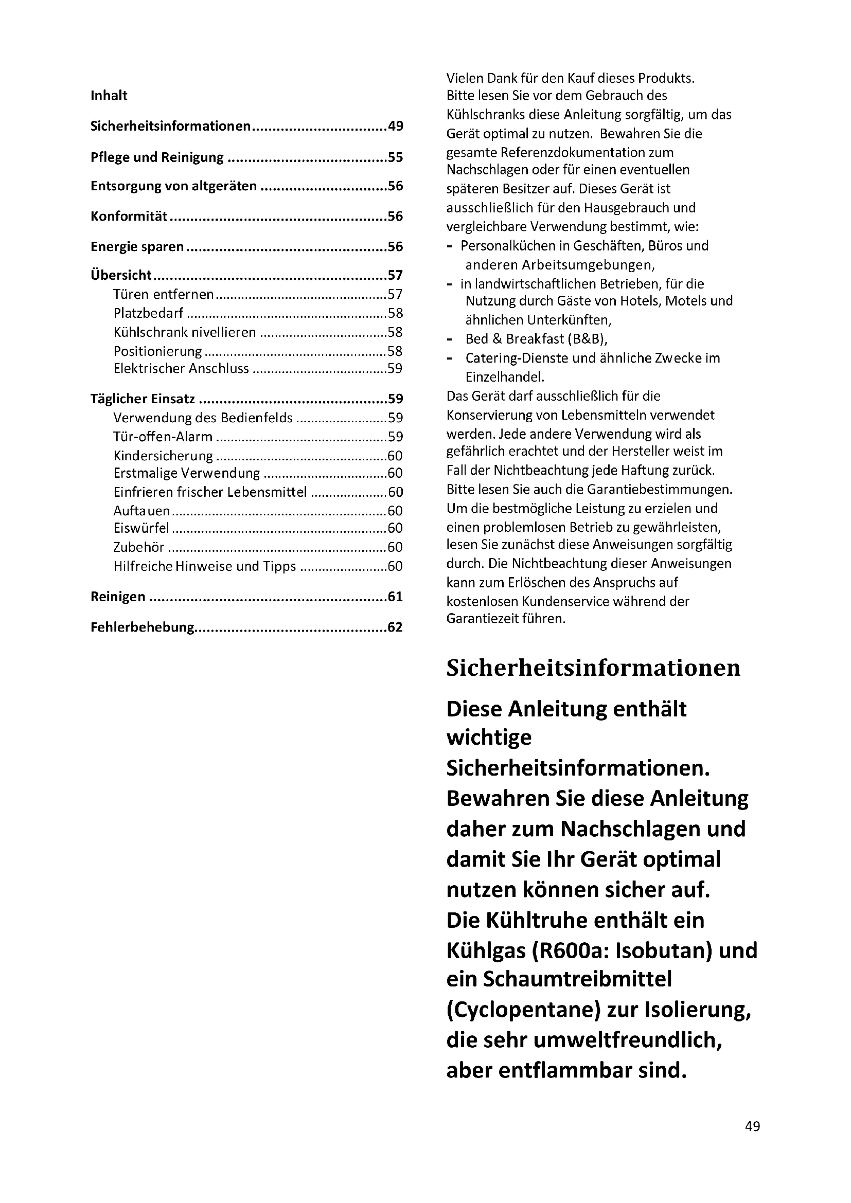 Vielen Dank für den Kauf dieses Produkts. Bitte lesen Sie vor dem Gebrauch des Kühlschranks diese Anleitung sorgfältig, um das Gerät optimal zu nutzen. Bewahren Sie die gesamte Referenzdokumentation zum Nachschlagen oder für einen eventuellen späteren Besitzer auf. Dieses Gerät ist ausschließlich für den Hausgebrauch und vergleichbare Verwendung bestimmt, wie: - Personalküchen in Geschäften, Büros und anderen Arbeitsumgebungen, - in landwirtschaftlichen Betrieben, für die Nutzung durch Gäste von Hotels, Motels und ähnlichen Unterkünften, - Bed & Breakfast (B&B), - Catering-Dienste und ähnliche Zwecke im Einzelhandel. Das Gerät darf ausschließlich für die Konservierung von Lebensmitteln verwendet werden. Jede andere Verwendung wird als gefährlich erachtet und der Hersteller weist im Fall der Nichtbeachtung jede Haftung zurück. Bitte lesen Sie auch die Garantiebestimmungen. Um die bestmögliche Leistung zu erzielen und einen problemlosen Betrieb zu gewährleisten, lesen Sie zunächst diese Anweisungen sorgfältig durch. Die Nichtbeachtung dieser Anweisungen kann zum Erlöschen des Anspruchs auf kostenlosen Kundenservice während der Garantiezeit führen. Sicherheitsinformationen Diese Anleitung enthält wichtige Sicherheitsinformationen. Bewahren Sie diese Anleitung daher zum Nachschlagen und damit Sie Ihr Gerät optimal nutzen können sicher auf. Die Kühltruhe enthält ein Kühlgas (R600a: Isobutan) und ein Schaumtreibmittel (Cyclopentane) zur Isolierung, die sehr umweltfreundlich, aber entflammbar sind.50 Vorsicht: Feuergefahr Wenn der Kühlkreislauf beschädigt wird: