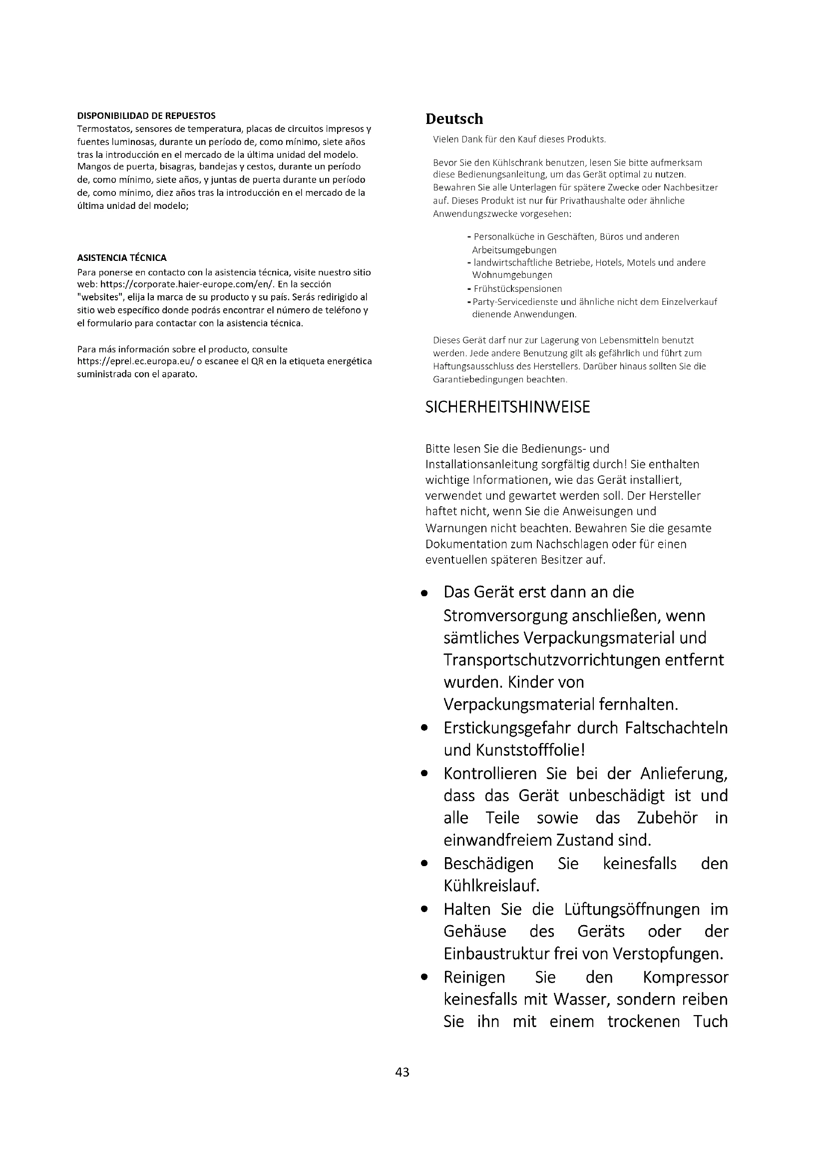 Um die technische Unterstützung zu kontaktieren, besuchen Sie unsere Website: https://corporate.haier-europe.com/en/ . Wählen Sie im Bereich „Website“ die Marke Ihres Produkts und Ihr Land aus. Sie werden auf die jeweilige Website weitergeleitet, auf der Sie die Telefonnummer und das Formular finden, um die technische Unterstützung zu kontaktieren