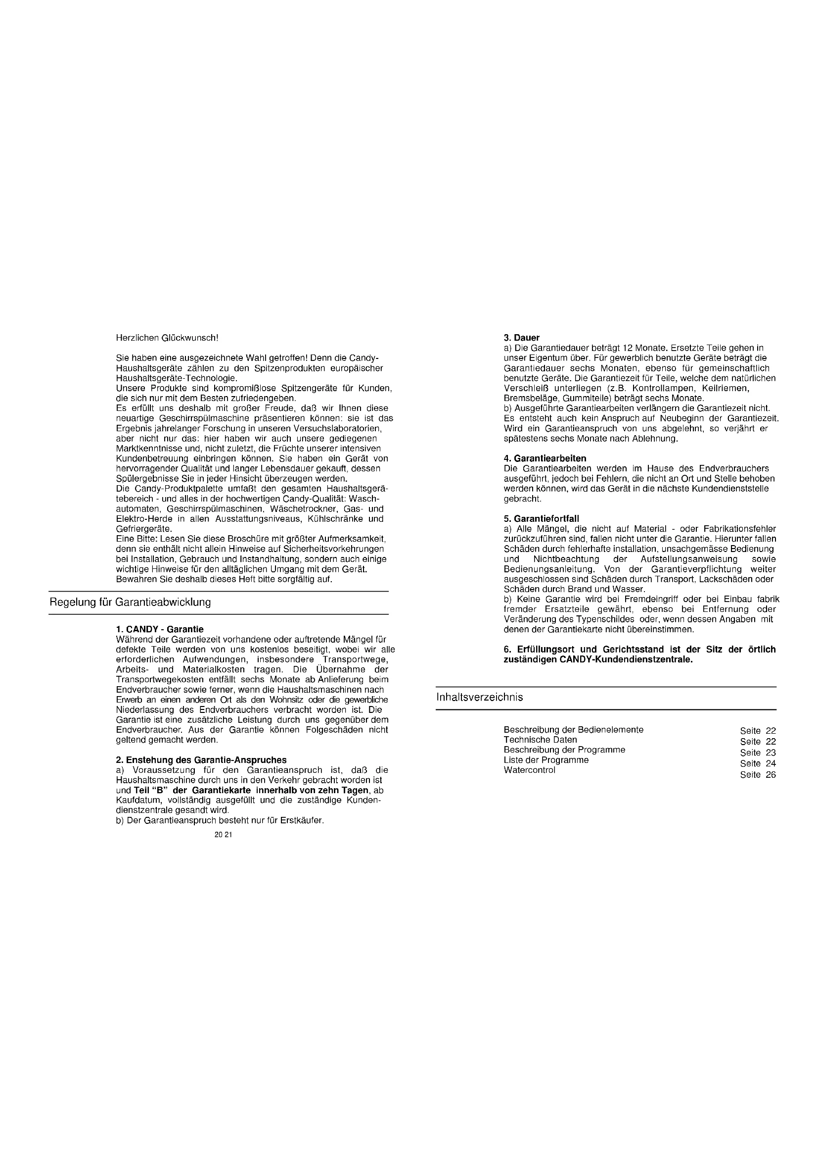 zuständigen CANDY-Kundendienstzentrale. Beschreibung der Bedienelemente Technische Daten Beschreibung der Programme Liste der Programme Watercontrol Regelung für Garantieabwicklung Seite 22 Seite 22 Seite 23 Seite 24 Seite 26 Inhaltsverzeichnis Herzlichen Glückwunsch! Sie haben eine ausgezeichnete Wahl getroffen! Denn die Candy- Haushaltsgeräte zählen zu den Spitzenprodukten europäischer Haushaltsgeräte-Technologie. Unsere Produkte sind kompromißlose Spitzengeräte für Kunden, die sich nur mit dem Besten zufriedengeben. Es erfüllt uns deshalb mit großer Freude, daß wir Ihnen diese neuartige Geschirrspülmaschine präsentieren können: sie ist das Ergebnis jahrelanger Forschung in unseren Versuchslaboratorien, aber nicht nur das: hier haben wir auch unsere gediegenen Marktkenntnisse und, nicht zuletzt, die Früchte unserer intensiven Kundenbetreuung einbringen können. Sie haben ein Gerät von hervorragender Qualität und langer Lebensdauer gekauft, dessen Spülergebnisse Sie in jeder Hinsicht überzeugen werden. Die Candy-Produktpalette umfaßt den gesamten Haushaltsgerä- tebereich - und alles in der hochwertigen Candy-Qualität: Wasch- automaten, Geschirrspülmaschinen, Wäschetrockner, Gas- und Elektro-Herde in allen Ausstattungsniveaus, Kühlschränke und Gefriergeräte. Eine Bitte: Lesen Sie diese Broschüre mit größter Aufmerksamkeit, denn sie enthält nicht allein Hinweise auf Sicherheitsvorkehrungen bei Installation, Gebrauch und Instandhaltung, sondern auch einige wichtige Hinweise für den alltäglichen Umgang mit dem Gerät. Bewahren Sie deshalb dieses Heft bitte sorgfältig auf.
