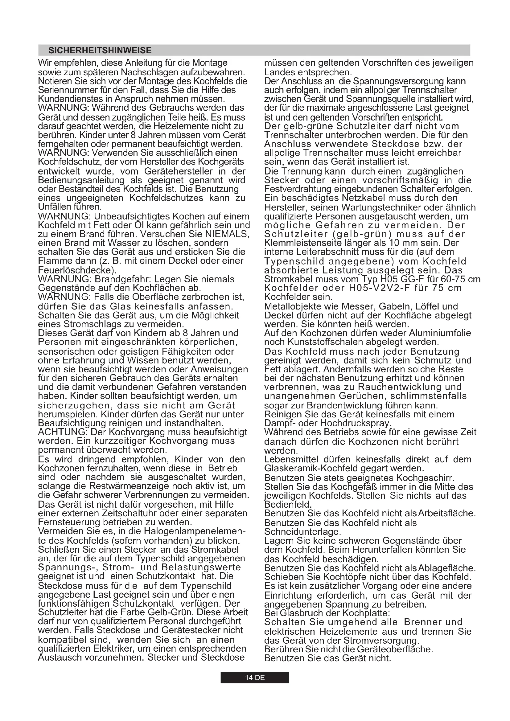 814 g/h 220-240V 50/60Hz -14 DE WARNUNG: Unbeaufsichtigtes Kochen auf einem Kochfeld mit Fett oder Öl kann gefährlich sein und zu einem Brand führen. Versuchen Sie NIEMALS, einen Brand mit Wasser zu löschen, sondern schalten Sie das Gerät aus und ersticken Sie die Flamme dann (z. B. mit einem Deckel oder einer Feuerlöschdecke). WARNUNG: Falls die Oberfläche zerbrochen ist, dürfen Sie das Glas keinesfalls anfassen. Schalten Sie das Gerät aus, um die Möglichkeit eines Stromschlags zu vermeiden. Wir empfehlen, diese Anleitung für die Montage sowie zum späteren Nachschlagen aufzubewahren. Notieren Sie sich vor der Montage des Kochfelds die Seriennummer für den Fall, dass Sie die Hilfe des Kundendienstes in Anspruch nehmen müssen. WARNUNG: Brandgefahr: Legen Sie niemals Gegenstände auf den Kochflächen ab. Dieses Gerät darf von Kindern ab 8 Jahren und Personen mit eingeschränkten körperlichen, sensorischen oder geistigen Fähigkeiten oder ohne Erfahrung und Wissen benutzt werden, wenn sie beaufsichtigt werden oder Anweisungen für den sicheren Gebrauch des Geräts erhalten und die damit verbundenen Gefahren verstanden haben. Kinder sollten beaufsichtigt werden, um sicherzugehen, dass sie nicht am Gerät herumspielen. Kinder dürfen das Gerät nur unter Beaufsichtigung reinigen und instandhalten. Vermeiden Sie es, in die Halogenlampenelemen te des Kochfelds (sofern vorhanden) zu blicken.