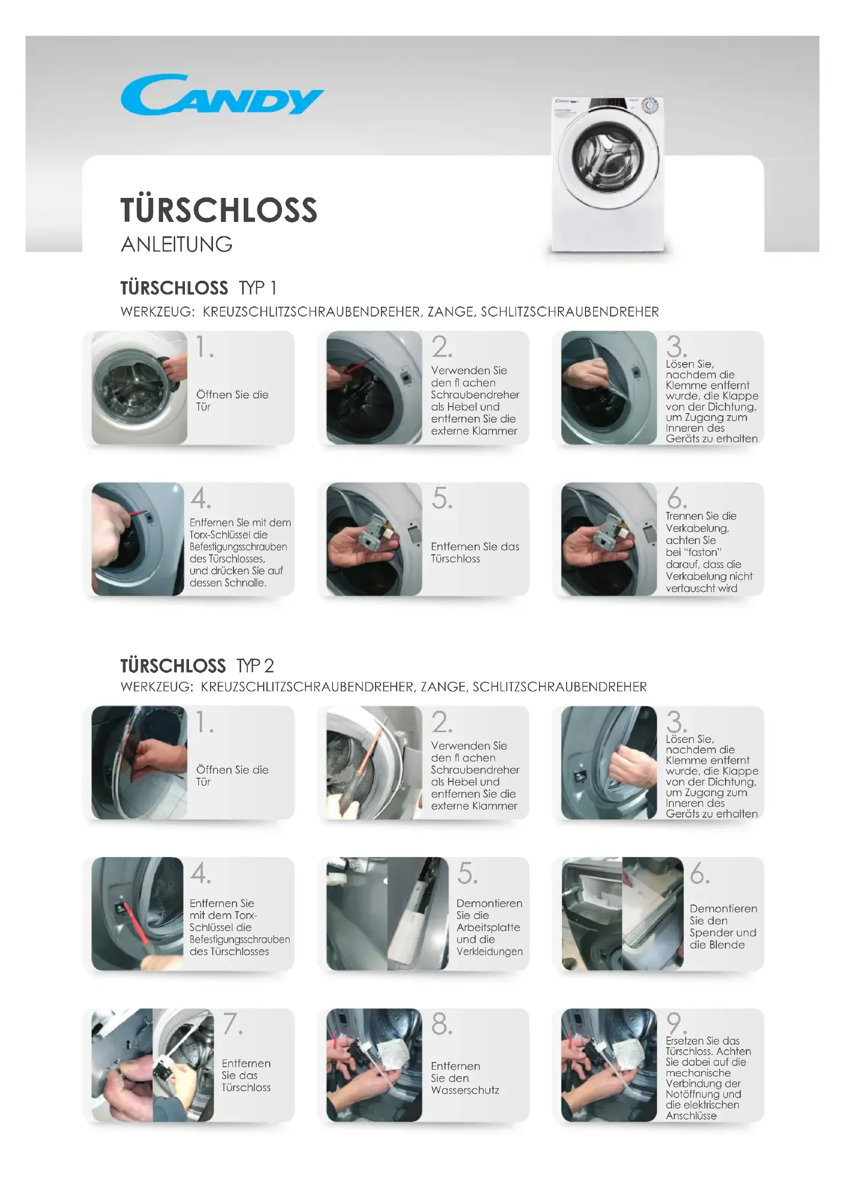 TÜR TYP 1 WERKZEUG: 25er TORX-SCHLÜSSEL TÜR TYP 2 WERKZEUG: 25er TORX-SCHLÜSSEL, FLEXIBLER 7er ROHRSCHLÜSSEL TÜR ANLEITUNGloading-circle-11. Öffnen Sie die Tür Verwenden Sie den fl achen Schraubendreher als Hebel und entfernen Sie die externe Klammer Lösen Sie, nachdem die Klemme entfernt wurde, die Klappe von der Dichtung, um Zugang zum Inneren des Geräts zu erhalten Entfernen Sie mit dem Torx-Schlüssel die Befestigungsschrauben des Türschlosses