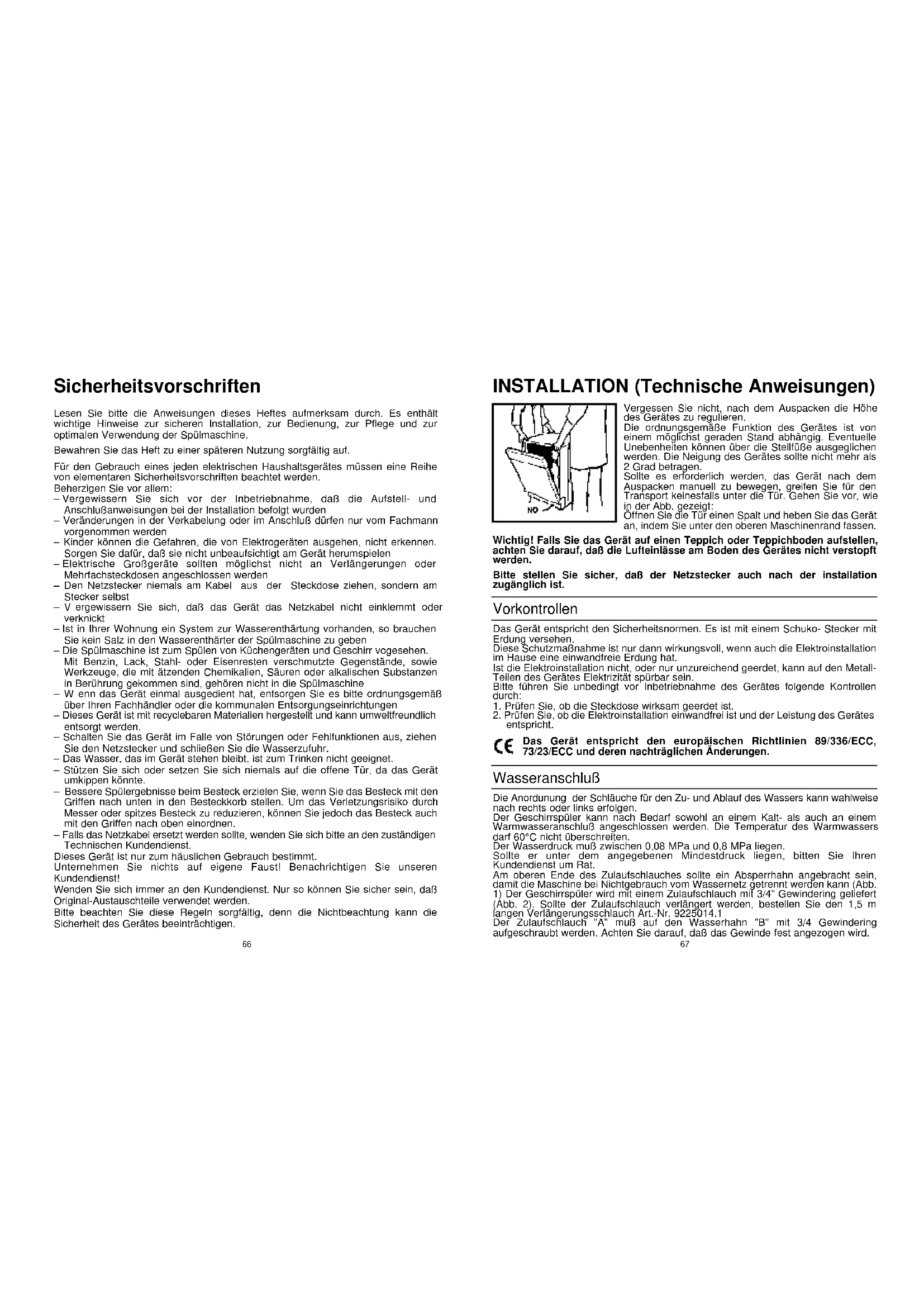 Sicherheitsvorschriften Lesen Sie bitte die Anweisungen dieses Heftes aufmerksam durch. Es enthält wichtige Hinweise zur sicheren Installation, zur Bedienung, zur Pflege und zur optimalen Verwendung der Spülmaschine. Bewahren Sie das Heft zu einer späteren Nutzung sorgfältig auf. Für den Gebrauch eines jeden elektrischen Haushaltsgerätes müssen eine Reihe von elementaren Sicherheitsvorschriften beachtet werden. Beherzigen Sie vor allem: – Vergewissern Sie sich vor der Inbetriebnahme, daß die Aufstell- und Anschlußanweisungen bei der Installation befolgt wurden – Veränderungen in der Verkabelung oder im Anschluß dürfen nur vom Fachmann vorgenommen werden – Kinder können die Gefahren, die von Elektrogeräten ausgehen, nicht erkennen. Sorgen Sie dafür, daß sie nicht unbeaufsichtigt am Gerät herumspielen – Elektrische Großgeräte sollten möglichst nicht an Verlängerungen oder Mehrfachsteckdosen angeschlossen werden – Den Netzstecker niemals am Kabel aus der Steckdose ziehen, sondern am Stecker selbst –Vergewissern Sie sich, daß das Gerät das Netzkabel nicht einklemmt oder verknickt – Ist in Ihrer Wohnung ein System zur Wasserenthärtung vorhanden, so brauchen Sie kein Salz in den Wasserenthärter der Spülmaschine zu geben – Die Spülmaschine ist zum Spülen von Küchengeräten und Geschirr vogesehen. Mit Benzin, Lack, Stahl- oder Eisenresten verschmutzte Gegenstände, sowie Werkzeuge, die mit ätzenden Chemikalien, Säuren oder alkalischen Substanzen in Berührung gekommen sind, gehören nicht in die Spülmaschine –Wenn das Gerät einmal ausgedient hat, entsorgen Sie es bitte ordnungsgemäß über Ihren Fachhändler oder die kommunalen Entsorgungseinrichtungen – Dieses Gerät ist mit recyclebaren Materialien hergestellt und kann umweltfreundlich entsorgt werden. – Schalten Sie das Gerät im Falle von Störungen oder Fehlfunktionen aus, ziehen Sie den Netzstecker und schließen Sie die Wasserzufuhr. – Das Wasser, das im Gerät stehen bleibt, ist zum Trinken nicht geeignet. – Stützen Sie sich oder setzen Sie sich niemals auf die offene Tür, da das Gerät umkippen könnte. – Bessere Spülergebnisse beim Besteck erzielen Sie, wenn Sie das Besteck mit den Griffen nach unten in den Besteckkorb stellen. Um das Verletzungsrisiko durch Messer oder spitzes Besteck zu reduzieren, können Sie jedoch das Besteck auch mit den Griffen nach oben einordnen. – Falls das Netzkabel ersetzt werden sollte, wenden Sie sich bitte an den zuständigen Technischen Kundendienst. Dieses Gerät ist nur zum häuslichen Gebrauch bestimmt. Unternehmen Sie nichts auf eigene Faust! Benachrichtigen Sie unseren Kundendienst! Wenden Sie sich immer an den Kundendienst. Nur so können Sie sicher sein, daß Original-Austauschteile verwendet werden. Bitte beachten Sie diese Regeln sorgfältig, denn die Nichtbeachtung kann die Sicherheit des Gerätes beeinträchtigen.Anschluß an den Wasserablauf Das Schlauchende in dem festen Ablauf befestigen. Der Schlauch darf nicht geknickt werden, damit der Wasserablauf nicht verhindert wird (Abb. 4). Das Innendurchmesser des Ablaufrohres muß mindestens 4 cm betragen und bei einer Höhe von mindestens 40 cm liegen. Es wird empfohlen, einen Siphon zu verwenden (Abb. 4 x). Falls erforderlich kann der Ablaufschlauch bis zu 2,6 m verlängert werden, wobei die Höhe vom Boden mindestens 85 cm betragen muß. Bei Bedarf bestellen Sie den Verlängerungsschlauch Art.-Nr. 9269214 und das dazugehörige Verbindungsstück Art.-Nr. 9264427.Das gebogene Schlauchende kann auch am Spülbeckenrand eingehängt werden. Achten Sie darauf, daß der Schlauch nicht im Wasser getaucht wird, um einen Rücklauf des Wassers beim Spülen zu verhindern (Abb. 4 y). Soll das Gerät untergebaut werden, muß der Krümmer des Ablaufschlauches direkt unter der Arbeitsplatte an der höchstmögliche Stelle angebracht werden (Abb. 4 z).