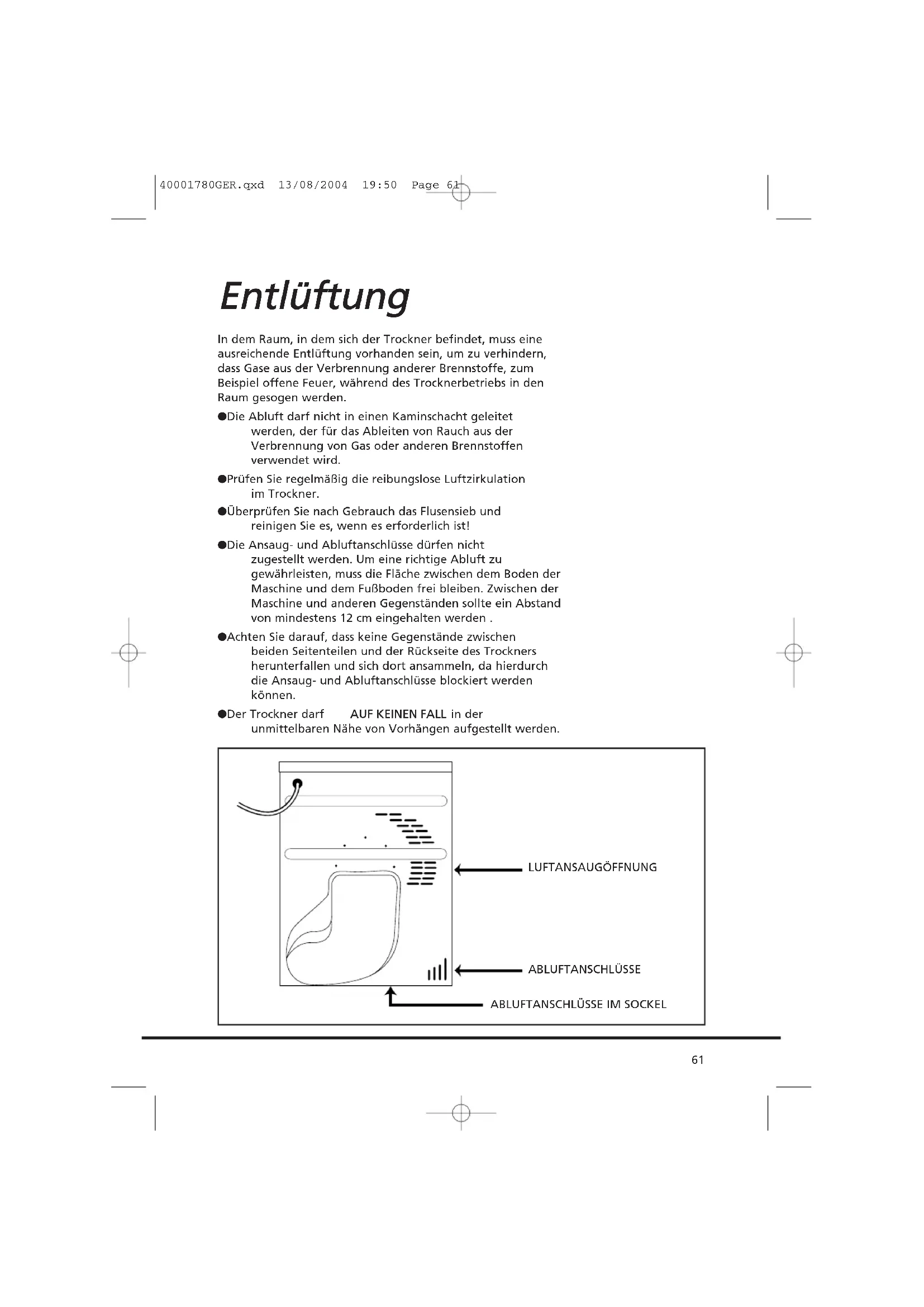 FFaallllss eeiinn PPrroobblleemm mmiitt IIhhrreerr MMaasscchhiinnee dduurrcchh ffaallsscchhee IInnssttaallllaattiioonn vveerruurrssaacchhtt wwiirrdd,, mmüüsssseenn SSiiee RReeppaarraattuurraarrbbeeiitteenn mmöögglliicchheerrwweeiissee sseellbbsstt bbeezzaahhlleenn.. SSoollllttee ddaass NNeettzzaannsscchhlluusssskkaabbee ll aann ddiieesseemm GGeerräätt bbeesscchhääddiiggtt sseeiinn,, mmuussss eess dduurrcchh eeiinn ssppeezziieelllleess KKaabbeell eerrsseettzztt wweerrddeenn,, ddaass NNUURR bbeeiimm EErrssaattzztteeiillsseerrvviiccee eerrhhäällttlliicchh iisstt.. EEss mmuussss vvoonn eeiinneerr ffaacchhkkuunnddiiggeenn PPeerrssoonn iinnssttaalllliieerrtt wweerrddeenn.. IInnssttaallllaattiioonn SScchhlliieeßßeenn SSiiee ddiiee MMaasscchhiinnee eerrsstt aann uunndd ddrrüücckkeenn SSiiee ddiiee EEiinnsscchhaallttttaassttee eerrsstt,, wweennnn ddiiee IInnssttaallllaattiioonn aabbggeesscchhlloosssseenn iisstt.. ZZuu IIhhrreerr eeiiggeenneenn SSiicchheerrhheeiitt mmuussss ddeerr TTrroocckknneerr rriicchhttiigg iinnssttaalllliieerrtt wweerrddeenn.. SSoolllltteenn SSiiee bbeezzüügglliicchh ddeerr IInnssttaallllaattiioonn FFrraaggeenn hhaabbeenn,, wweennddeenn SSiiee ssiicchh aann ddeenn GGIIAASS--SSeerrvviiccee.. 40001780GER.qxd 13/08/2004 19:50 Page 60In dem Raum, in dem sich der Trockner befindet, muss eine ausreichende Entlüftung vorhanden sein, um zu verhindern, dass Gase aus der Verbrennung anderer Brennstoffe, zum Beispiel offene Feuer, während des Trocknerbetriebs in den Raum gesogen werden. ● Die Abluft darf nicht in einen Kaminschacht geleitet werden, der für das Ableiten von Rauch aus der Verbrennung von Gas oder anderen Brennstoffen verwendet wird. ● Prüfen Sie regelmäßig die reibungslose Luftzirkulation im Trockner. ● Überprüfen Sie nach Gebrauch das Flusensieb und reinigen Sie es, wenn es erforderlich ist! ● Die Ansaug- und Abluftanschlüsse dürfen nicht zugestellt werden. Um eine richtige Abluft zu gewährleisten, muss die Fläche zwischen dem Boden der Maschine und dem Fußboden frei bleiben. Zwischen der Maschine und anderen Gegenständen sollte ein Abstand von mindestens 12 cm eingehalten werden . ● Achten Sie darauf, dass keine Gegenstände zwischen beiden Seitenteilen und der Rückseite des Trockners herunterfallen und sich dort ansammeln, da hierdurch die Ansaug- und Abluftanschlüsse blockiert werden können. ● Der Trockner darf