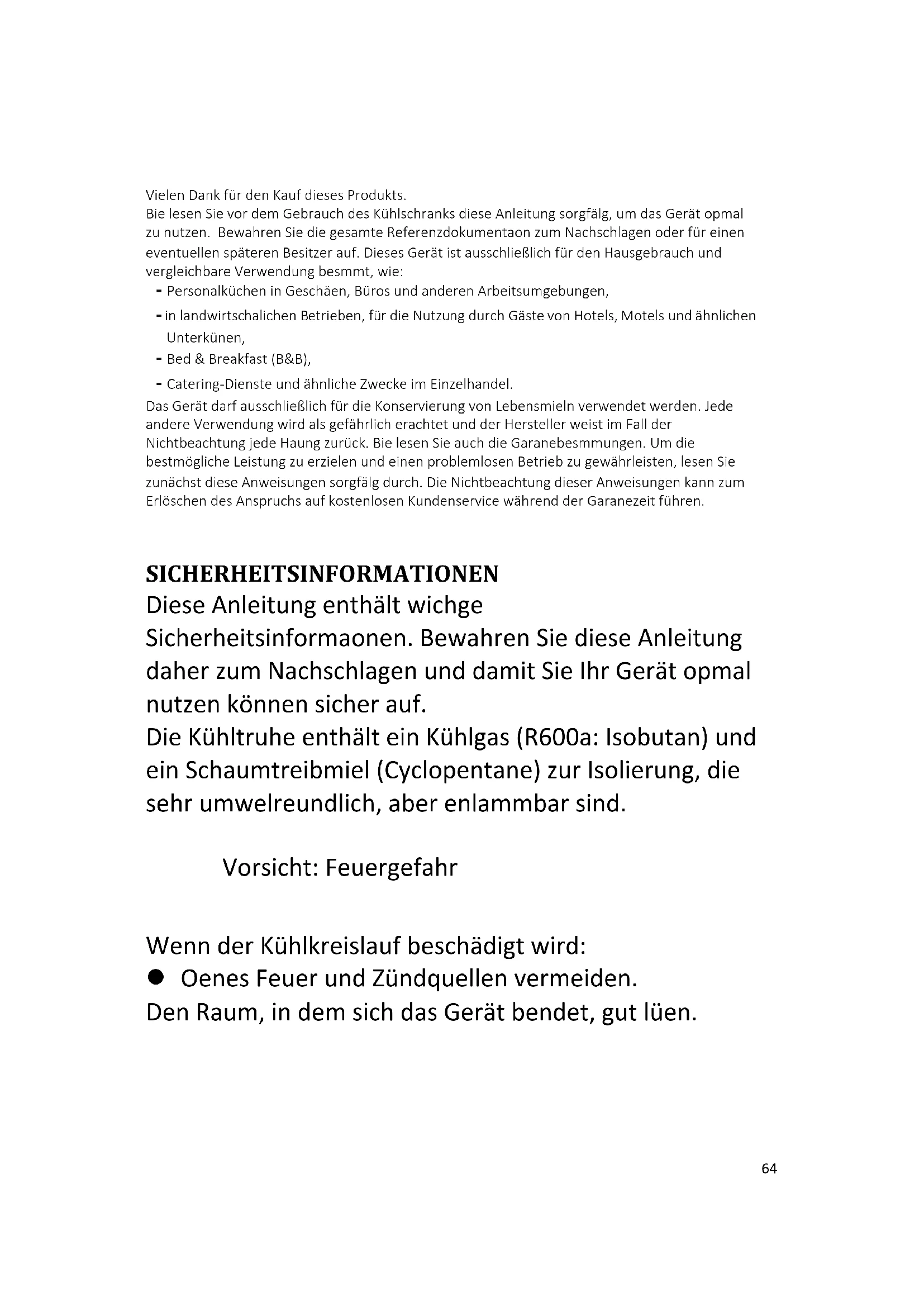 - FEHLERSUCHE Vielen Dank für den Kauf dieses Produkts. Bitte lesen Sie vor dem Gebrauch des Kühlschranks diese Anleitung sorgfältig, um das Gerät optimal zu nutzen. Bewahren Sie die gesamte Referenzdokumentation zum Nachschlagen oder für einen eventuellen späteren Besitzer auf. Dieses Gerät ist ausschließlich für den Hausgebrauch und vergleichbare Verwendung bestimmt, wie: - Personalküchen in Geschäften, Büros und anderen Arbeitsumgebungen, - in landwirtschaftlichen Betrieben, für die Nutzung durch Gäste von Hotels, Motels und ähnlichen Unterkünften, - Bed & Breakfast (B&B), - Catering-Dienste und ähnliche Zwecke im Einzelhandel. Das Gerät darf ausschließlich für die Konservierung von Lebensmitteln verwendet werden. Jede andere Verwendung wird als gefährlich erachtet und der Hersteller weist im Fall der Nichtbeachtung jede Haftung zurück. Bitte lesen Sie auch die Garantiebestimmungen. Um die bestmögliche Leistung zu erzielen und einen problemlosen Betrieb zu gewährleisten, lesen Sie zunächst diese Anweisungen sorgfältig durch. Die Nichtbeachtung dieser Anweisungen kann zum Erlöschen des Anspruchs auf kostenlosen Kundenservice während der Garantiezeit führen. SICHERHEITSINFORMATIONEN Diese Anleitung enthält wichtige Sicherheitsinformationen. Bewahren Sie diese Anleitung daher zum Nachschlagen und damit Sie Ihr Gerät optimal nutzen können sicher auf. Die Kühltruhe enthält ein Kühlgas (R600a: Isobutan) und ein Schaumtreibmittel (Cyclopentane) zur Isolierung, die sehr umweltfreundlich, aber entflammbar sind. Vorsicht: Feuergefahr Wenn der Kühlkreislauf beschädigt wird: Offenes Feuer und Zündquellen vermeiden. Den Raum, in dem sich das Gerät befindet, gut lüften. Anteil Laufzeiten: 18℃:Läuft 11 Min, stoppt 20 Min65 WARNUNG! Vorsicht beim Reinigen/Tragen des Geräts, sodass das Metall der Kühlschlaufen nicht berührt wird, da dies Finger und Hände verletzen oder das Gerät beschädigen könnte. Dieses Gerät ist nicht geeignet, um darauf oder darunter weitere Geräte zu stapeln. Nicht auf dem Gerät sitzen oder stehen, da es dafür nicht geeignet ist. Dies könnte zu Personenschäden führen oder das Gerät beschädigen. Darauf achten, dass das Stromkabel während und nach dem Tragen/Verschieben des Geräts nicht darunter stecken bleibt, damit es nicht beschädigt oder zerschnitten wird. Beim Aufstellen des Geräts darauf achten, dass der Fußboden, Leitungen, Wandverkleidungen usw. nicht beschädigt werden. Gerät nicht verschieben, indem an der Klappe oder am Griff gezogen wird. Erlauben Sie Kindern nicht mit dem Gerät zu spielen oder an den Bedienknöpfen herumzuspielen. Unser Unternehmen übernimmt keine Haftung, falls diese Anweisungen nicht befolgt werden. Das Gerät nicht in Umgebungen mit feuchter, öliger oder staubiger Atmosphäre installieren sowie vor direkter Sonneneinstrahlung und Wasser schützen. Das Gerät nicht in der Nähe von Hitzequellen oder entflammbaren Materialien installieren.66 Bei einem Stromausfall nicht die Klappe öffnen. Dauert der Stromausfall weniger als 20 Stunden an, wird die Tiefkühlware nicht beeinträchtigt. Dauert der Stromausfall länger, sollten die Lebensmittel überprüft und sofort verzehrt oder gekocht und erneut eingefroren werden. Lässt sich die Klappe der Kühltruhe schwierig öffnen, nachdem Sie diese gerade geschlossen haben, so ist dies normal. Dies liegt am Druckausgleich, der hergestellt wird. Die Klappe lässt sich normalerweise nach wenigen Minuten wieder öffnen. Das Gerät erst dann an die Stromversorgung anschließen, wenn sämtliches Verpackungsmaterial und Transportschutzvorrichtungen entfernt wurden. Das Gerät vor dem Einschalten mindestens vier Stunden lang stehen lassen, wenn es im Liegen transportiert wurde, damit sich das Kompressoröl absetzen kann. Diese Kühltruhe darf nur für den vorgesehenen Zweck (z.B. Lagern und Einfrieren von Lebensmitteln) verwendet werden. Keine Medikamente oder Materialien für wissenschaftliche Forschungen aufbewahren. Wird Material gelagert, das eine strenge Kontrolle der Lagertemperatur erfordert, so kann sich die Qualität verschlechtern oder es kann eine unvorhergesehene Reaktion auftreten, die zu67 Risiken führen kann. Vor jedem Eingriff am Gerät den Netzstecker ziehen. Bei der Lieferung überprüfen, ob das Produkt nicht beschädigt ist und ob alle Teile und Zubehör unversehrt sind. Wenn Sie am Kühlsystem ein Leck feststellen, nicht die Netzsteckdose berühren und unbedingt offenes Feuer vermeiden. Das Fenster öffnen und den Raum gut lüften. Wenden Sie sich an den Kundenservice, um das Gerät reparieren zu lassen. Zum Anschluss keine Verlängerungskabel und Adapter verwenden. Das Netzkabel nicht stark spannen oder biegen und den Netzstecker nicht mit nassen Händen berühren. Den Netzstecker und/oder das Netzkabel nicht beschädigen - Stromschlag- und Brandgefahr! Keine brennbaren und hoch flüchtigen Substanzen wie Äther, Benzin, Flüssiggas, Propan, Sprühdosen, Klebstoffe, reinen Alkohol usw. in der Kühltruhe aufbewahren - Explosionsgefahr! In der Nähe der Kühltruhe keine brennbaren Sprays wie z.B. Farbspraydosen aufbewahren. Es besteht Explosions- oder Brandgefahr. Keine Gegenstände oder mit Wasser gefüllten Behälter auf das Gerät stellen. Keine Verlängerungskabel und Mehrfachsteckleisten verwenden.68 Gerät nicht durch Verbrennen entsorgen. Darauf achten, dass die Kühlschleife des Geräts während des Transports oder im Betrieb nicht beschädigt wird. Bei einer Beschädigung das Gerät keinem offenen Feuer oder möglichen Zündquellen aussetzen und den Raum, in dem sich das Gerät befindet, sofort gut lüften. Das Kühlsystem an der Rückseite und im Inneren des Geräts enthält ein Kältemittel. Es muss daher darauf geachtet werden, die Leitungen nicht zu beschädigen. Im Inneren des Gefriergeräts keine elektrischen Geräte benutzen, es sei denn, sie sind vom Hersteller empfohlen. Den Kühlkreislauf nicht beschädigen. Ke