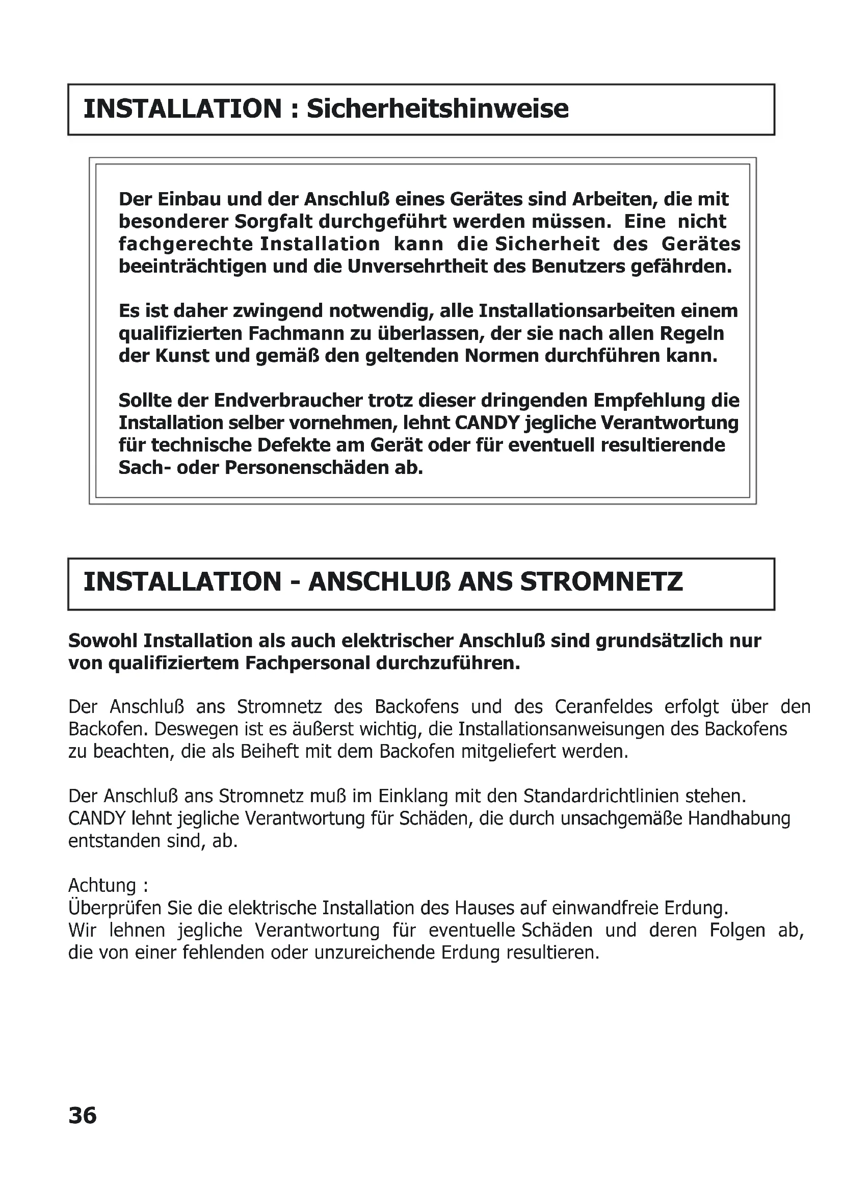 - . Problemlösungen INHALTSVERZEICHNIS36 INSTALLATION - ANSCHLUß ANS STROMNETZ Sowohl Installation als auch elektrischer Anschluß sind grundsätzlich nur von qualifiziertem Fachpersonal durchzuführen. Der Anschluß ans Stromnetz des Backofens und des Ceranfeldes erfolgt über den Backofen. Deswegen ist es äußerst wichtig, die Installationsanweisungen des Backofens zu beachten, die als Beiheft mit dem Backofen mitgeliefert werden. Der Anschluß ans Stromnetz muß im Einklang mit den Standardrichtlinien stehen. CANDY lehnt jegliche Verantwortung für Schäden, die durch unsachgemäße Handhabung entstanden sind, ab. Achtung : Überprüfen Sie die elektrische Installation des Hauses auf einwandfreie Erdung. Wir lehnen jegliche Verantwortung für eventuelle Schäden und deren Folgen ab, die von einer fehlenden oder unzureichende Erdung resultieren. Der Einbau und der Anschluß eines Gerätes sind Arbeiten, die mit besonderer Sorgfalt durchgeführt werden müssen. Eine nicht fachgerechte Installation kann die Sicherheit des Gerätes beeinträchtigen und die Unversehrtheit des Benutzers gefährden. Es ist daher zwingend notwendig, alle Installationsarbeiten einem qualifizierten Fachmann zu überlassen, der sie nach allen Regeln der Kunst und gemäß den geltenden Normen durchführen kann. Sollte der Endverbraucher trotz dieser dringenden Empfehlung die Installation selber vornehmen, lehnt CANDY jegliche Verantwortung für technische Defekte am Gerät oder für eventuell resultierende Sach- oder Personenschäden ab. INSTALLATION : Sicherheitshinweise37 Das Möbel oder die Arbeitsplatte, in die das Ceranfeld eingebaut werden soll, sowie die Wände der angrenzenden Möbel müssen aus hitzebeständigem Material bestehen. Insbesondere bei Schränken aus Furnierholz müssen die verwendeten Klebstoffe hitzebeständig sein, um Verformungen und Enltleimungen zu vermeiden. Installation: Der Abstand des Gerätes zu den angrenzenden Wänden muß mindestens 5 cm betragen. Mit dem Ceranfeld wird ein Dichtungsstreifen mitgeliefert. Beim Einbau des Gerätes : . drehen Sie das Gerät mit dem Glas nach unten um Schützen Sie dabei die Glasoberfläche! . kleben Sie den Dichtungsstreifen rund um das Gerät achten Sie auf einen einwandfreien Sitz des Dichtungsstreifens, um das Durchsickern von Feuchtigkeit in das untenstehende Möbel zu verhindern. Geräteboden Ceranfeld mit der Glasoberfläche nach unten Glasoberfläche Dichtungsstreifen p. 45