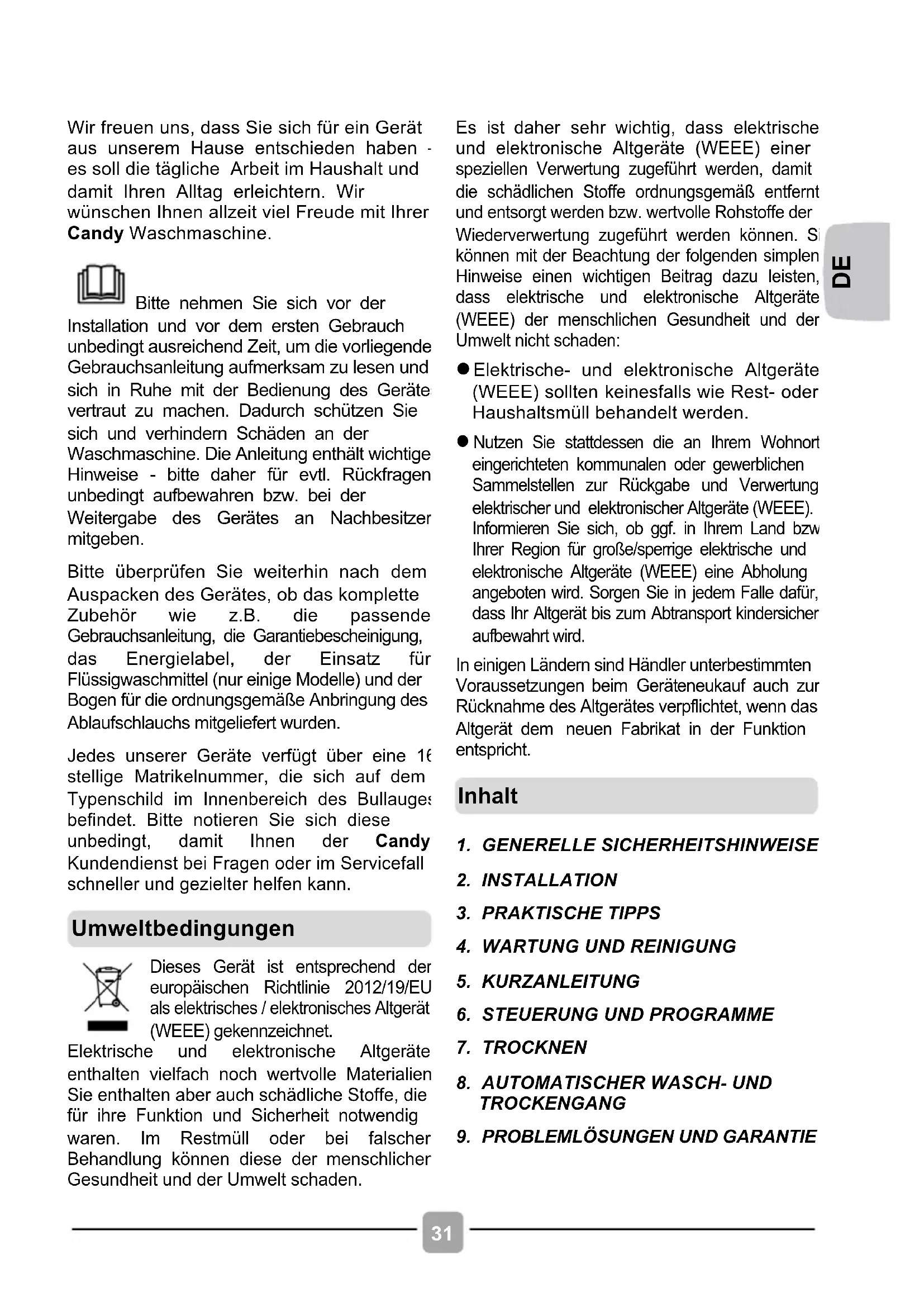Wir freuen uns, dass Sie sich für ein Gerät aus unserem Hause entschieden haben – es soll die tägliche Arbeit im Haushalt und damit Ihren Alltag erleichtern. Wir wünschen Ihnen allzeit viel Freude mit Ihrer Candy Waschmaschine. Bitte nehmen Sie sich vor der Installation und vor dem ersten Gebrauch unbedingt ausreichend Zeit, um die vorliegende Gebrauchsanleitung aufmerksam zu lesen und sich in Ruhe mit der Bedienung des Gerätes vertraut zu machen. Dadurch schützen Sie sich und verhindern Schäden an der Waschmaschine. Die Anleitung enthält wichtige Hinweise - bitte daher für evtl. Rückfragen unbedingt aufbewahren bzw. bei der Weitergabe des Gerätes an Nachbesitzer mitgeben. Bitte überprüfen Sie weiterhin nach dem Auspacken des Gerätes, ob das komplette Zubehör wie z.B. die passende Gebrauchsanleitung, die Garantiebescheinigung, das Energielabel, der Einsatz für Flüssigwaschmittel (nur einige Modelle) und der Bogen für die ordnungsgemäße Anbringung des Ablaufschlauchs mitgeliefert wurden. Jedes unserer Geräte verfügt über eine 16- stellige Matrikelnummer, die sich auf dem Typenschild im Innenbereich des Bullauges befindet. Bitte notieren Sie sich diese unbedingt, damit Ihnen der Candy Kundendienst bei Fragen oder im Servicefall schneller und gezielter helfen kann.