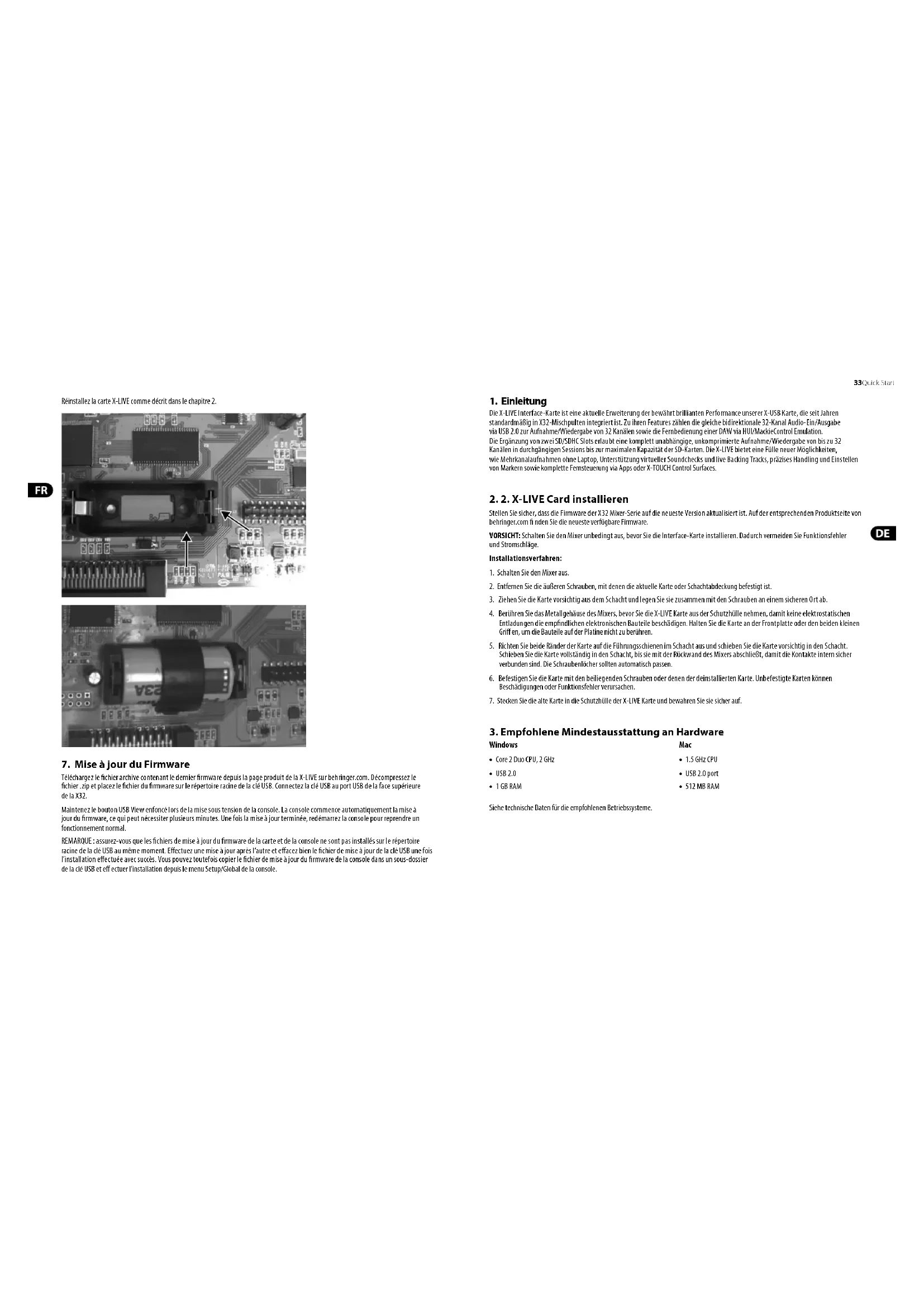 - 512 MB RAM Siehe technische Daten für die empfohlenen Betriebssysteme. 33Quick Start Guide32 X-LIVE4. USB-Betrieb Die USB-Verbindung der X-LIVE Karte bietet 32 Kanäle an bidirektionaler Audio-Ein/Ausgabe via USB 2.0 sowie MIDI-Ein/Ausgabe und DAW-Fernsteuerung via HUI/MackieControl Emulation. Wenn Sie einen Windows PC nutzen, sollten Sie unbedingt den gratis ASIO-Treiber von behringer.com herunterladen und installieren. Die X-LIVE ist CoreAudio-konform und benötigt bei Mac-Computern keine Treiber.