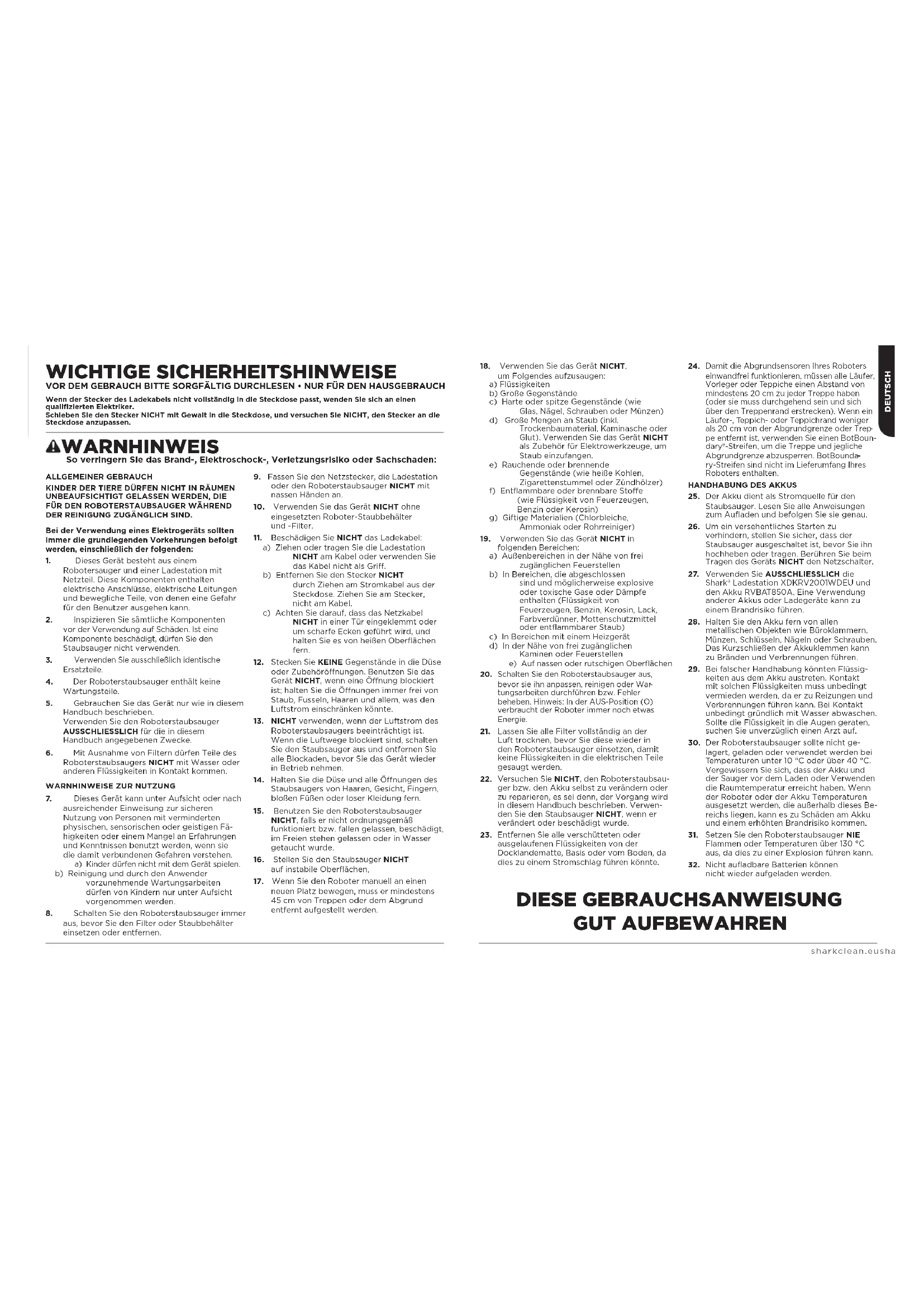 ISTRUZIONI sharkclean.eusharkclean.eusharkclean.eu WARNHINWEIS So verringern Sie das Brand-, Elektroschock-, Verletzungsrisiko oder Sachschaden: WICHTIGE SICHERHEITSHINWEISE VOR DEM GEBRAUCH BITTE SORGFÄLTIG DURCHLESEN • NUR FÜR DEN HAUSGEBRAUCH Wenn der Stecker des Ladekabels nicht vollständig in die Steckdose passt, wenden Sie sich an einen qualifizierten Elektriker. Schieben Sie den Stecker NICHT mit Gewalt in die Steckdose, und versuchen Sie NICHT, den Stecker an die Steckdose anzupassen. ALLGEMEINER GEBRAUCH KINDER DER TIERE DÜRFEN NICHT IN RÄUMEN