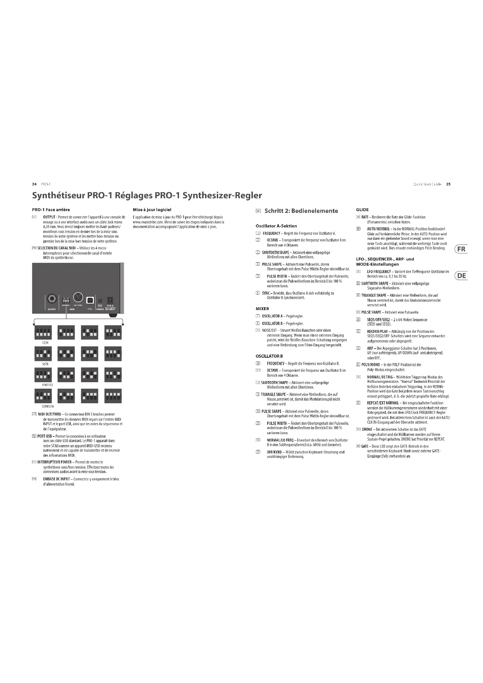 Synthétiseur PRO-1 Réglages PRO-1 Synthesizer-Regler (DE) Schritt 2: Bedienelemente Oscillator A-Sektion (1) FREQUENCY – Regelt die Frequenz von Oszillator A. (2) OCTAVE – Transponiert die Frequenz von Oszillator A im Bereich von 4 Oktaven. (3) SAWTOOTH SHAPE – Aktiviert eine vollpegelige Wellenform mit allen Obertönen. (4) PULSE SHAPE – Aktiviert eine Pulswelle, deren Obertongehalt mit dem Pulse Width-Regler einstellbar ist. (5) PULSE WIDTH – Ändert den Obertongehalt der Pulswelle, wobei man die Pulswellenform im Bereich 0 bis 100 % variieren kann. (6) SYNC – Bewirkt, dass Oszillator A sich vollständig zu Oszillator B synchronisiert. MIXER (7) OSCILLATOR A – Pegelregler. (8) OSCILLATOR B – Pegelregler. (9) NOISE/EXT – Steuert Weißes Rauschen oder einen externen Eingang. Wenn man einen externen Eingang patcht, wird die Weißes Rauschen-Schaltung umgangen und eine Verbindung zum Filter-Eingang hergestellt. OSCILLATOR B (10) FREQUENCY – Regelt die Frequenz von Oszillator B. (11) OCTAVE – Transponiert die Frequenz von Oszillator B im Bereich von 4 Oktaven. (12) SAWTOOTH SHAPE – Aktiviert eine vollpegelige Wellenform mit allen Obertönen. (13) TRIANGLE SHAPE – Aktiviert eine Wellenform, die auf Masse zentriert ist, damit das Modulationsziel nicht versetzt wird. (14) PULSE SHAPE – Aktiviert eine Pulswelle, deren Obertongehalt mit dem Pulse Width-Regler einstellbar ist. (15) PULSE WIDTH – Ändert den Obertongehalt der Pulswelle, wobei man die Pulswellenform im Bereich 0 bis 100 % variieren kann. (16) NORMAL/LO FREQ – Erweitert den Bereich von Oszillator B in den Subfrequenzbereich (ca. 60 Hz und darunter). (17) OFF/KYBD – Wählt zwischen Keyboard-Steuerung und unabhängiger Bedienung. GLIDE (18) RATE – Bestimmt die Rate der Glide-Funktion (Portamento) zwischen Noten. (19) AUTO/NORMAL – In der NORMAL-Position funktioniert Glide auf herkömmliche Weise. In der AUTO-Position wird nur dann ein gleitender Sound erzeugt, wenn man eine neue Taste anschlägt, während die vorherige Taste noch gedrückt wird. Dies erlaubt einhändiges Pitch Bending. LFO-, SEQUENCER-, ARP- und MODE-Einstellungen (20) LFO FREQUENCY – Variiert den Tierequenz-Oszillator im Bereich von ca. 0,1 bis 30 Hz. (21) SAWTOOTH SHAPE – Aktiviert eine vollpegelige Sägezahn-Wellenform. (22) TRIANGLE SHAPE – Aktiviert eine Wellenform, die auf Masse zentriert ist, damit das Modulationsziel nicht versetzt wird. (23) PULSE SHAPE – Aktiviert eine Pulswelle. (24) SEQ1/OFF/SEQ2 – 2 x 64-Noten Sequencer (SEQ1 und SEQ2). (25) RECORD/PLAY – Abhängig von der Position des SEQ1/SEQ2/OFF-Schalters wird eine Sequenz entweder aufgenommen oder abgespielt. (26) ARP – Der Arpeggiator-Schalter hat 3 Positionen, UP (nur aufsteigend), UP/DOWN (auf- und absteigend) oder OFF. (27) POLY/MONO – In der POLY-Position ist der Poly-Modus eingeschaltet. (28) NORMAL/RETRIG – Wählt den Triggering-Modus des Hüllkurvengenerators. “Normal” bedeutet Priorität der tiefsten Note bei einfachem Triggering. In der RETRIG- Position wird das Gate bei jedem neuen Tastenanschlag erneut getriggert, d. h. die zuletzt gespielte Note erklingt. (29) REPEAT/EXT NORMAL – Bei eingeschalteter Funktion werden die Hüllkurvengeneratoren wiederholt mit einer Rate gegated, die mit dem LFO/Clock FREQUENCY-Regler gesteuert wird. Bei aktiviertem Schalter ist auch der GATE/ CLK IN-Eingang auf der Oberseite aktiviert. (30) DRONE – Bei aktiviertem Schalter ist das GATE eingeschaltet und die Hüllkurven werden auf ihrem Sustain-Pegel gehalten. DRONE hat Priorität vor REPEAT. (31) GATE – Diese LED zeigt den GATE-Betrieb in den verschiedenen Keyboard-Modi sowie externe GATE- Eingänge (falls vorhanden) an. 24 25Quick Start GuidePRO -1PRO-1 Rückseite (73) OUTPUT – Zum Anschließen eines Mixers oder Audio- Interfaces über ein 6,3 mm Mono-Klinkenkabel. Beim Einschalten des Systems sollte man die Monitore/ Lautsprecher zuletzt einschalten und diese beim Ausschalten des Systems zuerst ausschalten. (74) MIDI-KANALWAHL – Verschieben Sie die vier DIP-Schalter, um den eingehenden MIDI-Kanal für den Synthesizer zu wählen. (75) MIDI OUT/THRU – Über diesen 5-Pol MIDI DIN-Port werden die über den MIDI-Eingang und USB-Eingang empfangenen MIDI-Daten sowie Sequencer- und Arpeggiator-Noten weitergeleitet. (76) USB PORT – Zum Anschließen eines Computers über ein standard USB-Kabel. Der PRO-1 wird in Ihrer DAW als standardkonformes USB MIDI-Gerät angezeigt, das MIDI- Informationen senden und empfangen kann. (77) POWER-SCHALTER – Schaltet den Synthesizer ein und aus. Vor dem Einschalten sollten Sie alle Audioverbindungen hergestellt haben. (78) NETZANSCHLUSS – Schließen Sie hier nur das mitgelieferte Netzteil an. Software-Updates Auf www.musictribe.com können Sie den PRO-1 Updater herunterladen. Gehen Sie bitte schrittweise nach den im Update enthaltenen Versionshinweisen vor.