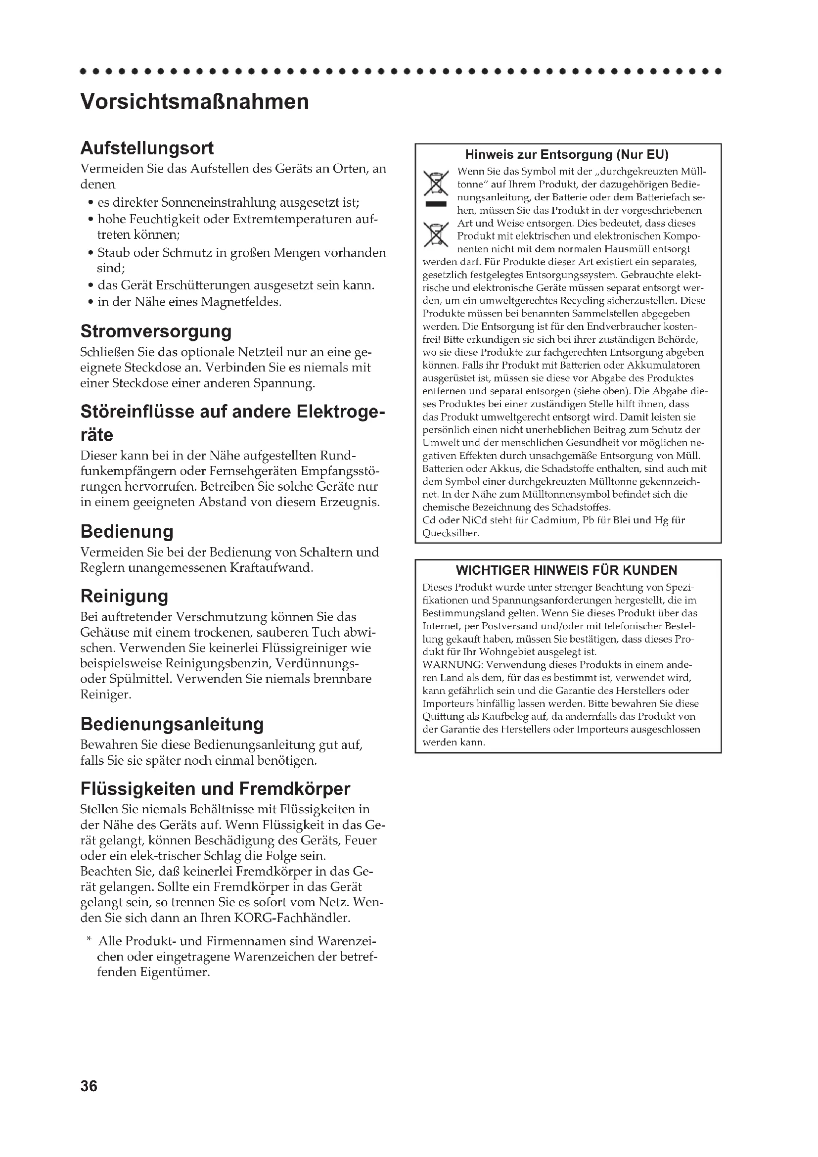 - in der Nähe eines Magnetfeldes. Stromversorgung Sließen Sie das optionale Netzteil nur an eine ge- eignete Steckdose an. Verbinden Sie es niemals mit einer Stedose einer anderen Spannung. Störeinüsse auf andere Elektroge- räte Dieser kann bei in der Nähe aufgestellten Rund- funkempfängern oder Fernsehgeräten Empfangsstö- rungen hervorrufen. Betreiben Sie sole Geräte nur in einem geeigneten Abstand von diesem Erzeugnis. Bedienung Vermeiden Sie bei der Bedienung von Saltern und Reglern unangemessenen Kraaufwand. Reinigung Bei auftretender Verschmutzung können Sie das Gehäuse mit einem troenen, sauberen Tu abwi- schen. Verwenden Sie keinerlei Flüssigreiniger wie beispielsweise Reinigungsbenzin, Verdünnungs- oder Spülmittel. Verwenden Sie niemals brennbare Reiniger. Bedienungsanleitung Bewahren Sie diese Bedienungsanleitung gut auf, falls Sie sie später no einmal benötigen. Flüssigkeiten und Fremdkörper Stellen Sie niemals Behältnisse mit Flüssigkeiten in der Nähe des Geräts auf. Wenn Flüssigkeit in das Ge- rät gelangt, können Besädigung des Geräts, Feuer oder ein elek-triser Slag die Folge sein. Beachten Sie, daß keinerlei Fremdkörper in das Ge- rät gelangen. Sollte ein Fremdkörper in das Gerät gelangt sein, so trennen Sie es sofort vom Netz. Wen- den Sie si dann an Ihren KORG-Fahändler.