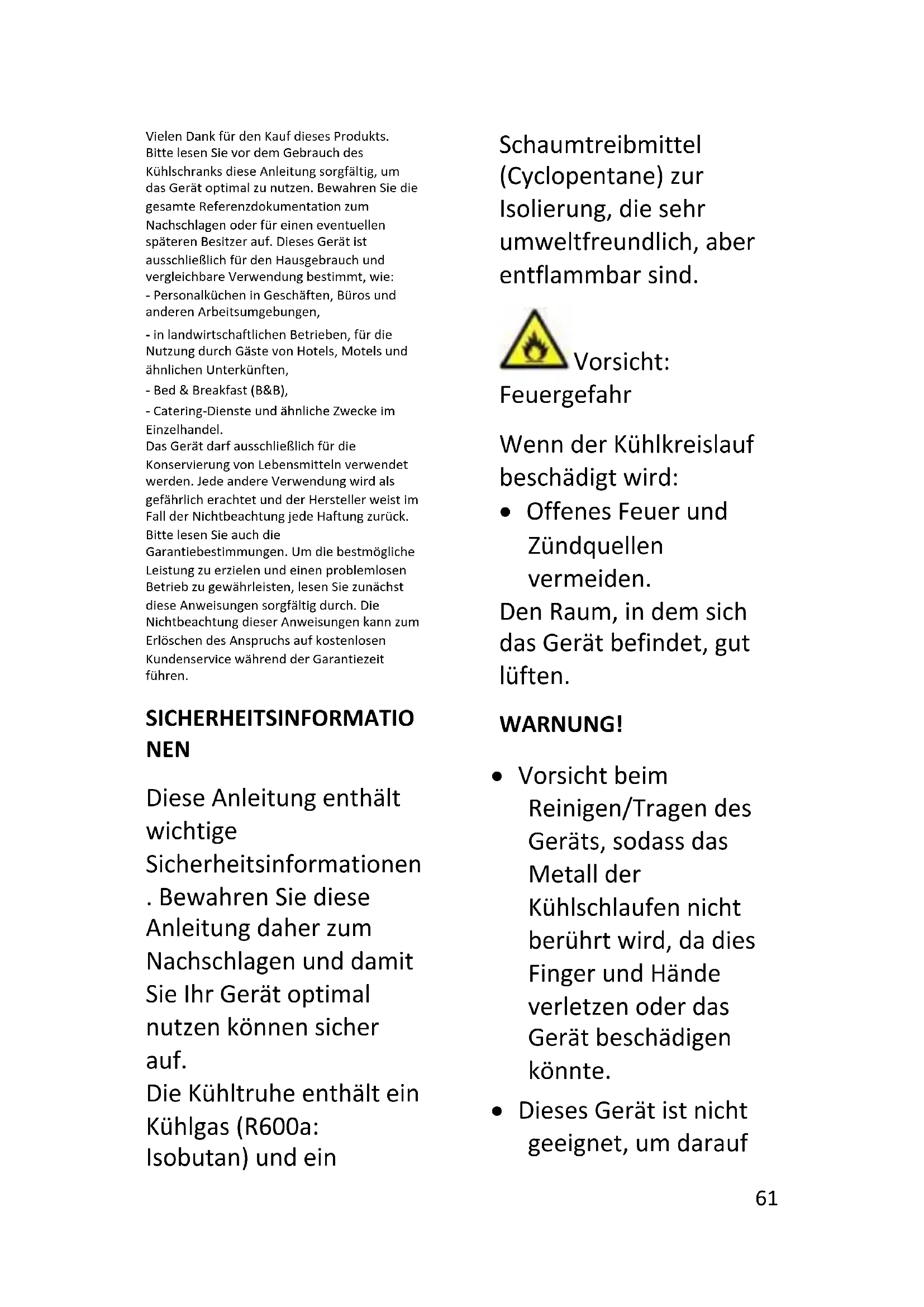 - Eliminar el polvo presente en la parte posterior del electrodoméstico.61 Vielen Dank für den Kauf dieses Produkts. Bitte lesen Sie vor dem Gebrauch des Kühlschranks diese Anleitung sorgfältig, um das Gerät optimal zu nutzen. Bewahren Sie die gesamte Referenzdokumentation zum Nachschlagen oder für einen eventuellen späteren Besitzer auf. Dieses Gerät ist ausschließlich für den Hausgebrauch und vergleichbare Verwendung bestimmt, wie: - Personalküchen in Geschäften, Büros und anderen Arbeitsumgebungen, - in landwirtschaftlichen Betrieben, für die Nutzung durch Gäste von Hotels, Motels und ähnlichen Unterkünften, - Bed & Breakfast (B&B), - Catering-Dienste und ähnliche Zwecke im Einzelhandel. Das Gerät darf ausschließlich für die Konservierung von Lebensmitteln verwendet werden. Jede andere Verwendung wird als gefährlich erachtet und der Hersteller weist im Fall der Nichtbeachtung jede Haftung zurück. Bitte lesen Sie auch die Garantiebestimmungen. Um die bestmögliche Leistung zu erzielen und einen problemlosen Betrieb zu gewährleisten, lesen Sie zunächst diese Anweisungen sorgfältig durch. Die Nichtbeachtung dieser Anweisungen kann zum Erlöschen des Anspruchs auf kostenlosen Kundenservice während der Garantiezeit führen. SICHERHEITSINFORMATIO NEN Diese Anleitung enthält wichtige Sicherheitsinformationen . Bewahren Sie diese Anleitung daher zum Nachschlagen und damit Sie Ihr Gerät optimal nutzen können sicher auf. Die Kühltruhe enthält ein Kühlgas (R600a: Isobutan) und ein Schaumtreibmittel (Cyclopentane) zur Isolierung, die sehr umweltfreundlich, aber entflammbar sind. Vorsicht: Feuergefahr Wenn der Kühlkreislauf beschädigt wird: