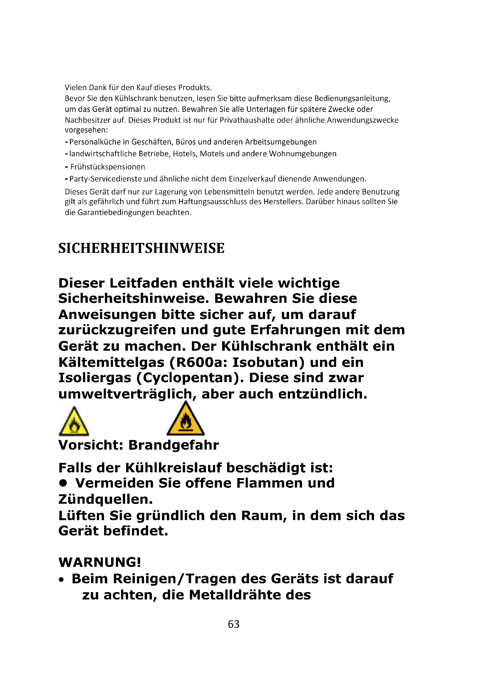 - Falls das Gerät über einen längeren Zeitraum leer bleibt, schalten Sie es aus, tauen es ab, reinigen und trocknen es, und lassen dann die Tür offen, um Schimmelbildung im Gerät zu vermeiden. WARNUNG! Beachten Sie beim Gebrauch, bei Instandhaltungsmaßnahmen und bei der Entsorgung bitte das Symbol auf der Geräterückseite (Rückwand oder Kompressor). Dieses Symbol weist auf eine potenzielle Brandgefahr hin. In den Kühlleitungen und im Kompressor befinden sich brennbare Stoffe.72 Achten Sie beim Gebrauch, bei Instandhaltungsmaßnahmen und bei der Entsorgung auf ausreichenden Abstand zu Feuerquellen.