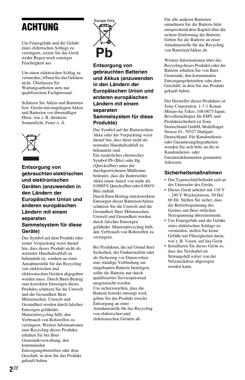 Télécommande 9, 11 THEATER 10, 30 Touches de couleur 9 « Type TV » 20 33FR Für alle anderen Batterien entnehmen Sie die Batterie bitte entsprechend dem Kapitel über die sichere Entfernung der Batterie. Geben Sie die Batterie an einer Annahmestelle für das Recycling von Batterien/Akkus ab. ACHTUNG Um Feuergefahr und die Gefahr eines elektrischen Schlags zu verringern, setzen Sie das Gerät weder Regen noch sonstiger Feuchtigkeit aus. Um einen elektrischen Schlag zu vermeiden, öffnen Sie das Gehäuse nicht. Überlassen Sie Wartungsarbeiten stets nur qualifiziertem Fachpersonal. Schützen Sie Akkus und Batterien bzw. Geräte mit eingelegten Akkus und Batterien vor übermäßiger Hitze, wie z. B. direktem Sonnenlicht, Feuer o. Ä. Entsorgung von gebrauchten elektrischen und elektronischen Geräten (anzuwenden in den Ländern der Europäischen Union und anderen europäischen Ländern mit einem separaten Sammelsystem für diese Geräte) Das Symbol auf dem Produkt oder seiner Verpackung weist darauf hin, dass dieses Produkt nicht als normaler Haushaltsabfall zu behandeln ist, sondern an einer Annahmestelle für das Recycling von elektrischen und elektronischen Geräten abgegeben werden muss. Durch Ihren Beitrag zum korrekten Entsorgen dieses Produkts schützen Sie die Umwelt und die Gesundheit Ihrer Mitmenschen. Umwelt und Gesundheit werden durch falsches Entsorgen gefährdet. Materialrecycling hilft, den Verbrauch von Rohstoffen zu verringern. Weitere Informationen zum Recycling dieses Produkts erhalten Sie bei Ihrer Gemeindeverwaltung, den kommunalen Entsorgungsbetrieben oder dem Geschäft, in dem Sie das Produkt gekauft haben. 2DE Entsorgung von gebrauchten Batterien und Akkus (anzuwenden in den Ländern der Europäischen Union und anderen europäischen Ländern mit einem separaten Sammelsystem für diese Produkte) Das Symbol auf der Batterie/dem Akku oder der Verpackung weist darauf hin, dass diese nicht als normaler Haushaltsabfall zu behandeln sind. Ein zusätzliches chemisches Symbol Pb (Blei) oder Hg (Quecksilber) unter der durchgestrichenen Mülltonne bedeutet, dass die Batterie/der Akku einen Anteil von mehr als 0,0005% Quecksilber oder 0,004% Blei enthält. Durch Ihren Beitrag zum korrekten Entsorgen dieser Batterien/Akkus schützen Sie die Umwelt und die Gesundheit Ihrer Mitmenschen. Umwelt und Gesundheit werden durch falsches Entsorgen gefährdet. Materialrecycling hilft, den Verbrauch von Rohstoffen zu verringern. Bei Produkten, die auf Grund ihrer Sicherheit, der Funktionalität oder als Sicherung vor Datenverlust eine ständige Verbindung zur eingebauten Batterie benötigen, sollte die Batterie nur durch qualifiziertes Servicepersonal ausgetauscht werden. Um sicherzustellen, dass die Batterie korrekt entsorgt wird, geben Sie das Produkt zwecks Entsorgung an einer Annahmestelle für das Recycling von elektrischen und elektronischen Geräten ab. Weitere Informationen über das Recycling dieses Produkts oder der Batterie erhalten Sie von Ihrer Gemeinde, den kommunalen Entsorgungsbetrieben oder dem Geschäft, in dem Sie das Produkt gekauft haben. Der Hersteller dieses Produktes ist Sony Corporation, 1-7-1 Konan Minato-ku Tokio, 108-0075 Japan. Bevollmächtigter für EMV und Produktsicherheit ist Sony Deutschland GmbH, Hedelfinger Strasse 61, 70327 Stuttgart, Deutschland. Für Kundendienstoder Garantieangelegenheiten wenden Sie sich bitte an die in Kundendienst- oder Garantiedokumenten genannten Adressen. Sicherheitsmaßnahmen
