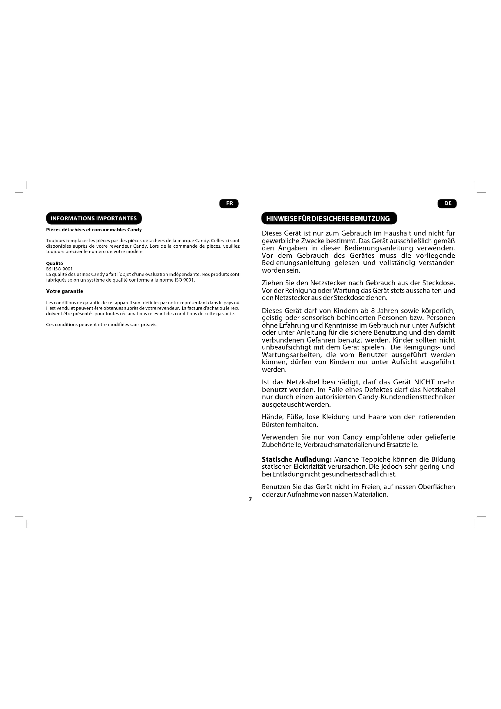 Dieses Gerät ist nur zum Gebrauch im Haushalt und nicht für gewerbliche Zwecke bestimmt. Das Gerät ausschließlich gemäß den Angaben in dieser Bedienungsanleitung verwenden. Vor dem Gebrauch des Gerätes muss die vorliegende Bedienungsanleitung gelesen und vollständig verstanden worden sein. Ziehen Sie den Netzstecker nach Gebrauch aus der Steckdose. Vor der Reinigung oder Wartung das Gerät stets ausschalten und den Netzstecker aus der Steckdose ziehen. Dieses Gerät darf von Kindern ab 8 Jahren sowie körperlich, geistig oder sensorisch behinderten Personen bzw. Personen ohne Erfahrung und Kenntnisse im Gebrauch nur unter Aufsicht oder unter Anleitung für die sichere Benutzung und den damit verbundenen Gefahren benutzt werden. Kinder sollten nicht unbeaufsichtigt mit dem Gerät spielen. Die Reinigungs- und Wartungsarbeiten, die vom Benutzer ausgeführt werden können, dürfen von Kindern nur unter Aufsicht ausgeführt werden. Ist das Netzkabel beschädigt, darf das Gerät NICHT mehr benutzt werden. Im Falle eines Defektes darf das Netzkabel nur durch einen autorisierten Candy-Kundendiensttechniker ausgetauscht werden. Hände, Füße, lose Kleidung und Haare von den rotierenden Bürsten fernhalten. Verwenden Sie nur von Candy empfohlene oder gelieferte Zubehörteile, Verbrauchsmaterialien und Ersatzteile. Statische Auadung: Manche Teppiche können die Bildung statischer Elektrizität verursachen. Die jedoch sehr gering und bei Entladung nicht gesundheitsschädlich ist. Benutzen Sie das Gerät nicht im Freien, auf nassen Oberächen oder zur Aufnahme von nassen Materialien.8