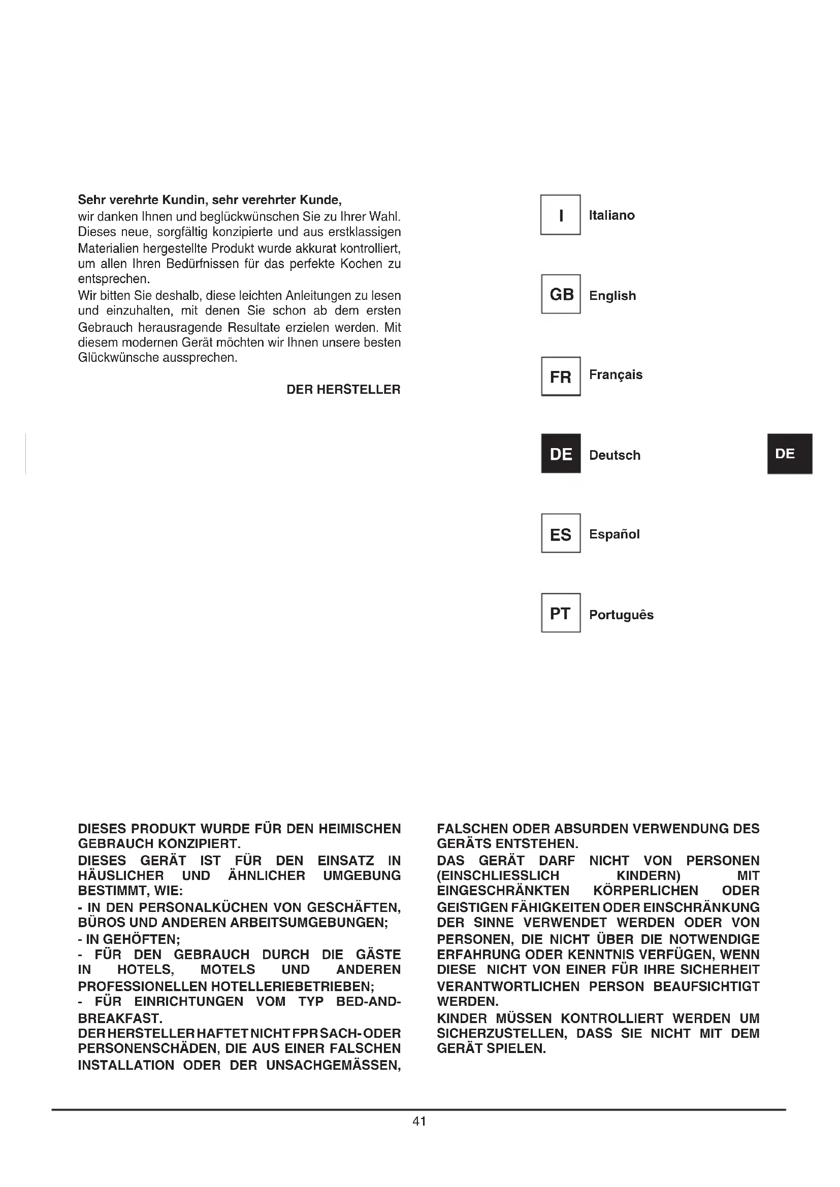 GERÄT SPIELEN. Sehr verehrte Kundin, sehr verehrter Kunde, wir danken Ihnen und beglückwünschen Sie zu Ihrer Wahl. Dieses neue, sorgfältig konzipierte und aus erstklassigen Materialien hergestellte Produkt wurde akkurat kontrolliert, um allen Ihren Bedürfnissen für das perfekte Kochen zu entsprechen. Wir bitten Sie deshalb, diese leichten Anleitungen zu lesen und einzuhalten, mit denen Sie schon ab dem ersten Gebrauch herausragende Resultate erzielen werden. Mit diesem modernen Gerät möchten wir Ihnen unsere besten Glückwünsche aussprechen. DER HERSTELLER Italiano