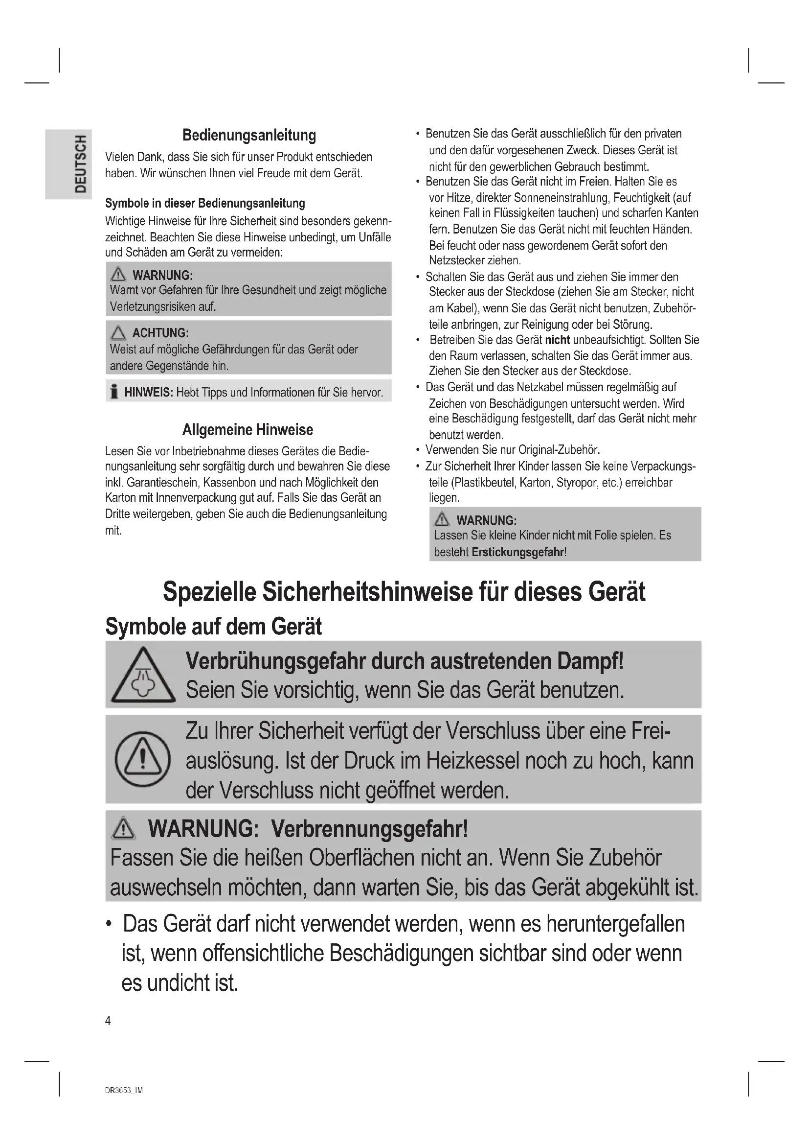 - Zur Sicherheit Ihrer Kinder lassen Sie keine Verpackungs- teile (Plastikbeutel, Karton, Styropor, etc.) erreichbar liegen. WARNUNG: Lassen Sie kleine Kinder nicht mit Folie spielen. Es besteht Erstickungsgefahr! Spezielle Sicherheitshinweise für dieses Gerät Symbole auf dem Gerät Verbrühungsgefahr durch austretenden Dampf! Seien Sie vorsichtig, wenn Sie das Gerät benutzen. Zu Ihrer Sicherheit verfügt der Verschluss über eine Frei- auslösung. Ist der Druck im Heizkessel noch zu hoch, kann der Verschluss nicht geöffnet werden. WARNUNG: Verbrennungsgefahr! Fassen Sie die heißen Oberächen nicht an. Wenn Sie Zubehör auswechseln möchten, dann warten Sie, bis das Gerät abgekühlt ist.