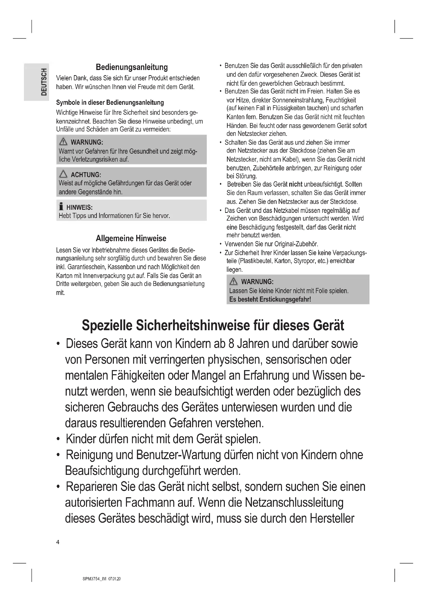 - Reparieren Sie das Gerät nicht selbst, sondern suchen Sie einen autorisierten Fachmann auf. Wenn die Netzanschlussleitung dieses Gerätes beschädigt wird, muss sie durch den Hersteller5 SPM3754_IM 07.01.20 oder seinen Kundendienst oder eine ähnlich qualizierte Person ersetzt werden, um Gefährdungen zu vermeiden.
