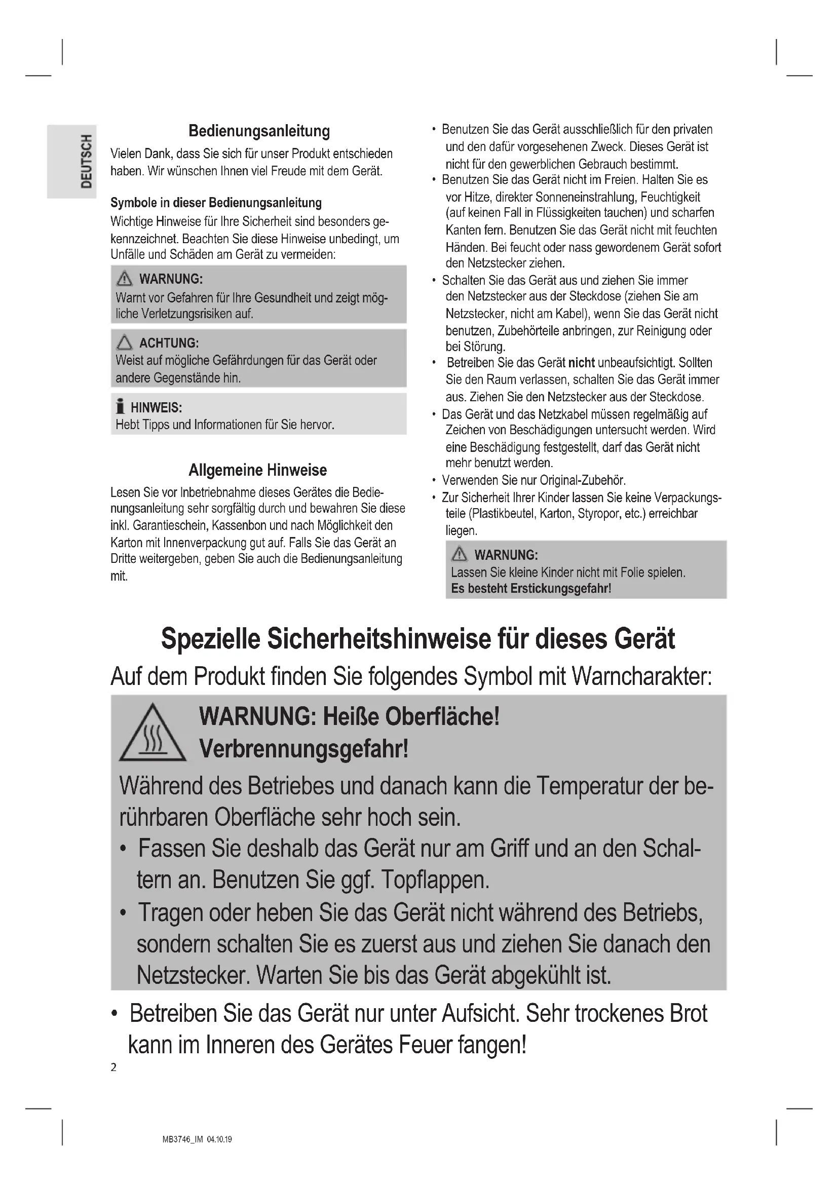 - Betreiben Sie das Gerät nur unter Aufsicht. Sehr trockenes Brot kann im Inneren des Gerätes Feuer fangen!3 MB3746_IM 04.10.19